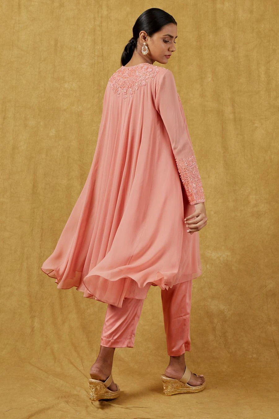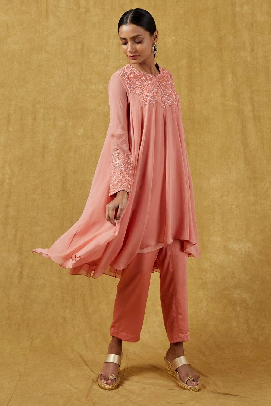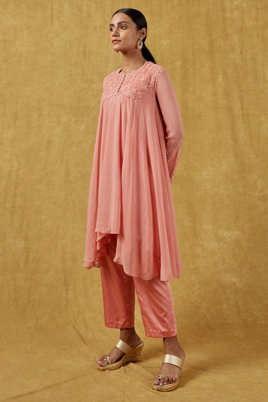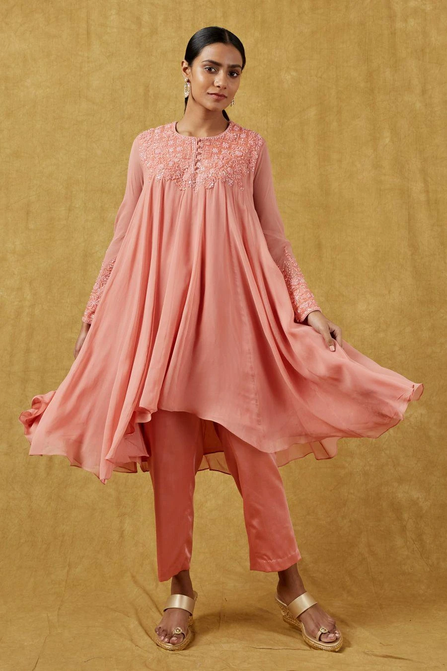 The perfect amalgamation of style and comfort, this kurta set works across occasions. Crafted in georgette, this set features a crystal embellished kurta and matching straight-fit pants. Add a pair of statement earrings to complete the look.