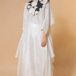 Elevate your wardrobe with this exquisite Off white cowl kurta paired with mashru silk asymmetric pants. The ensemble is beautifully accented with an embroidered collar, making it a perfect statement piece for any occasion.
