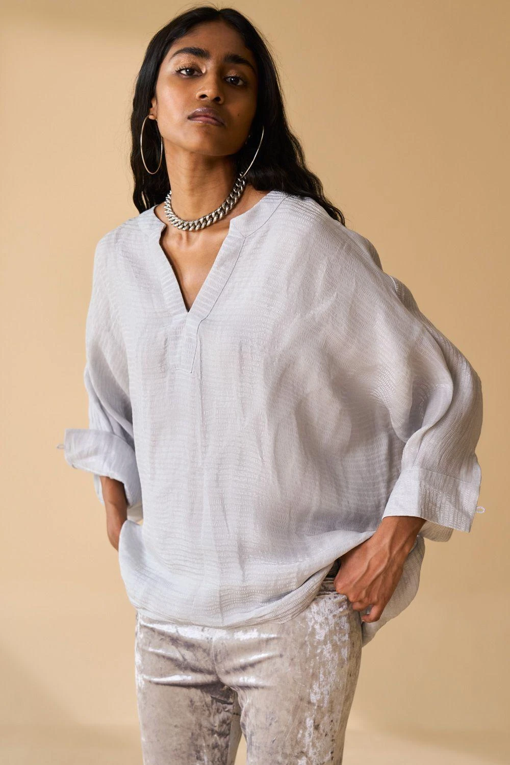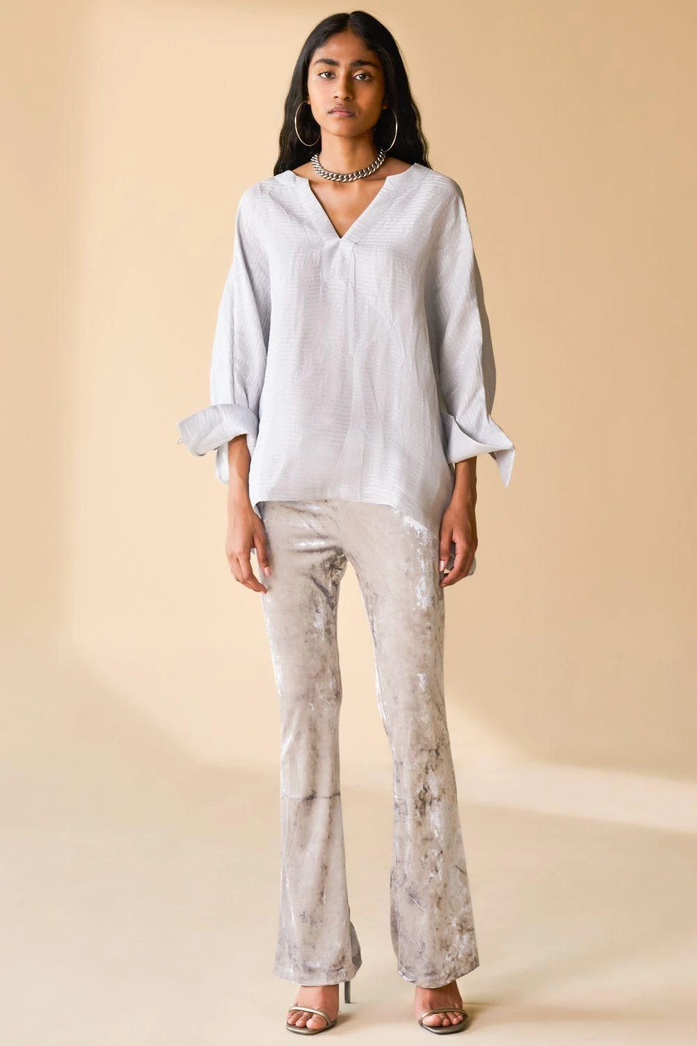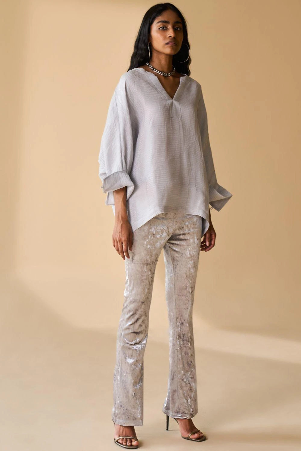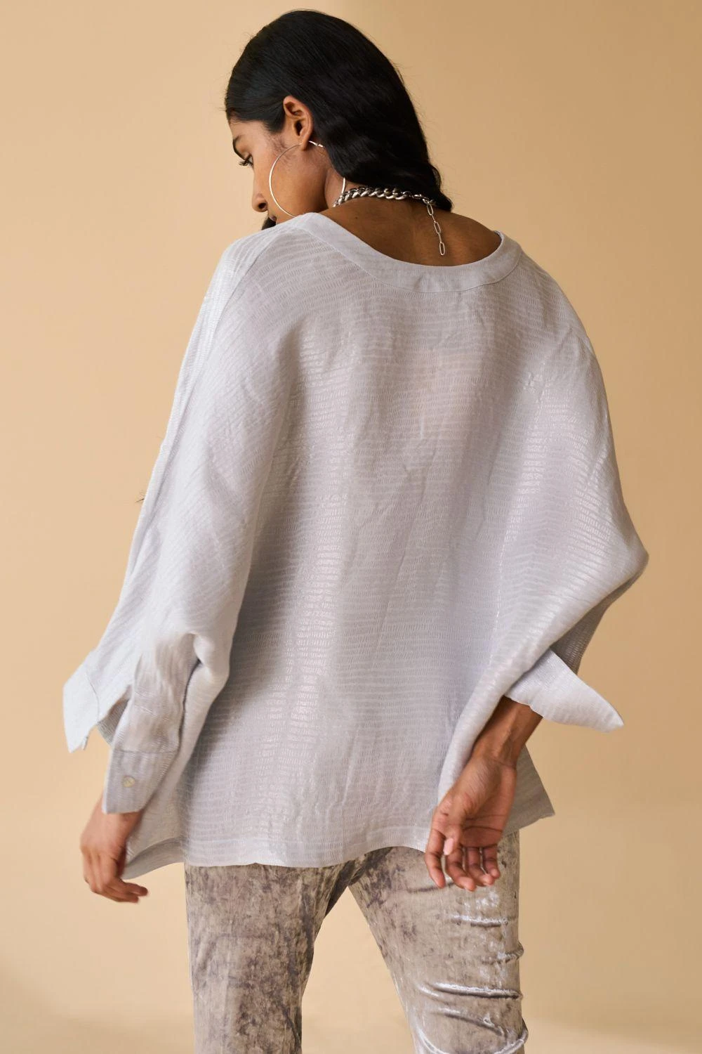 This short kaftan top in silver is the best bet for an effortless evening look. The metallic silk georgette is a one of a kind fabric that elevates the style of this short kaftan. Team it up with a skirt or pants, whatever suits your mood.