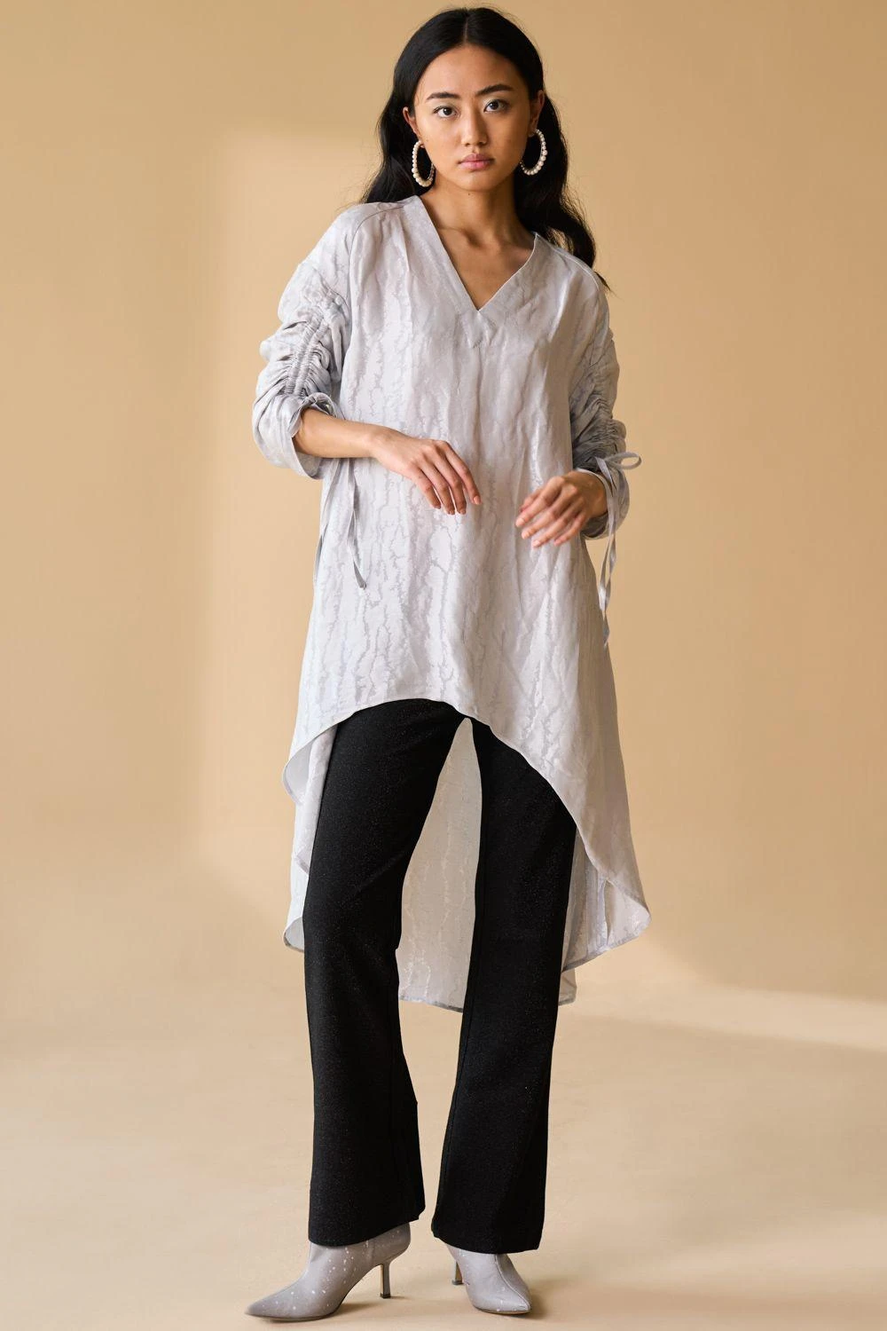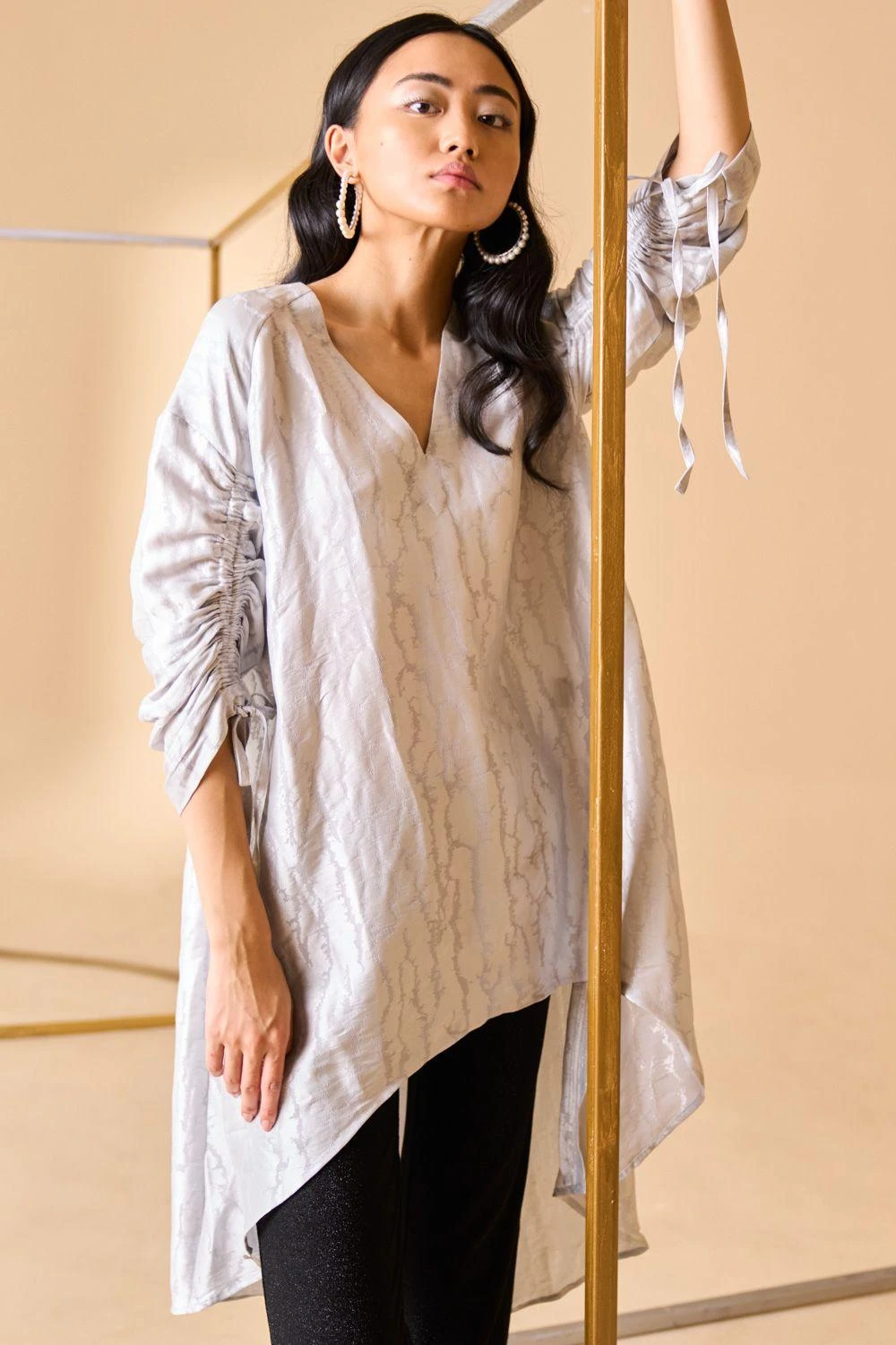 Ease and modernity come together in this bold & timeless silver asymmetric tunic. It is made in signature metallic silk georgette with statement sleeves. Style it with minimal jewellery and let your outfit shine.