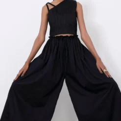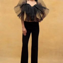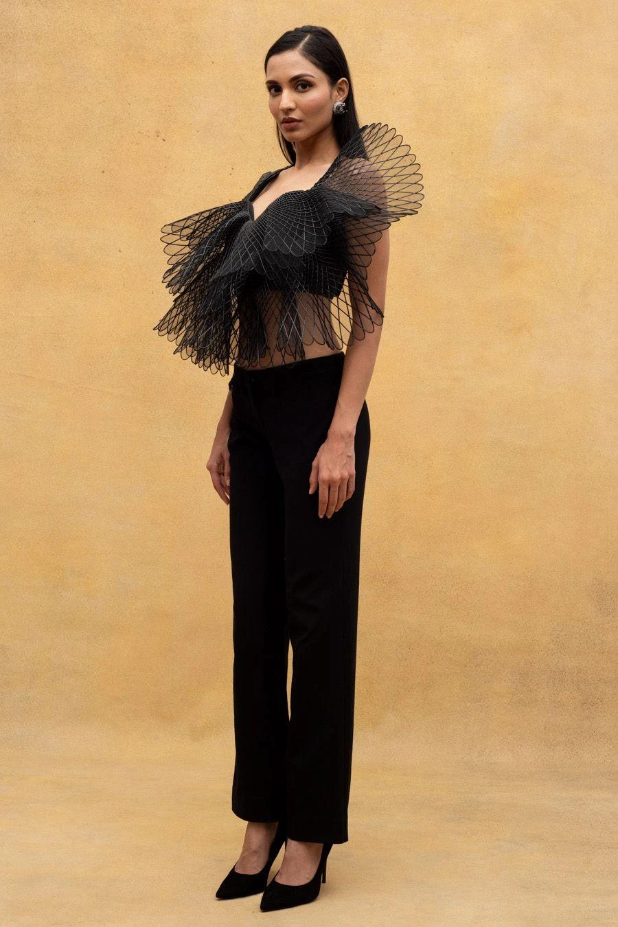 Crafted in hand woven metallic polymer, this beautifully & meticulously designed top inspired by the vivid, amorphous glowing marine forms has a lasting impression on the onlookers. Style it with a pair of flared pants to complete the set.