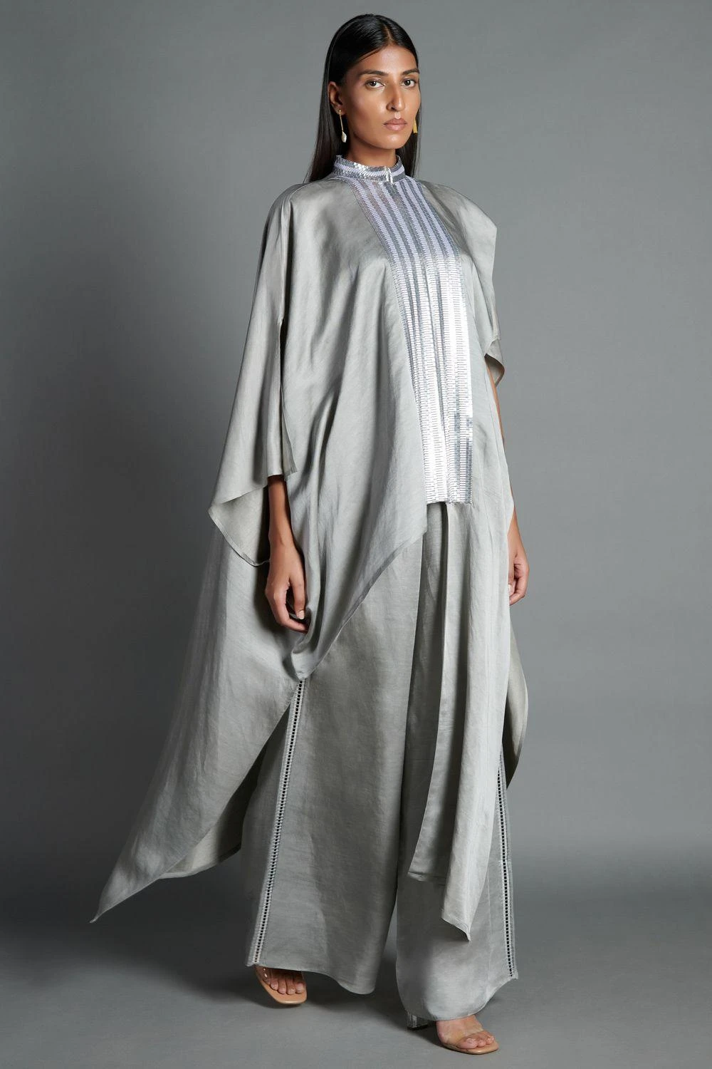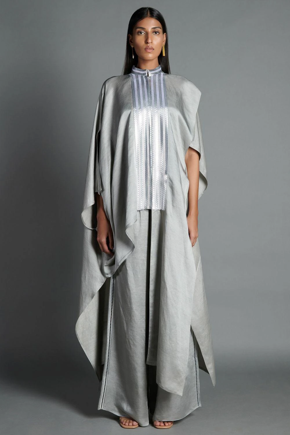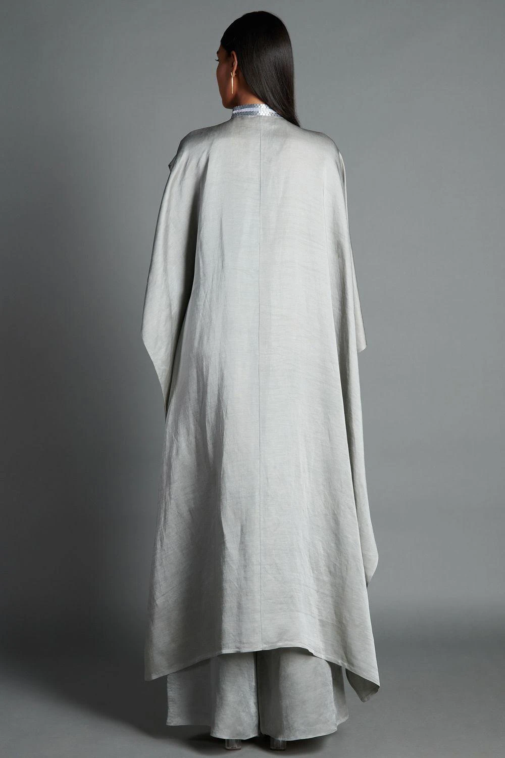 This handwoven asymmetric shirt is set in a silver linen satin. The metallic yoke & open sleeves add an inventive element to the elegant piece. Style this with palazzos or fitted trousers for dressy evening events.