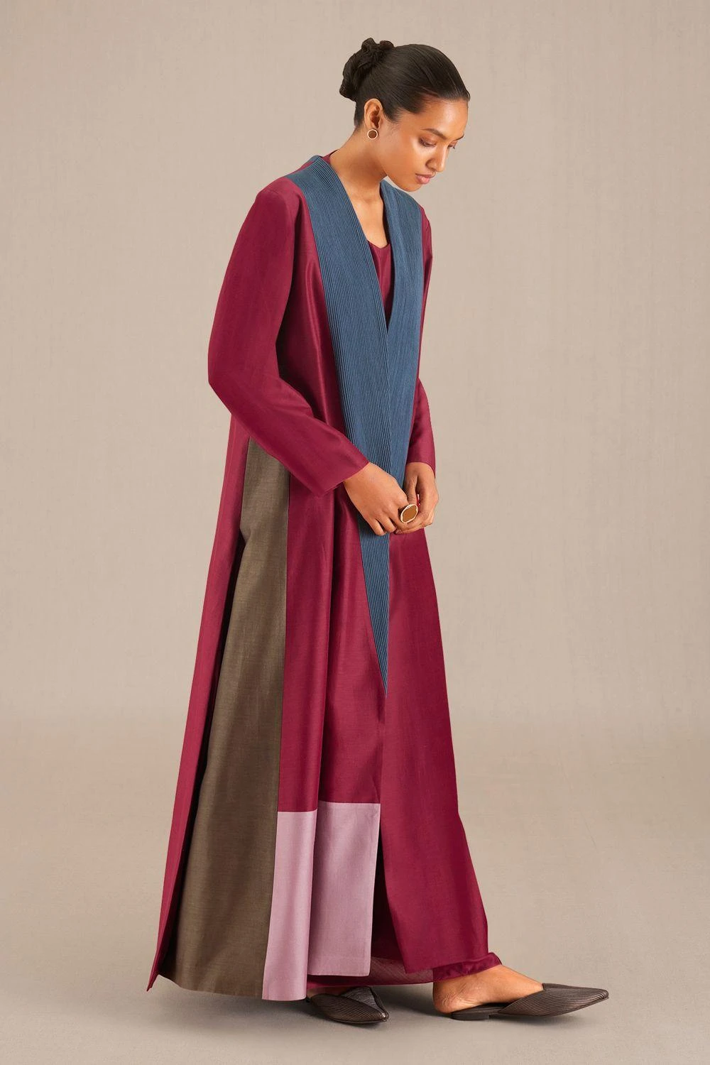 Experience serenity in the cotton-silk abaya, harmonizing mulberry, taupe & subtle pink hues. Paired with an inner, it is ideal for daytime events & cultural outings, making it a chic & comfortable choice, seamlessly blending style & ease.