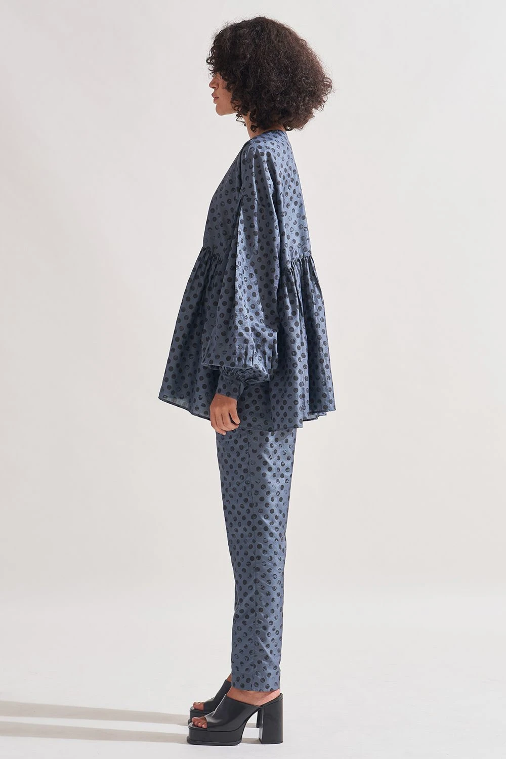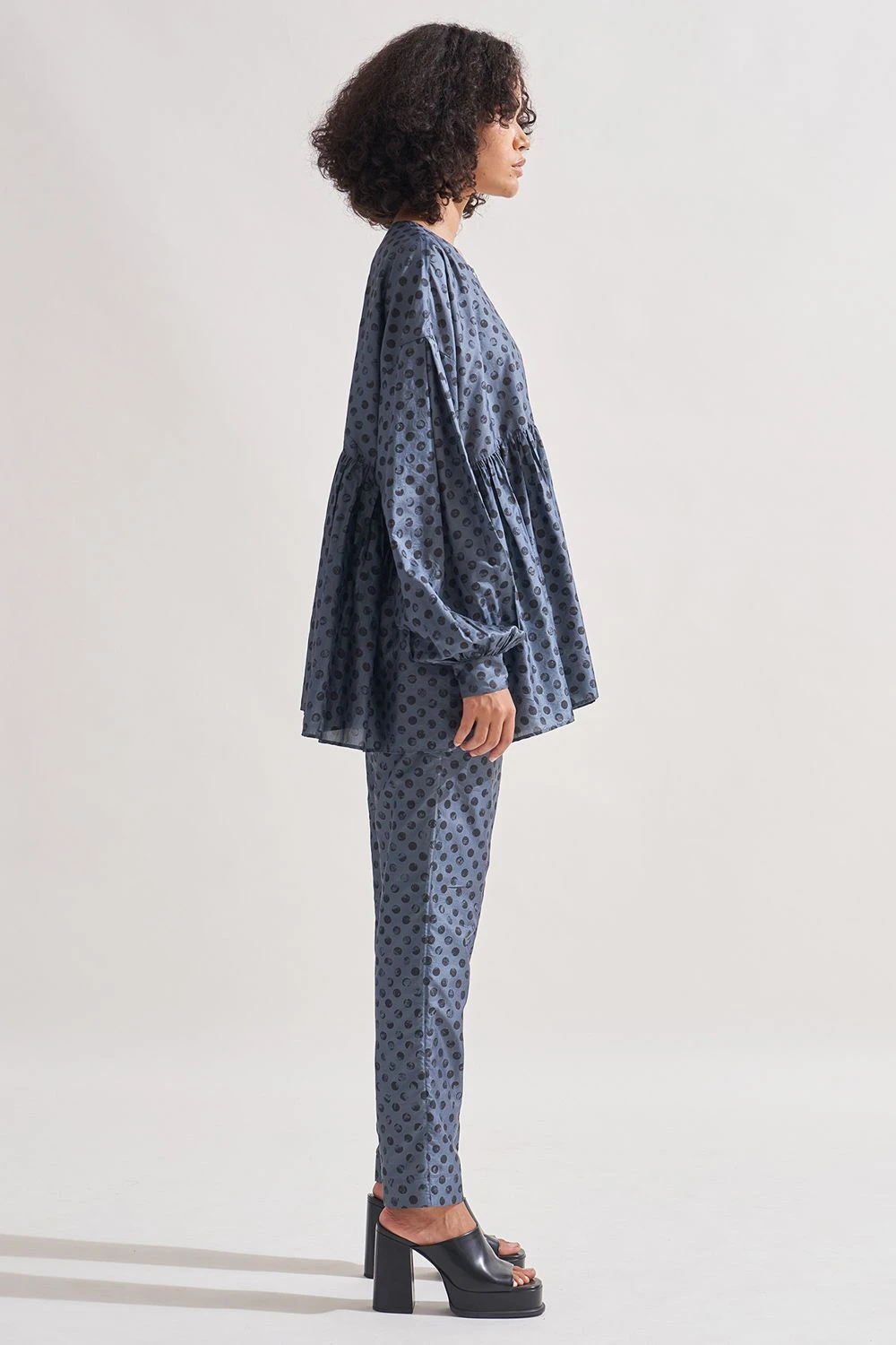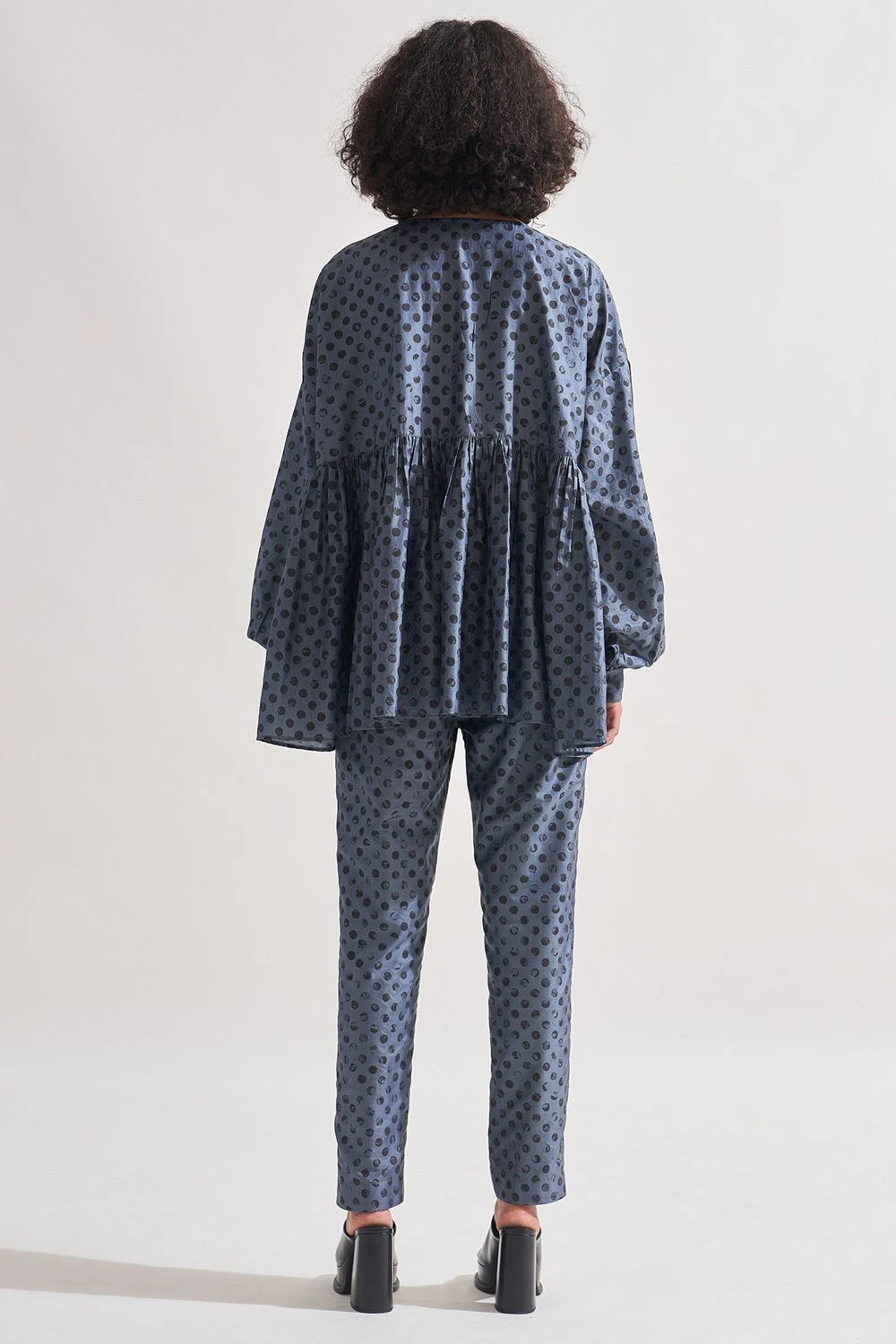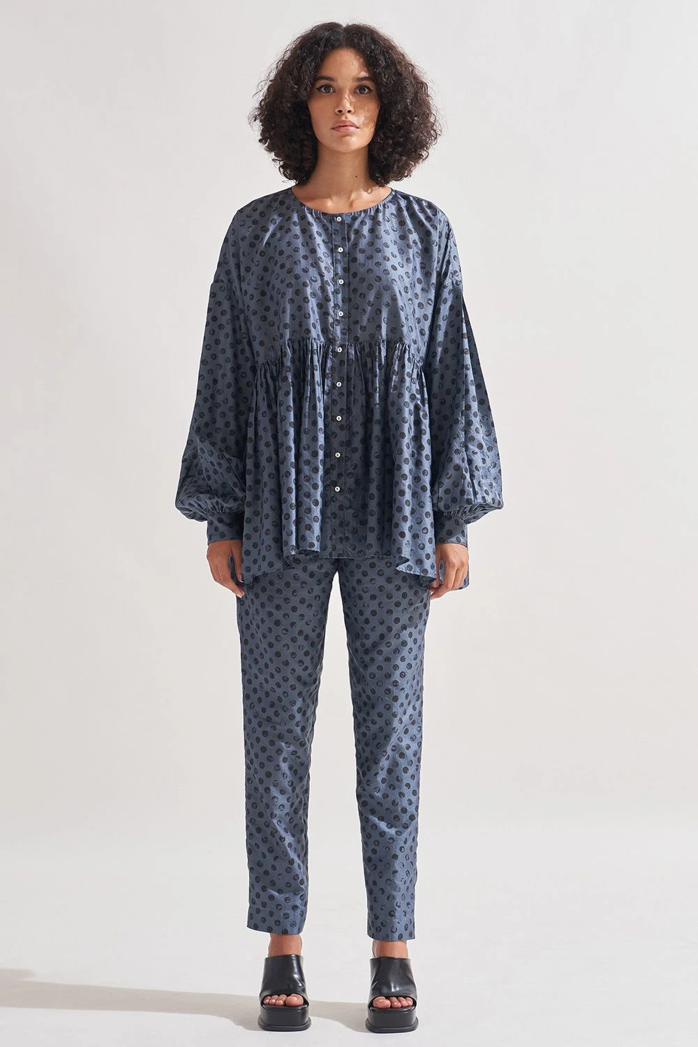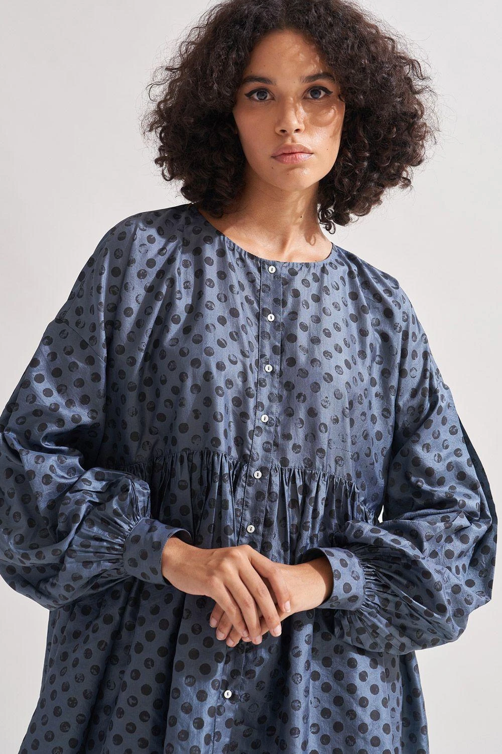 Indulge in the timeless elegance of this silk button-down tiered shirt. Adorned with hand-block polka dot print patterning, it exudes refined charm. The round neck and full bishop sleeves ending in button-down cuffs add a touch of sophistication.