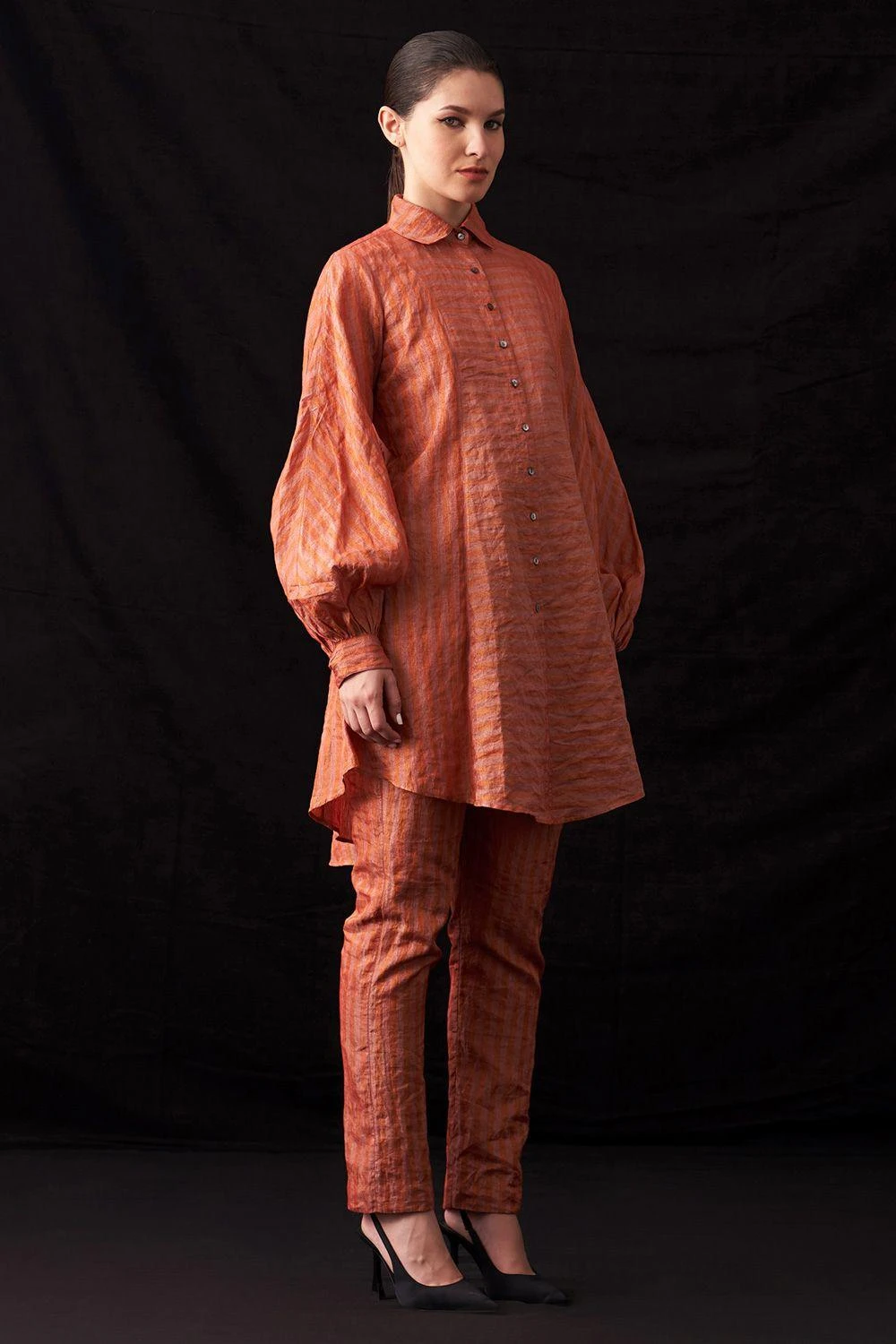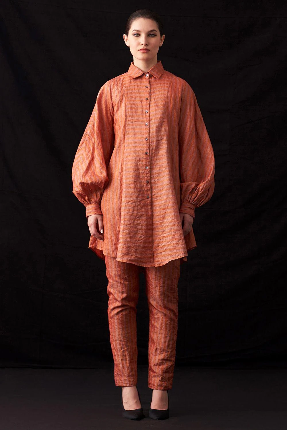 Dress in contemporary elegance with this coral red hand-woven cotton-zari metallic stripe, button-down shirt. Perfect for a seaside brunch or summer soirees, it combines style & comfort, making a statement at beach gatherings or casual chic events.
