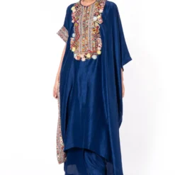 This festive blue kurta is adorned with intricate floral embroidery. The set is completed with a pair of matching draped cowl style skirt. Style this with jhumkas & a potli bag for a pre wedding function.