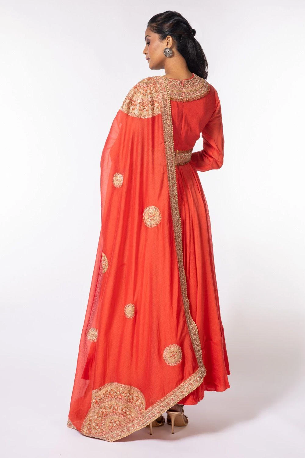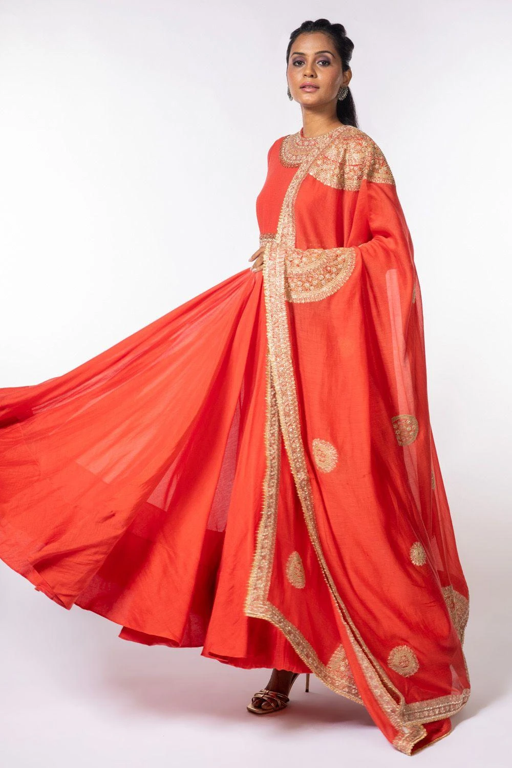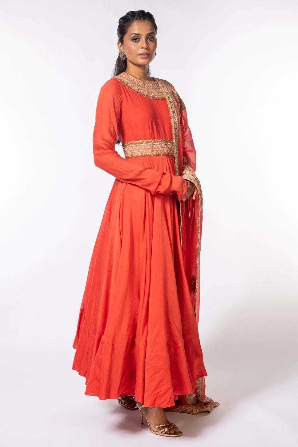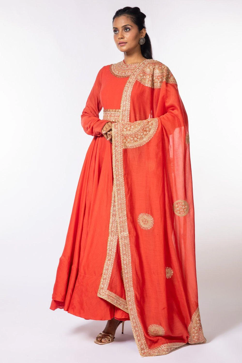 A festive wardrobe would not be complete without an anarkali. This elegant red anarkali set will make a perfect addition. It is woven in silk and enhanced with golden embroidery on the neck and below the bust. Style it with a maang tikka for a pooja.