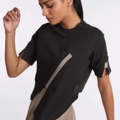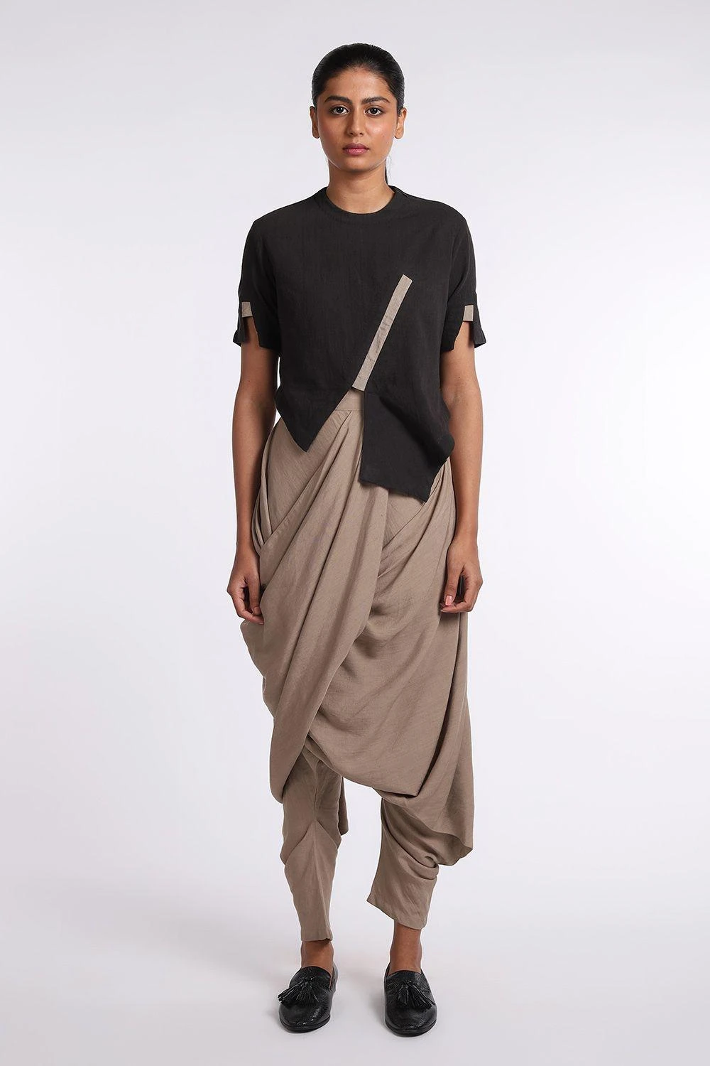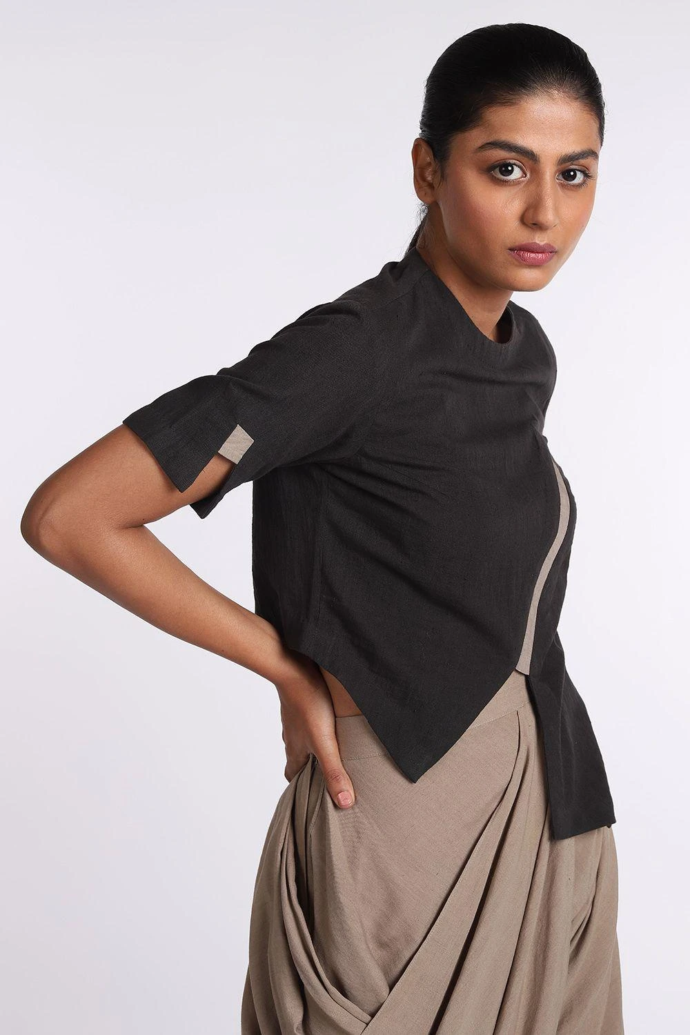 Meticulously created in handwoven cotton with an asymmetric hemline, this black top can be worn anytime, anywhere. We love the grey stripes that break the classic black!