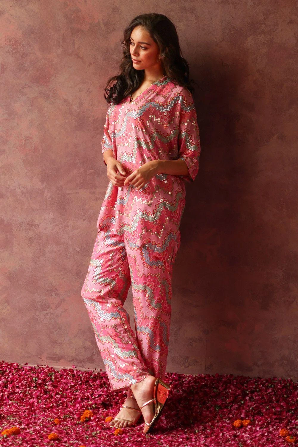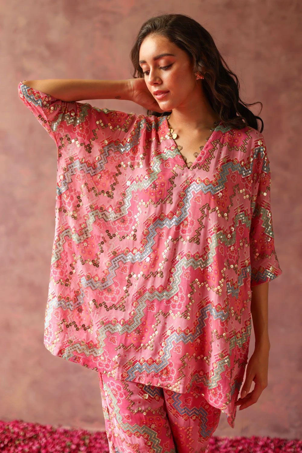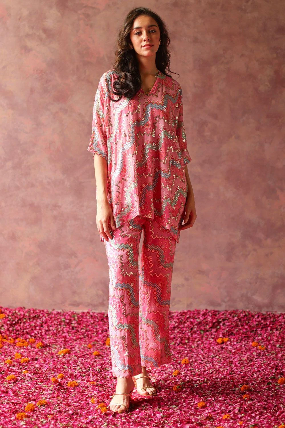 Crafted in georgette & adorned with sequins, the set exudes elegance and glamour. The kaftan features a mesmerising chevron pattern, enhanced with intricate sequin & traditional Sikka embroidery paired with coordinating pants.