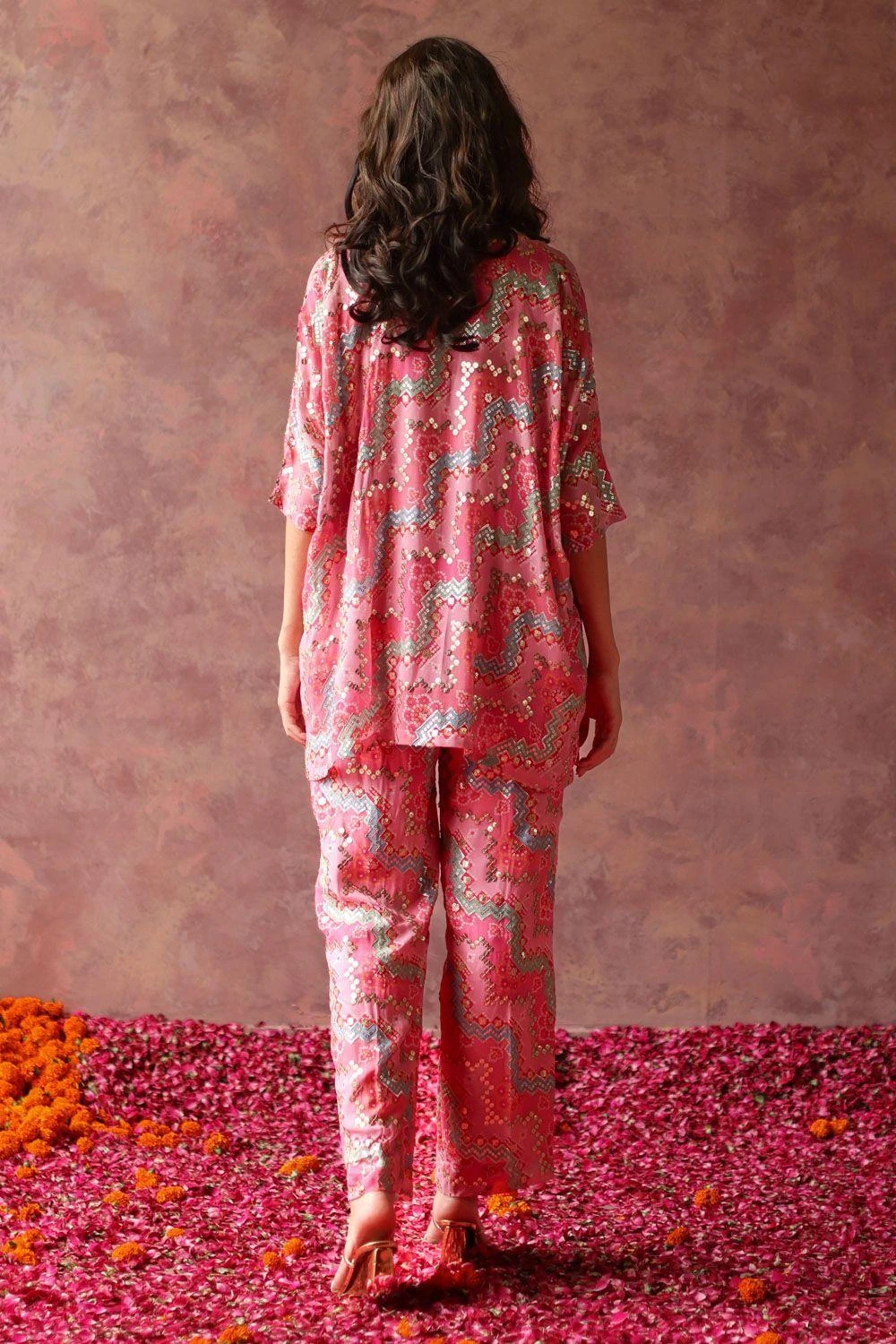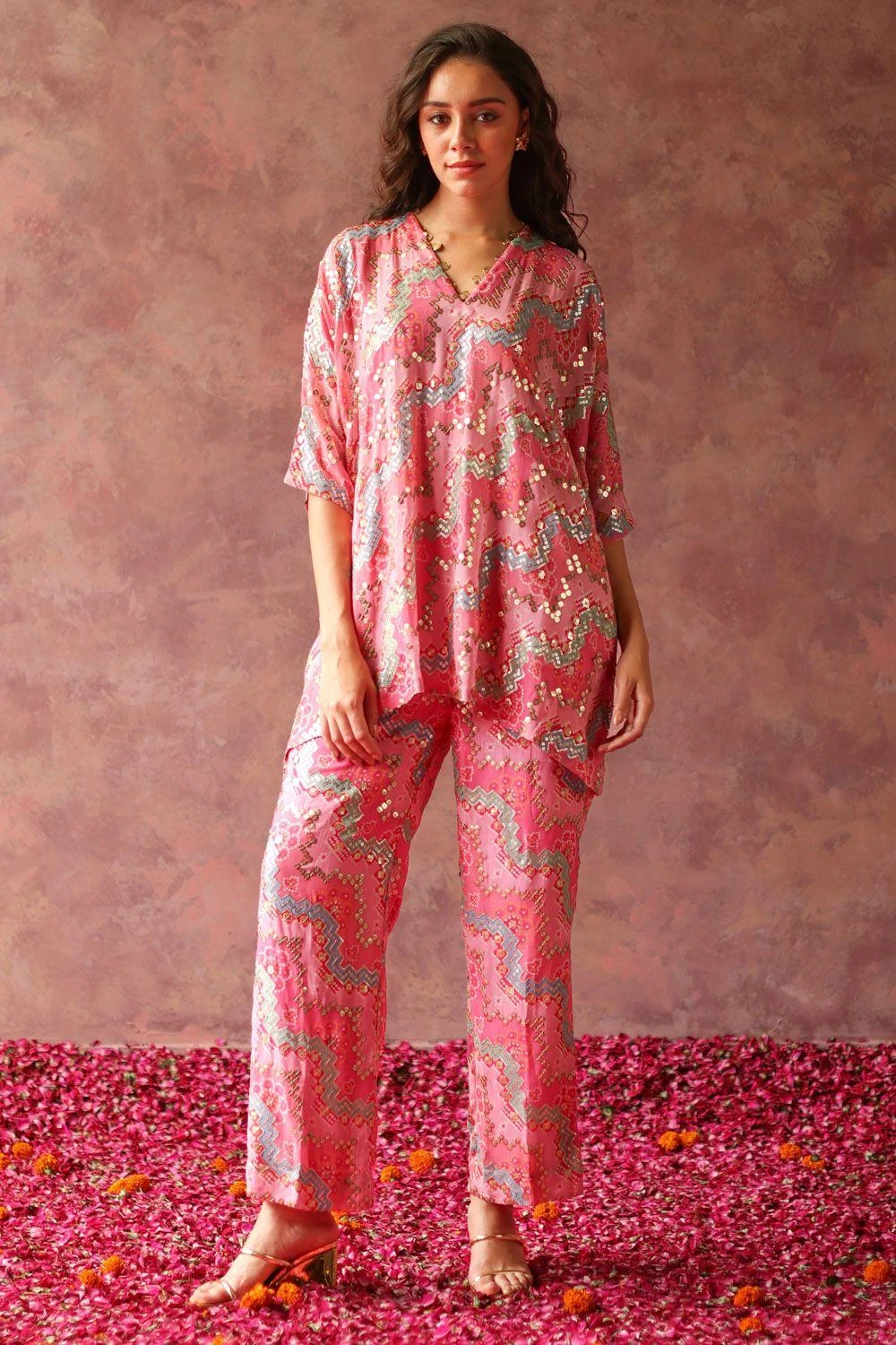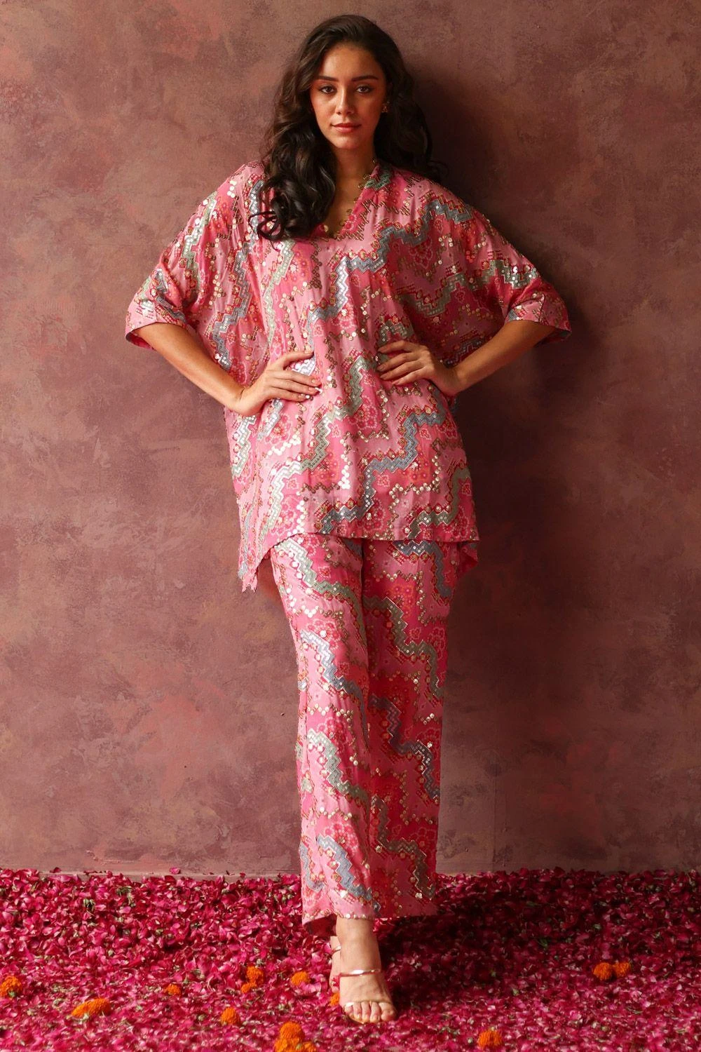 Crafted in georgette & adorned with sequins, the set exudes elegance and glamour. The kaftan features a mesmerising chevron pattern, enhanced with intricate sequin & traditional Sikka embroidery paired with coordinating pants.