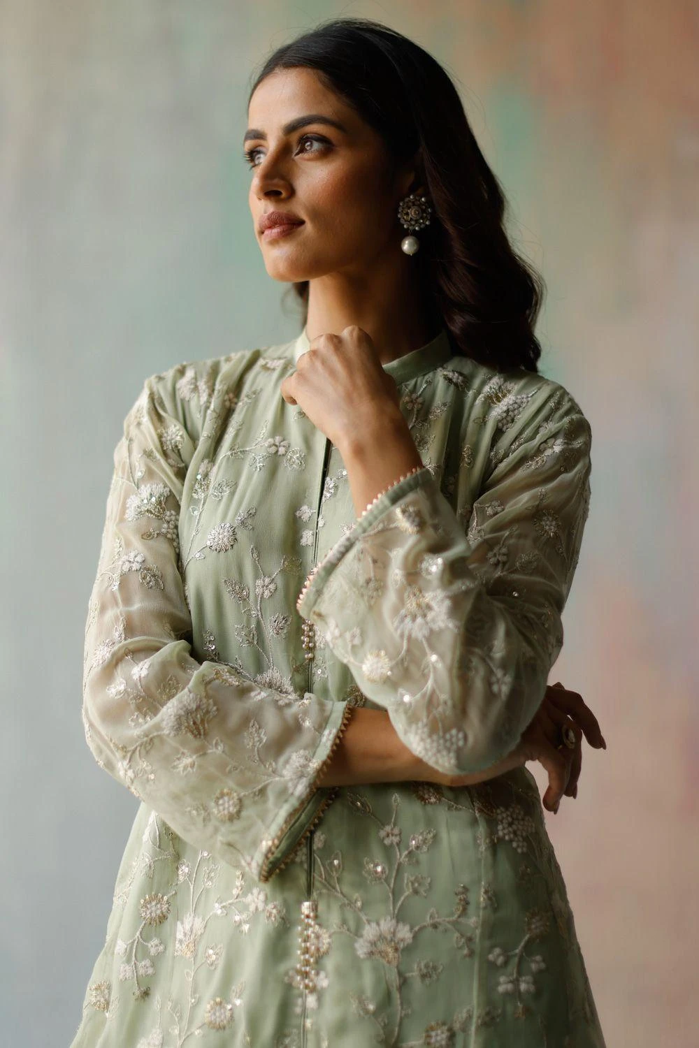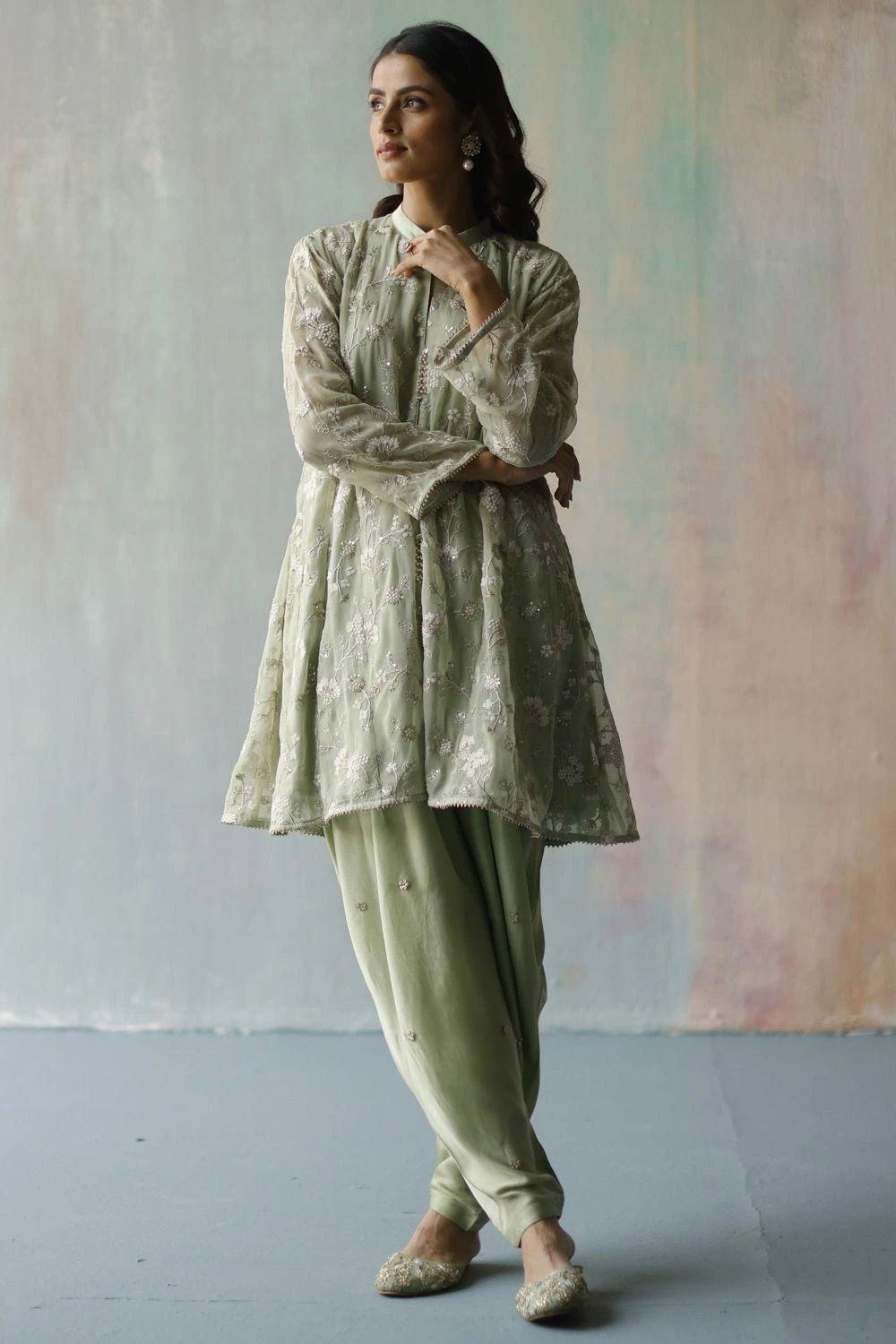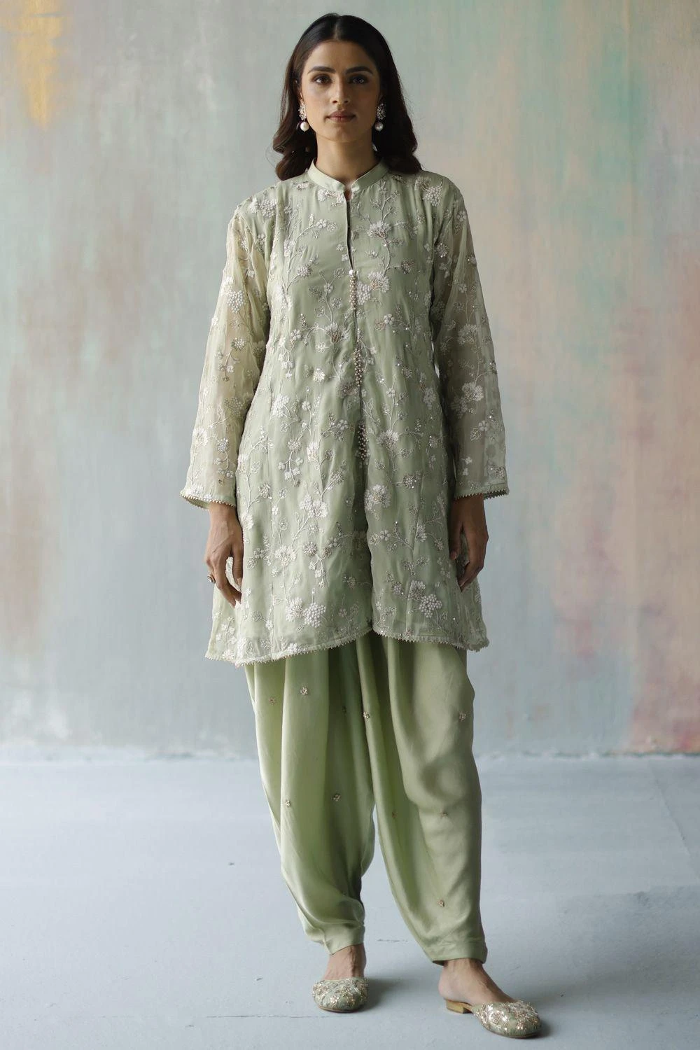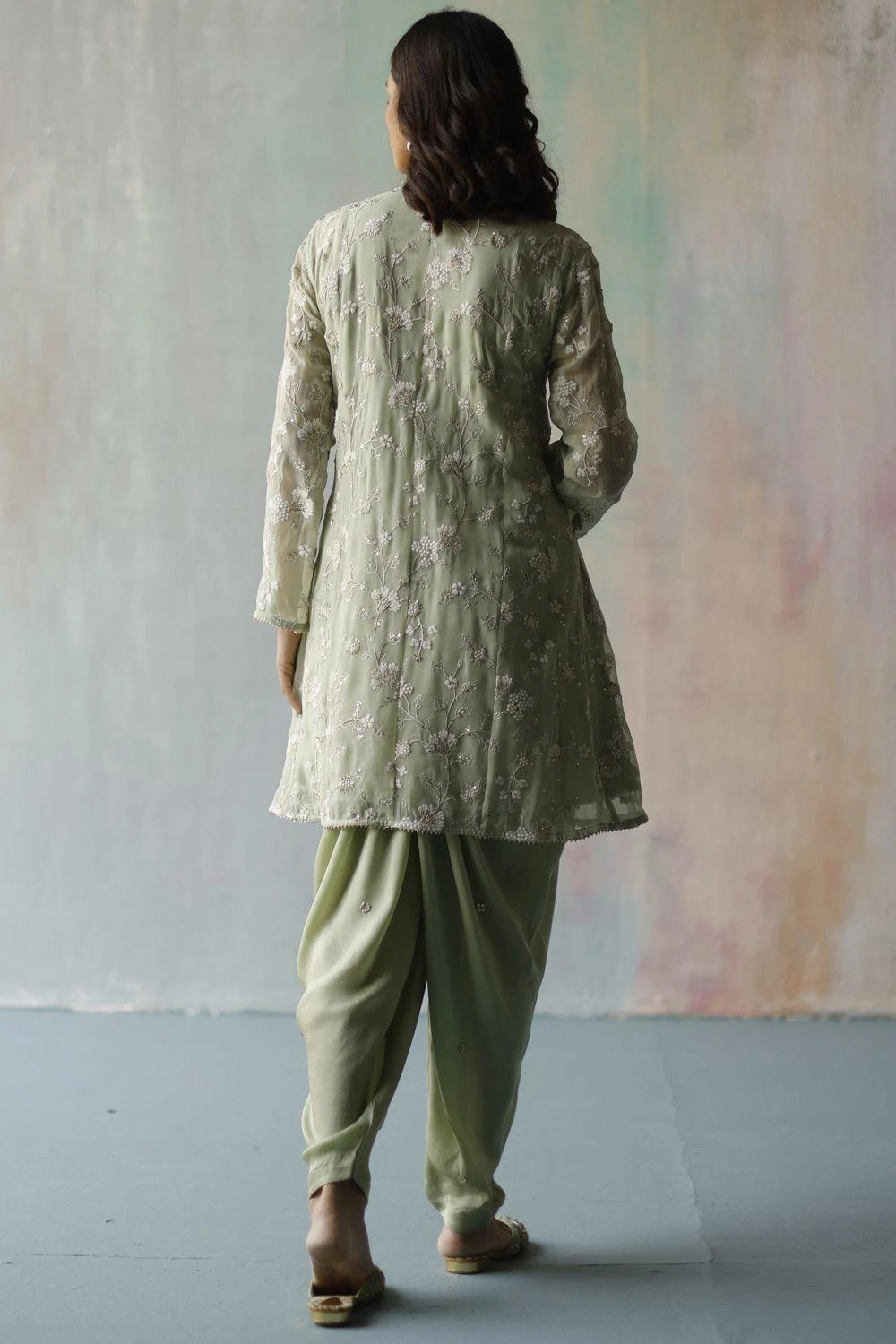 This embroidered kurta set will see you through all kinds of pre wedding festivities. It features a short A-line kurta with thread and zari embroidery paired with a pair of dhoti style pants with dainty accents all over.