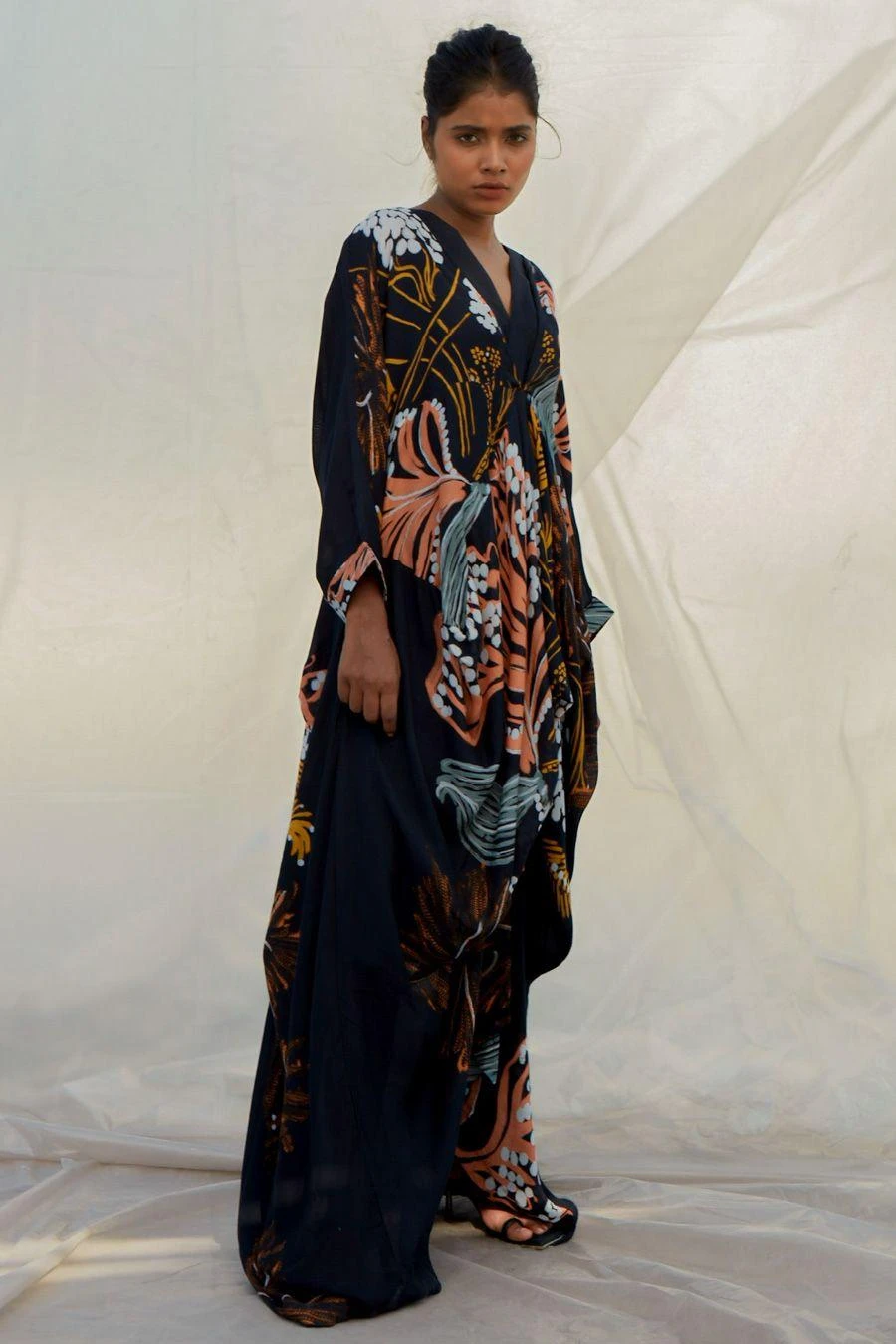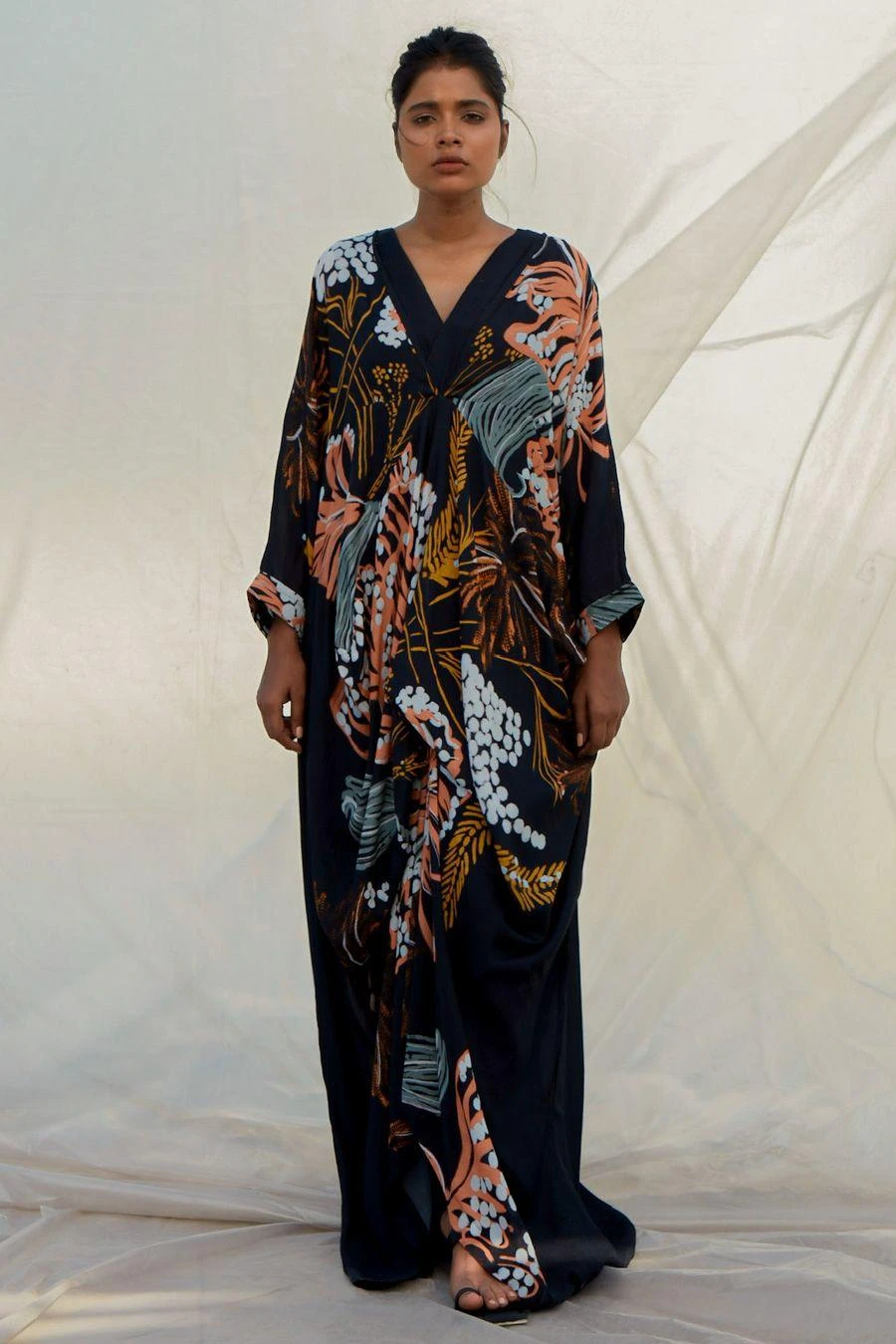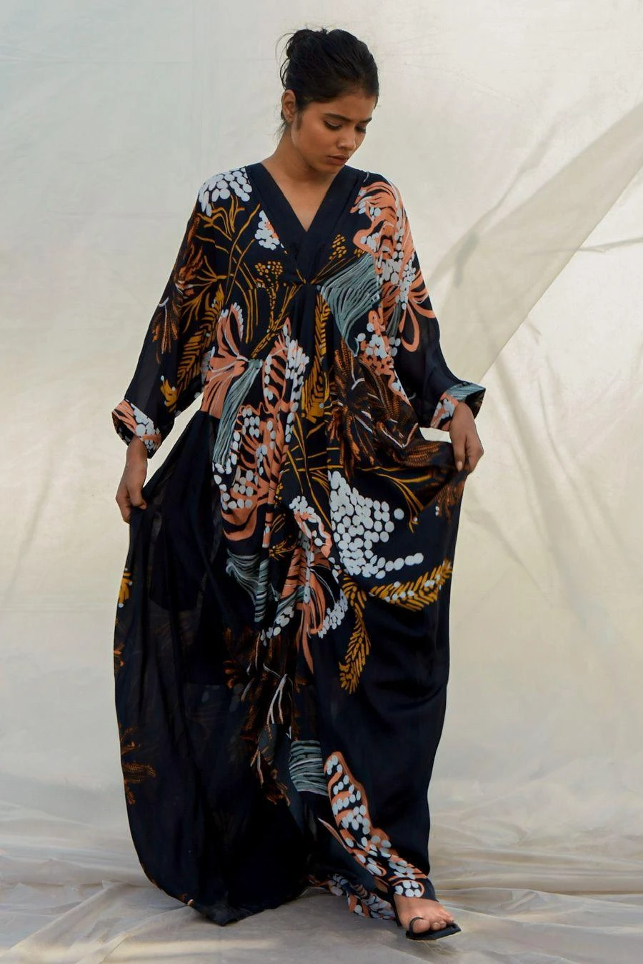 The perfect amalgamation of style and comfort, this kaftan is perfect for a day out. Crafted in muslin, this set features an abstarct printed V-neck kaftan & a slip. Add a pair of dangler earrings to complete the look.