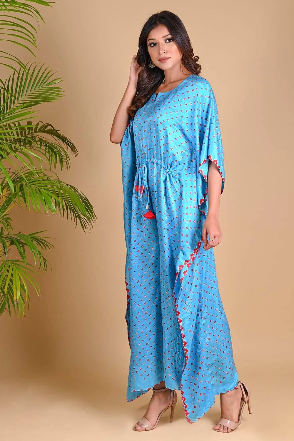 Blue Bandhni Kaftan Jumpsuit With Tassels
