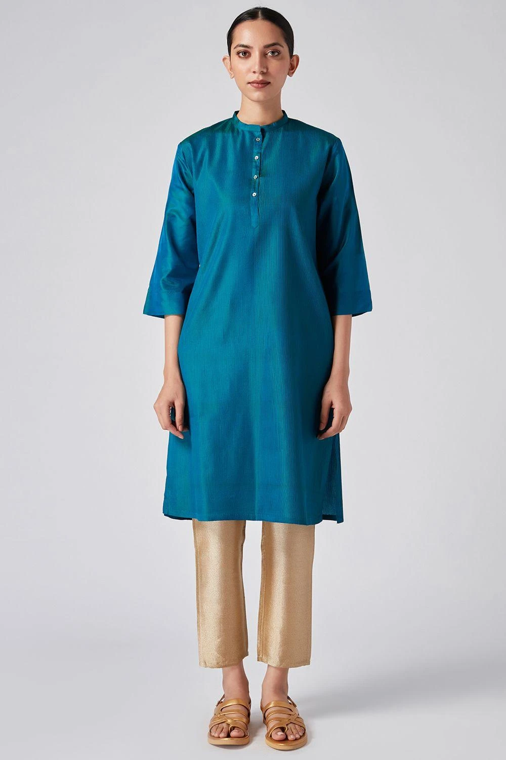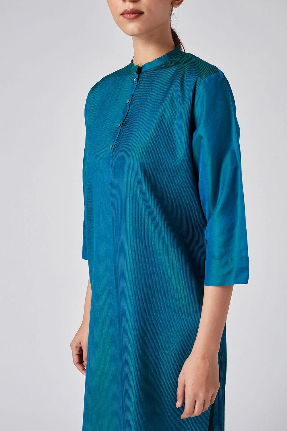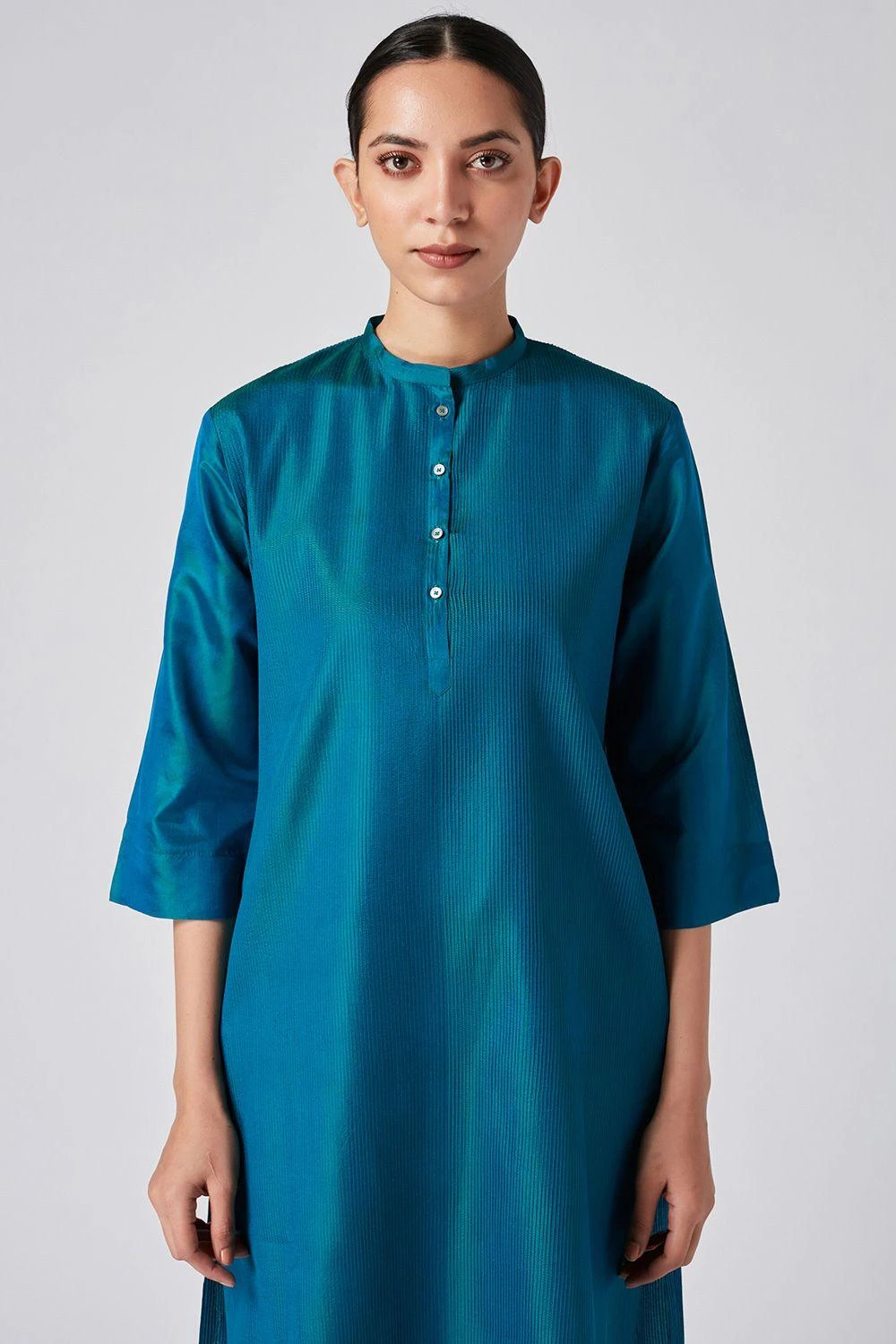 Home or away, this blue kurta will always keep you looking fresh & opulent. Cut in viscose katan, this kurta features signature pintucks with tonal thread details. You can style it with a pair of silk ivory pants.