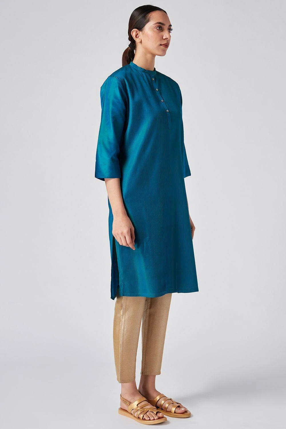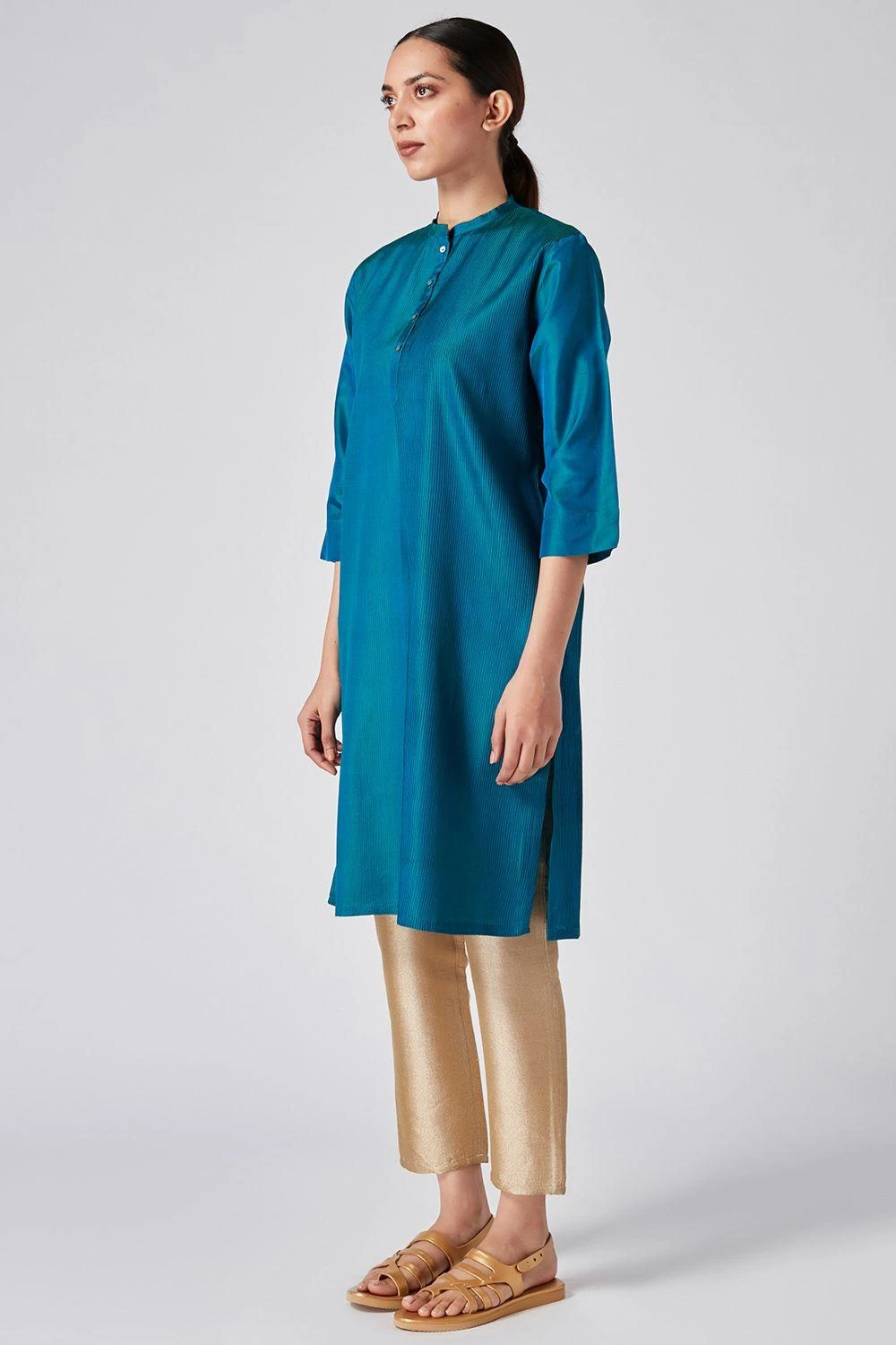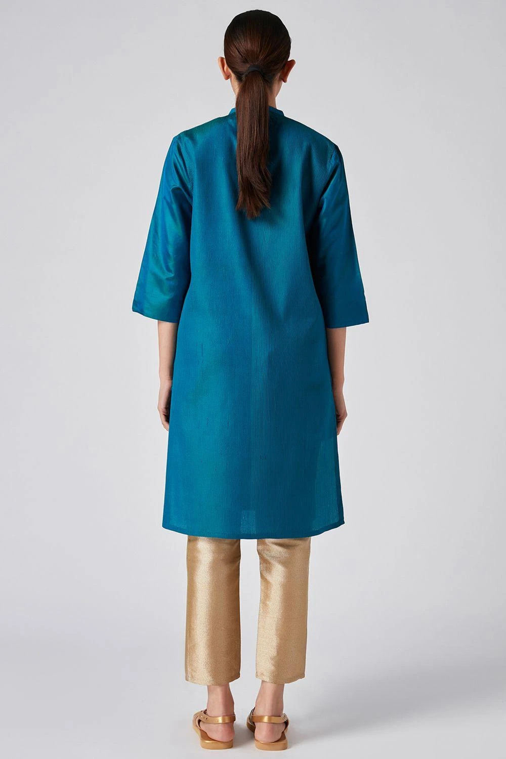 Home or away, this blue kurta will always keep you looking fresh & opulent. Cut in viscose katan, this kurta features signature pintucks with tonal thread details. You can style it with a pair of silk ivory pants.