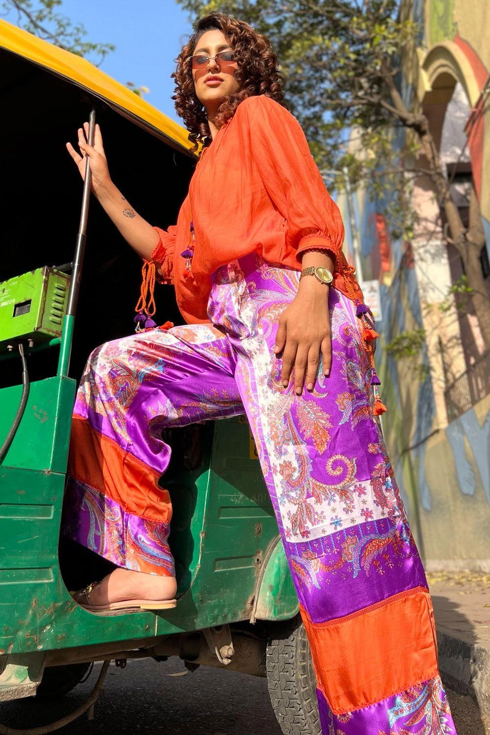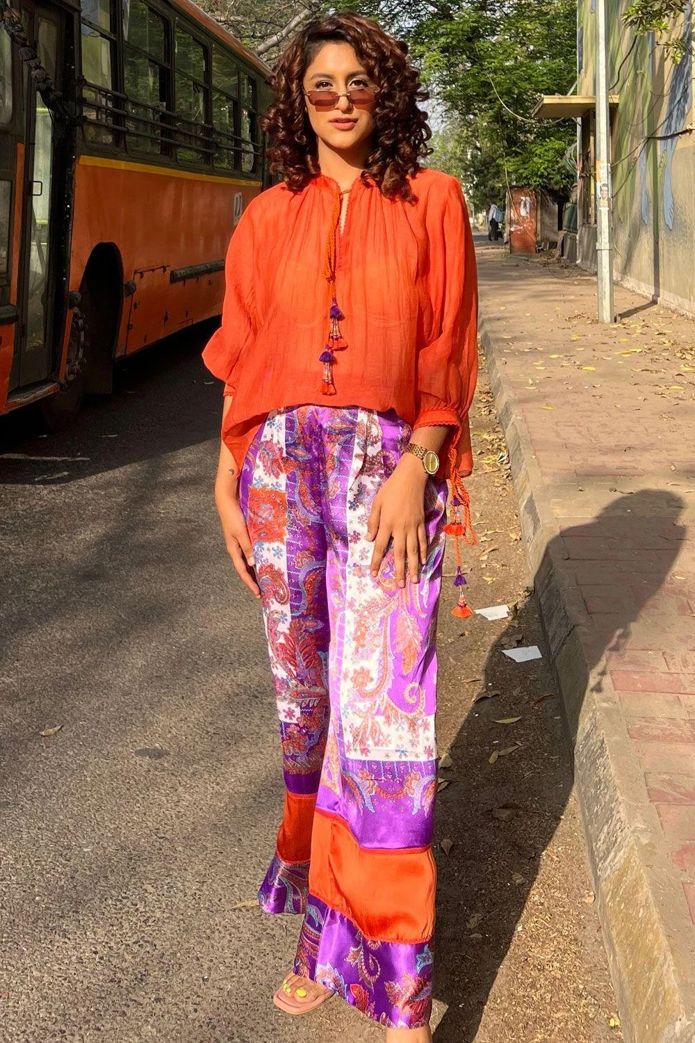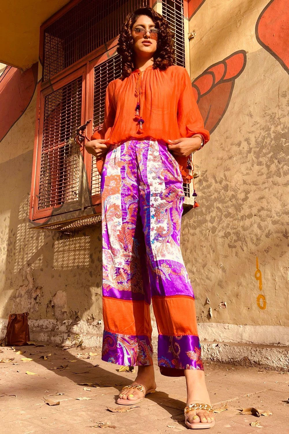 This orange breezy top is a great option for an everyday look. It is cut in chanderi silk with a gathered band collar and dori string tassels. You can team it up with a pair of coordinating trousers from the collection.