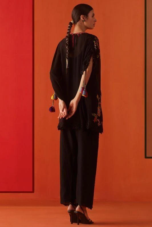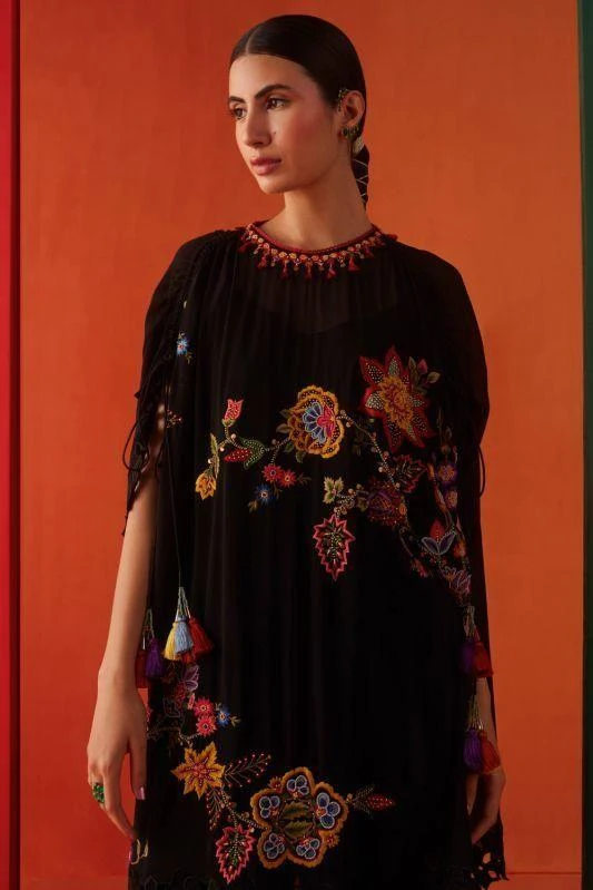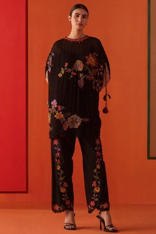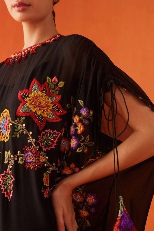 Experience the essence of elegance with this kaftan. Impeccably adorned with floral embroidery & intricate cutwork, this piece redefines opulence. Pair it with coordinating pants from the collection to complete the set,