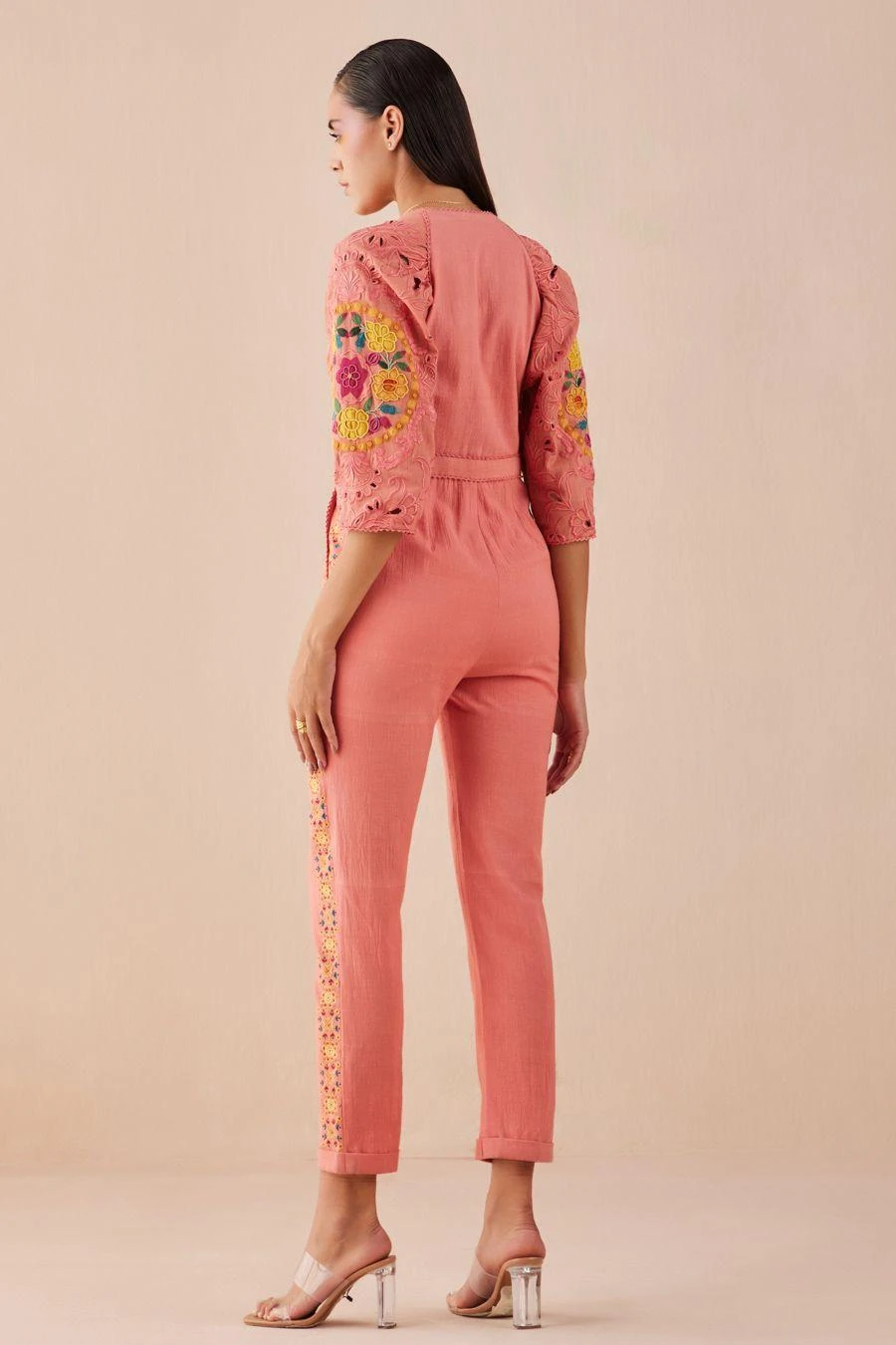 Chandrima Blush Floral Applique And Cutwork Jumpsuit