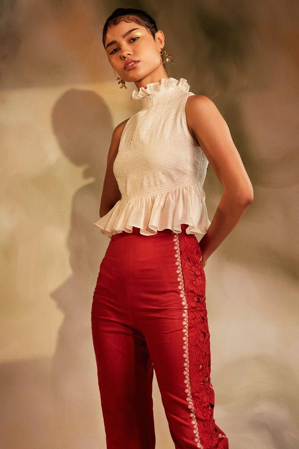 This delicate ivory smocked chanderi top is a versatile piece. The ruffled neckline & hem add a romantic element to this classic piece. Style it over trousers or a skirt to complete the look.