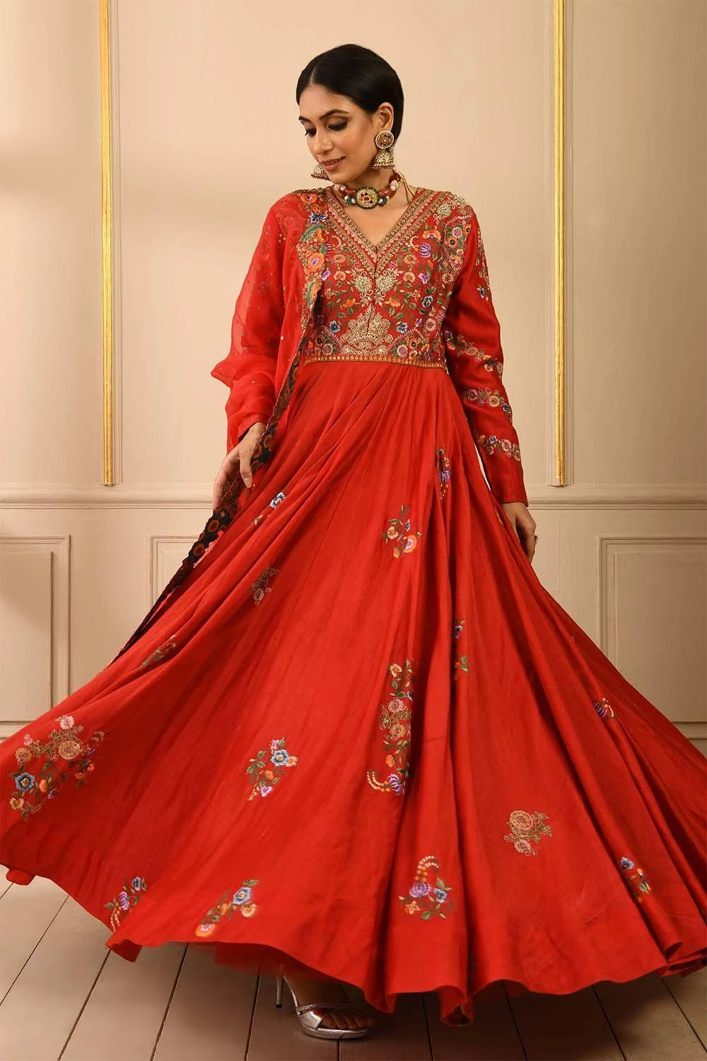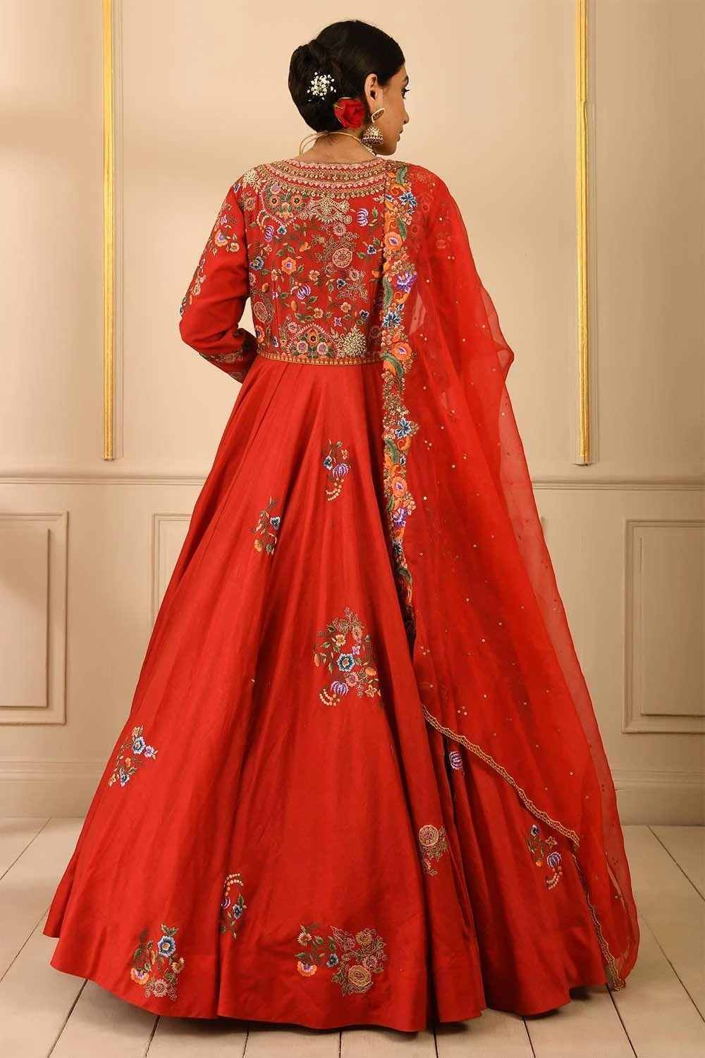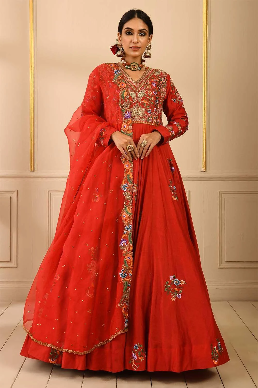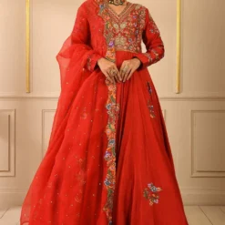 Red anarkali with an appealing V neck. It features immaculate floral embroidery on the yoke with subdued gold detailing. The ensemble is paired with a delicate organza dupatta.