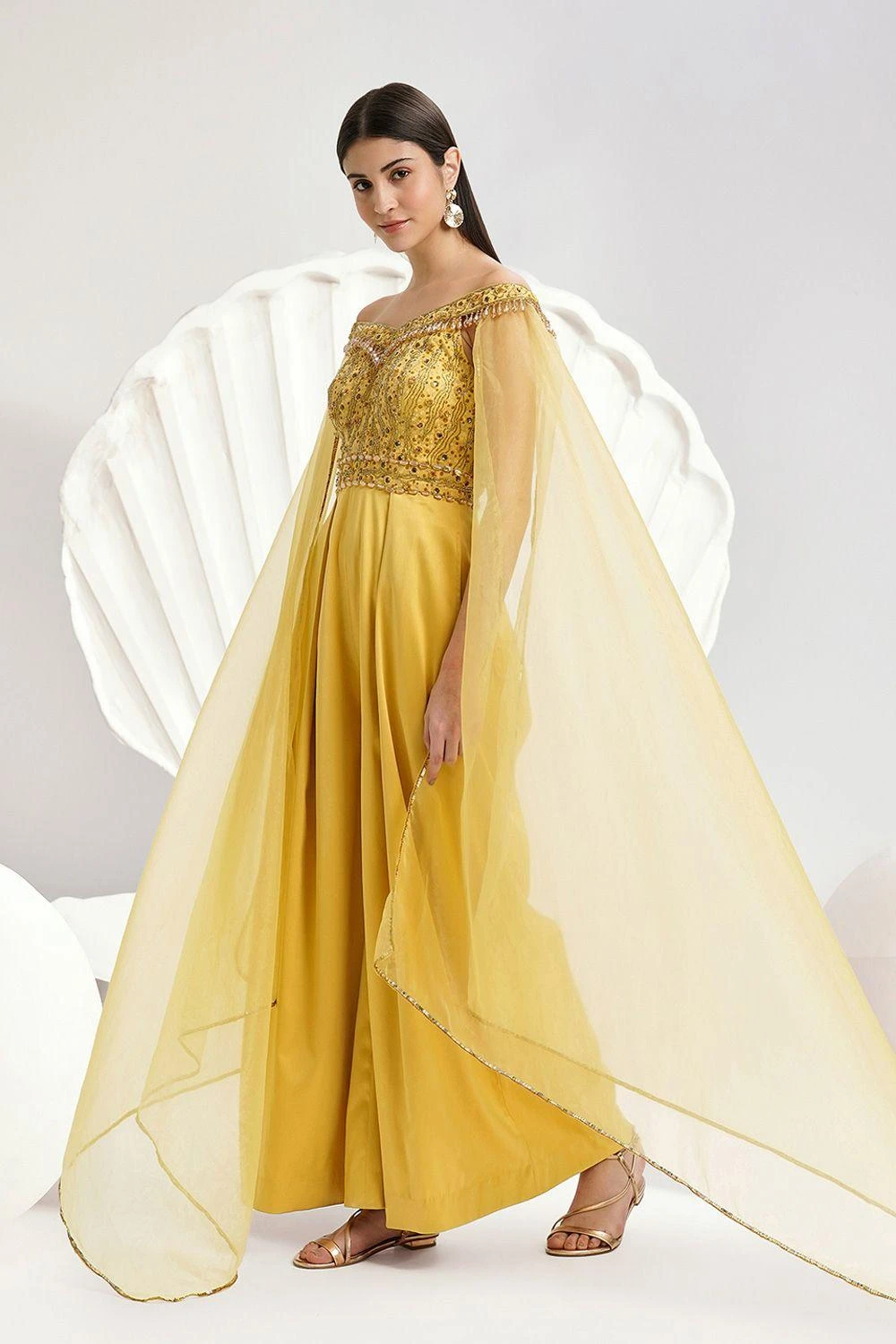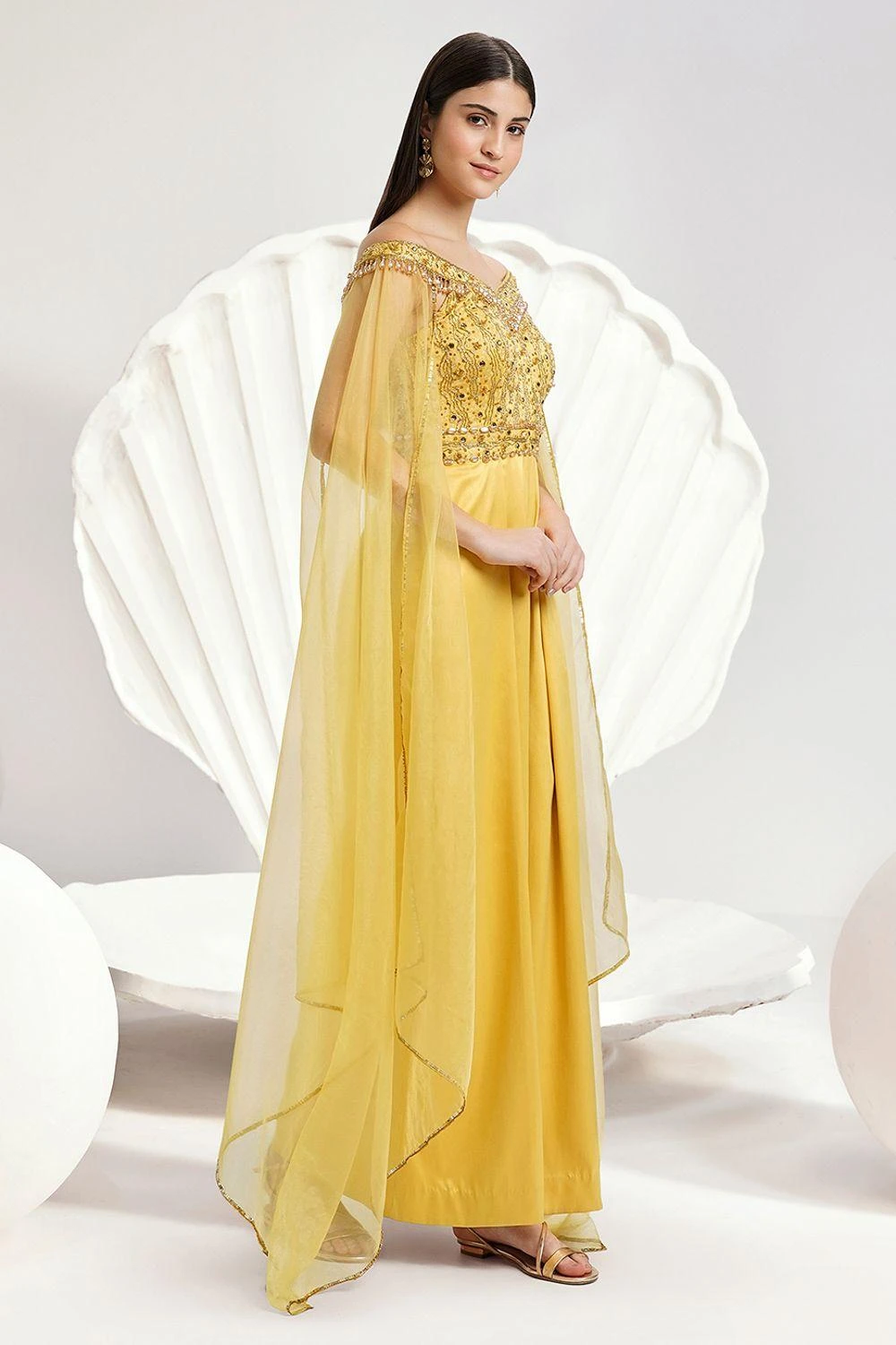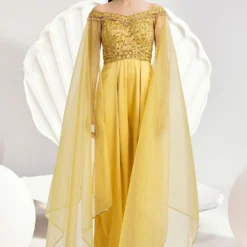 Embrace grace in the embellished Emma Jumpsuitùcrafted for elegant dreams. Featuring grand cape sleeves and wide-leg pleated trousers, it’s a glide towards sophistication and style.