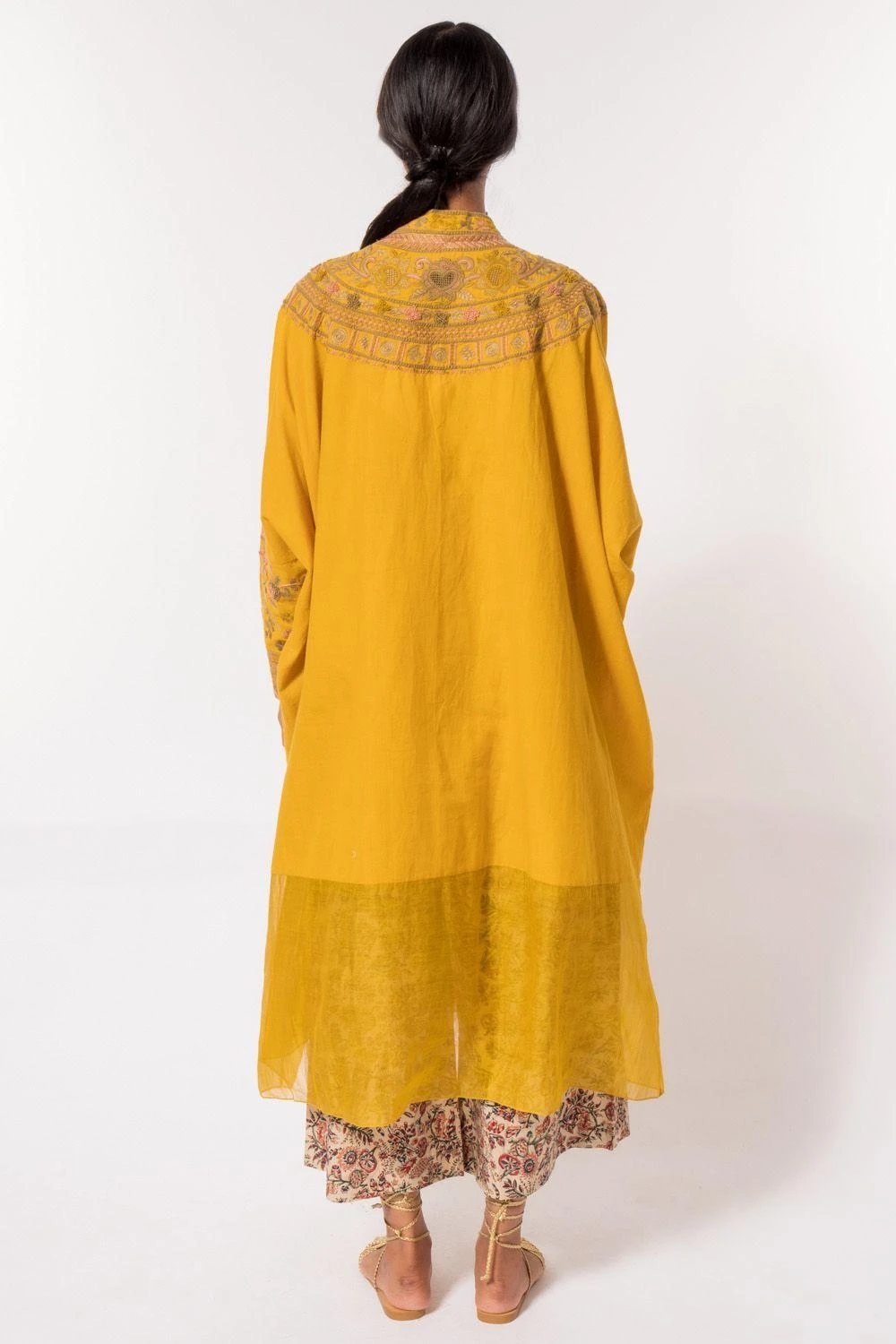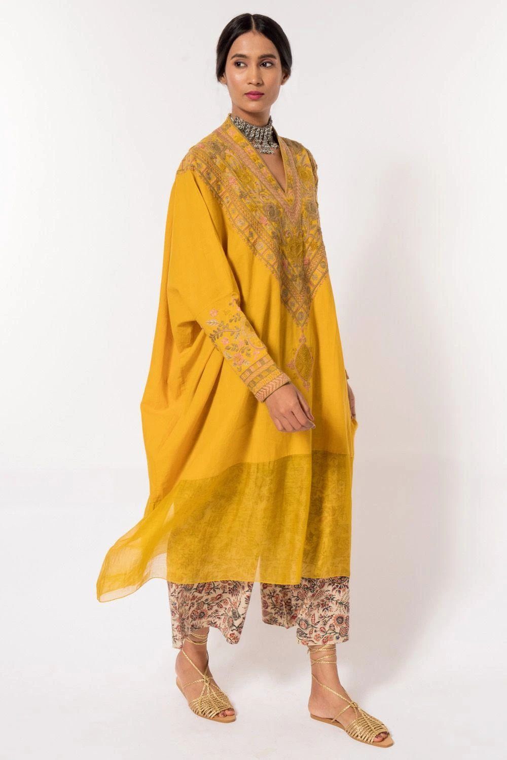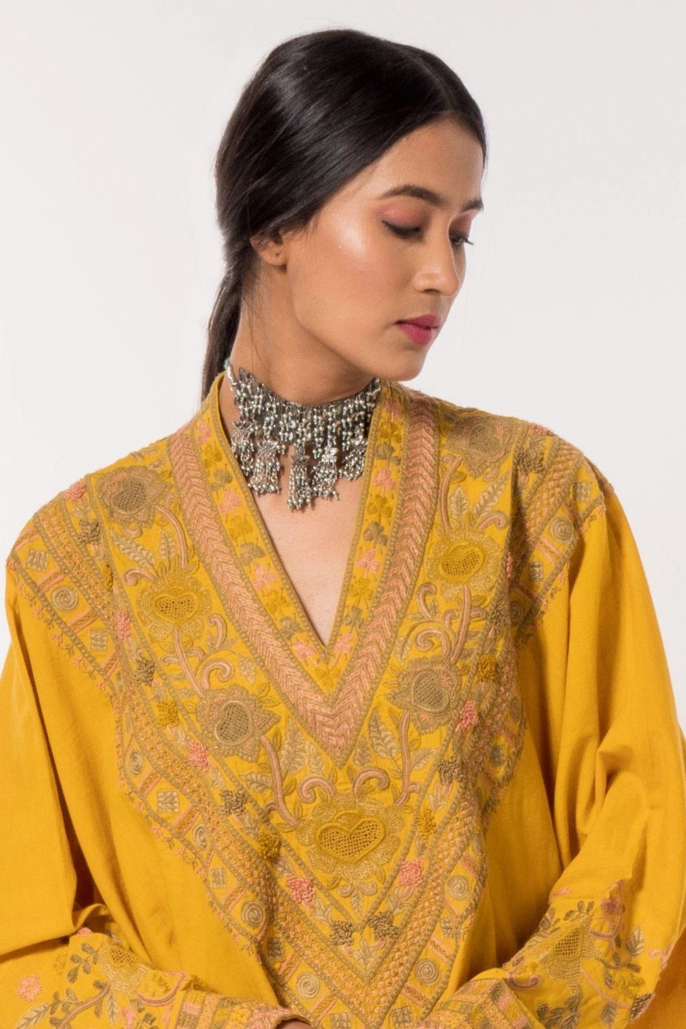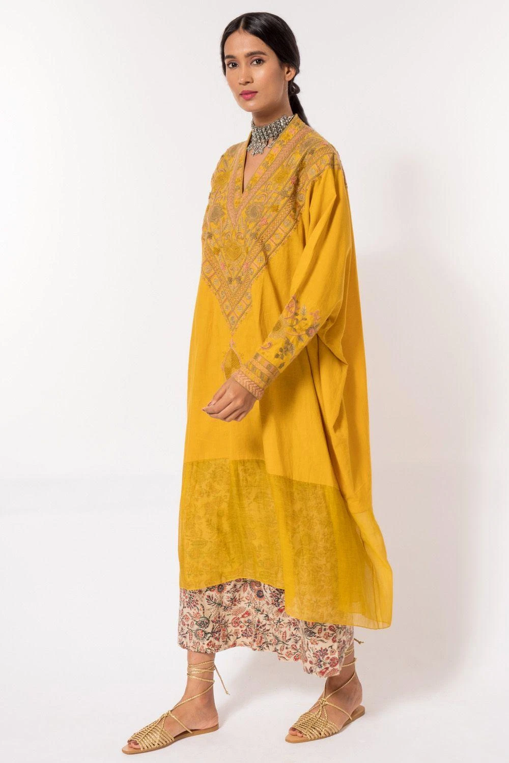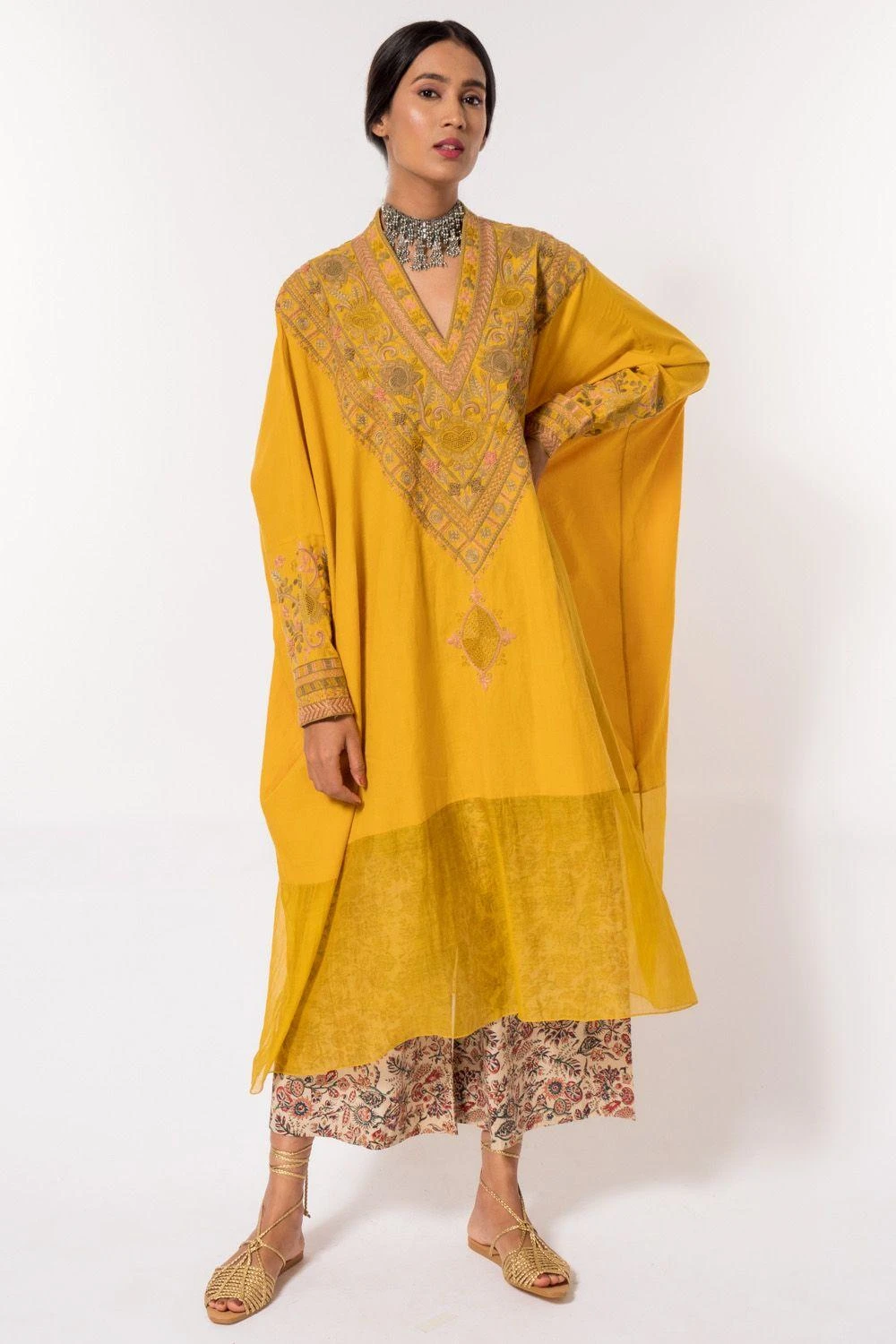 Easy & comfy is the new dressy and this mustard kaftan set perfectly fits that bill. It features a V-neck kaftan kurta highlighted with beautiful embroidery details. It is paired with contrast printed palazzo pants.