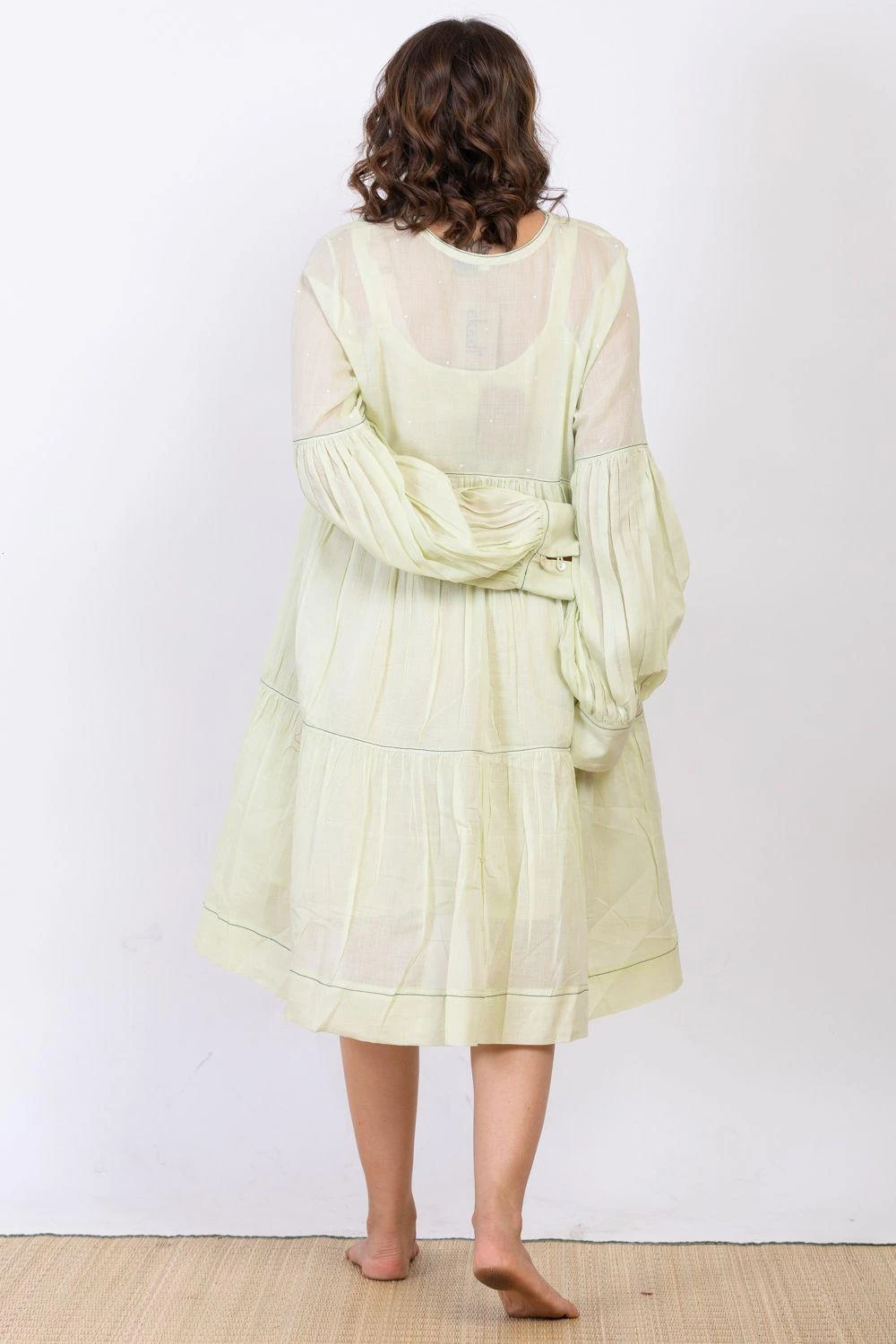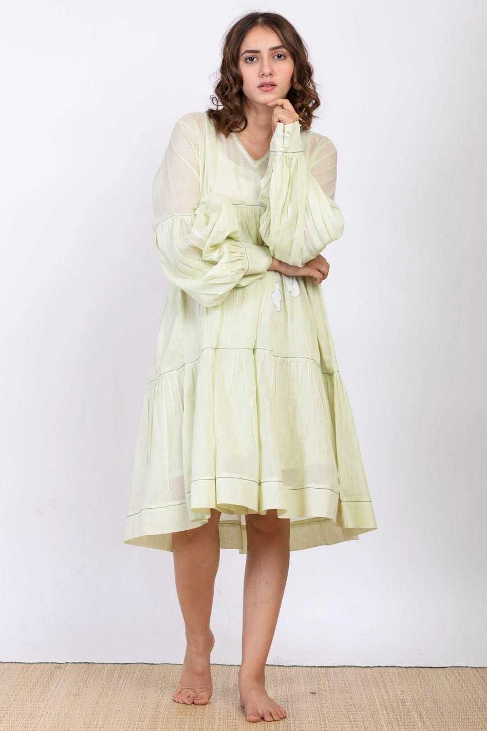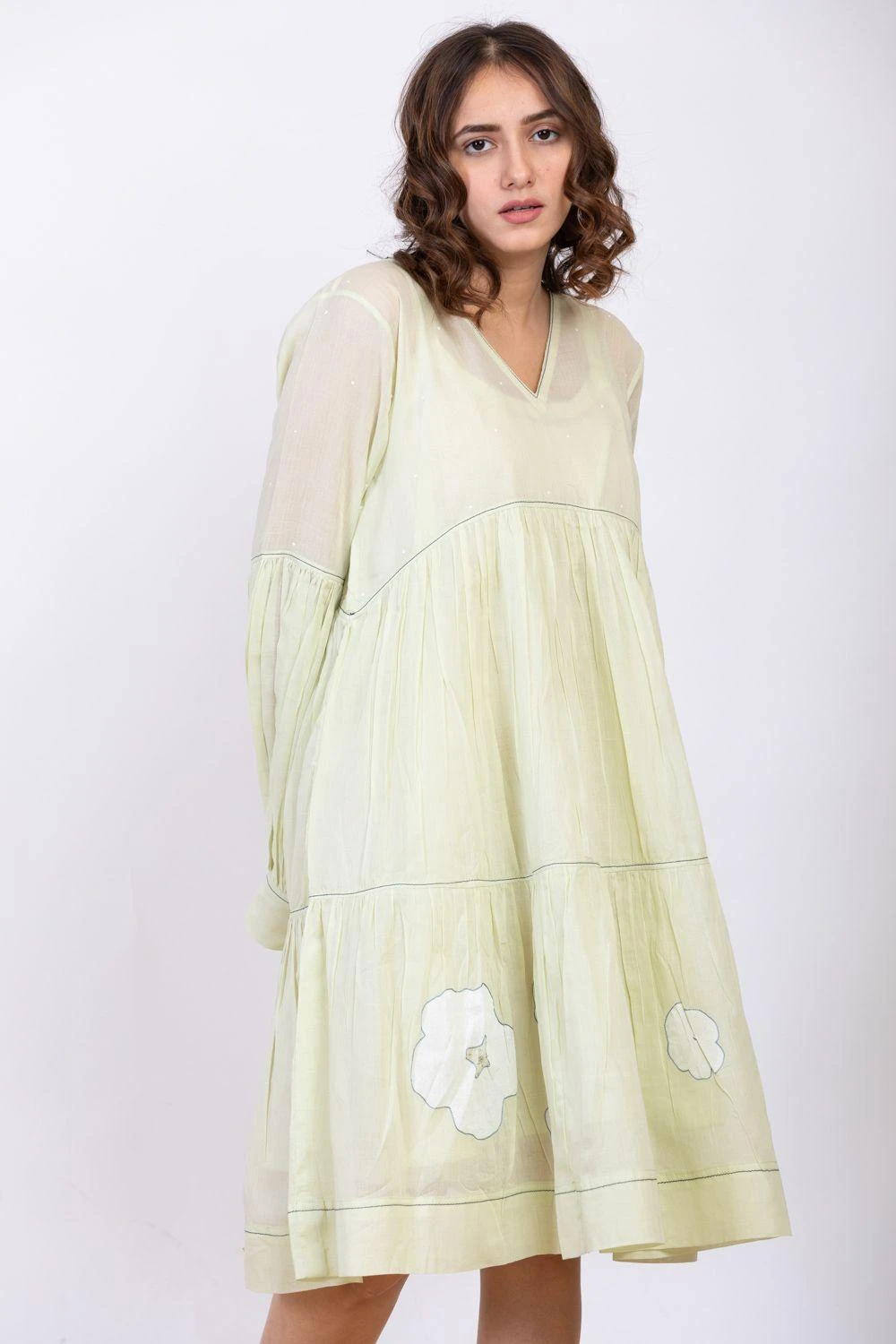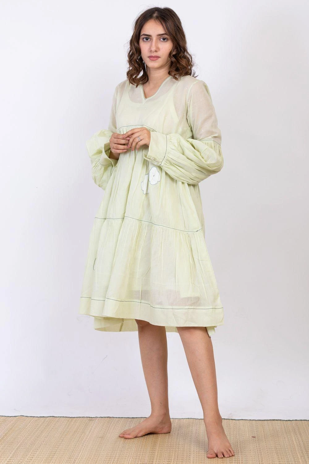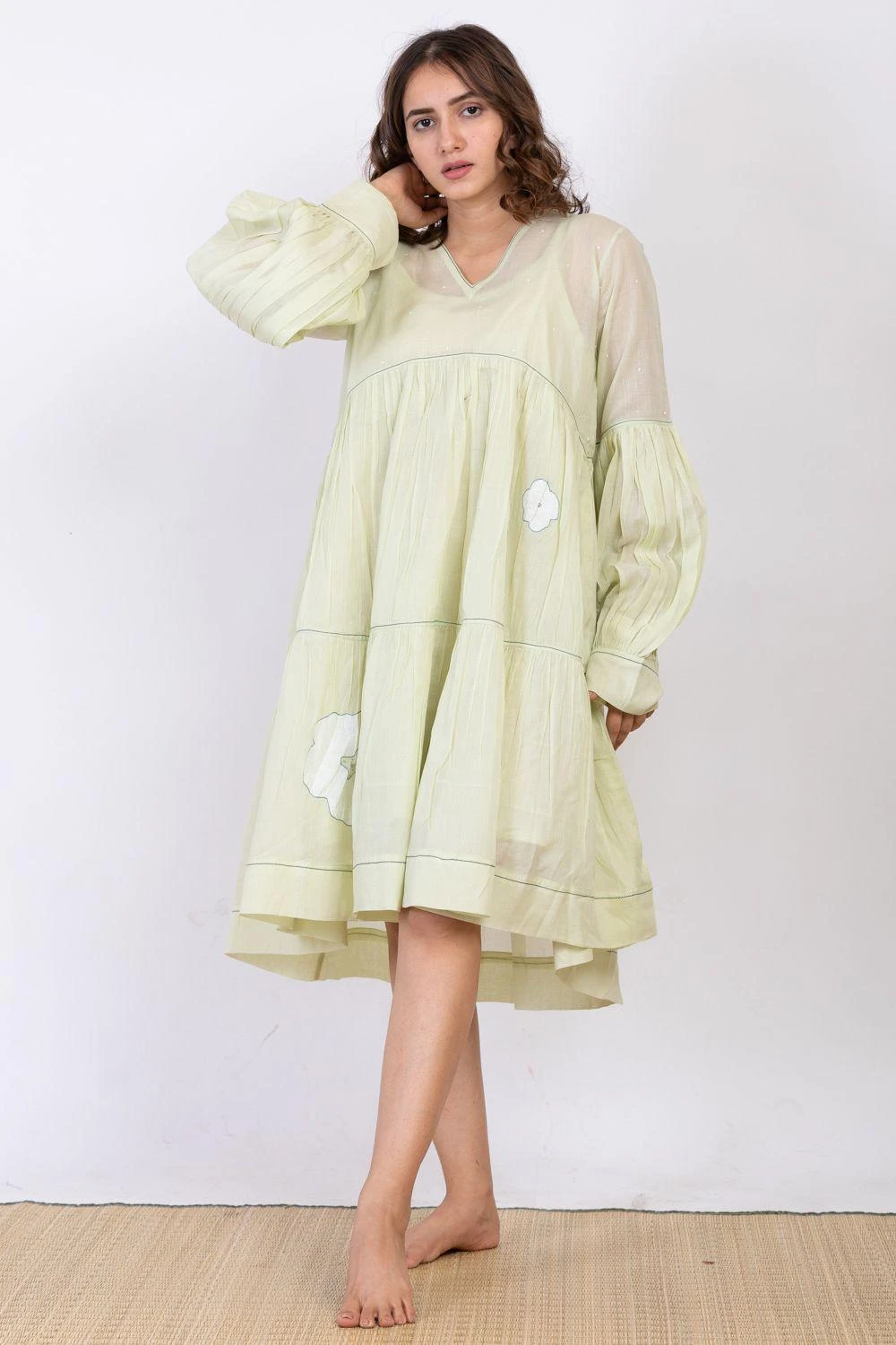 Keep it light & fuss-free on your summer days in this powder mint dress, cut in cotton silk with details like self texture, floral hand block print and embroidery details. It comes with an inner slip.
