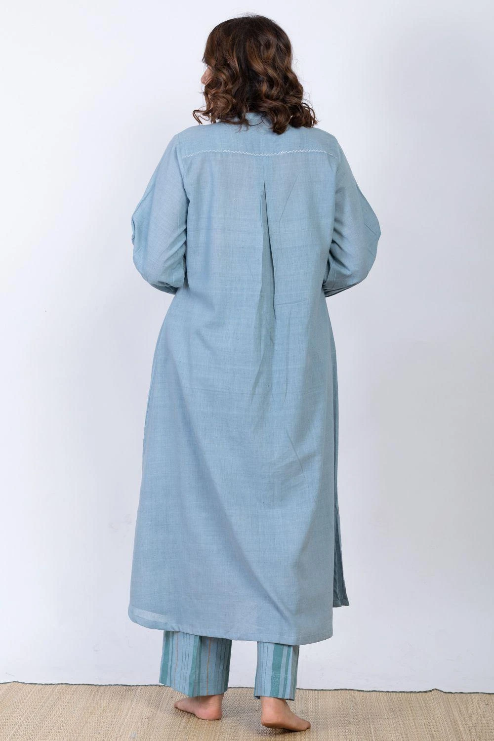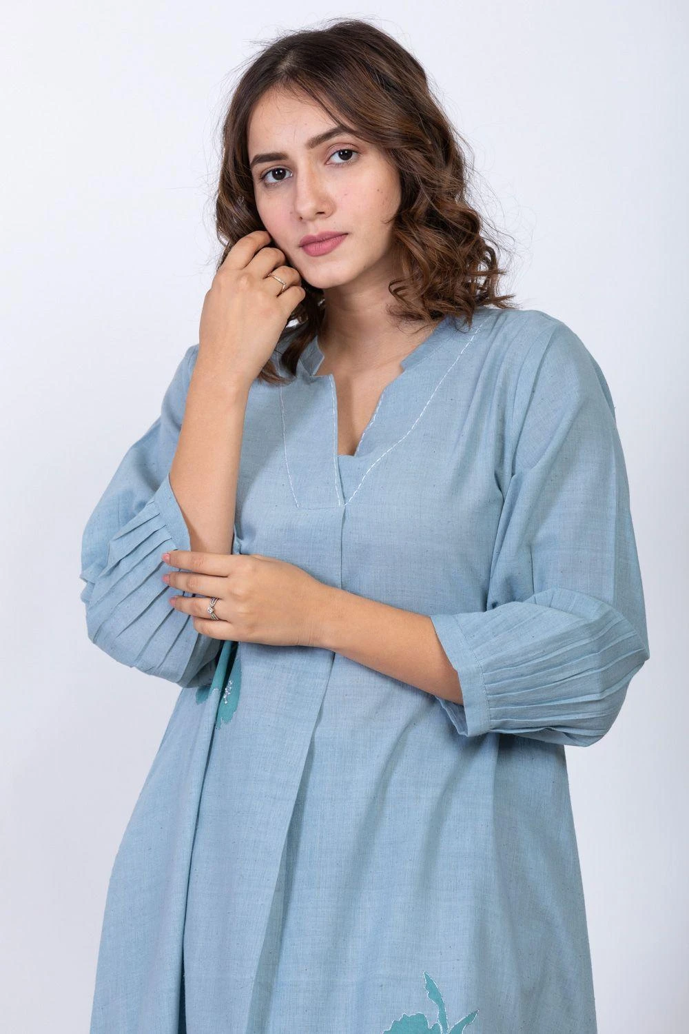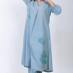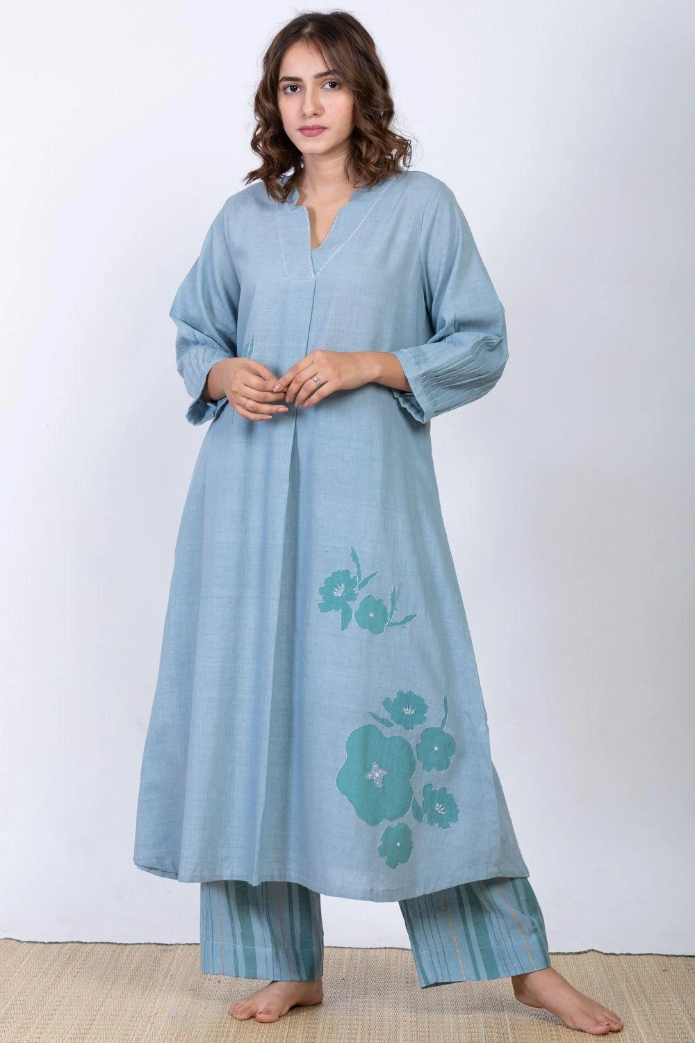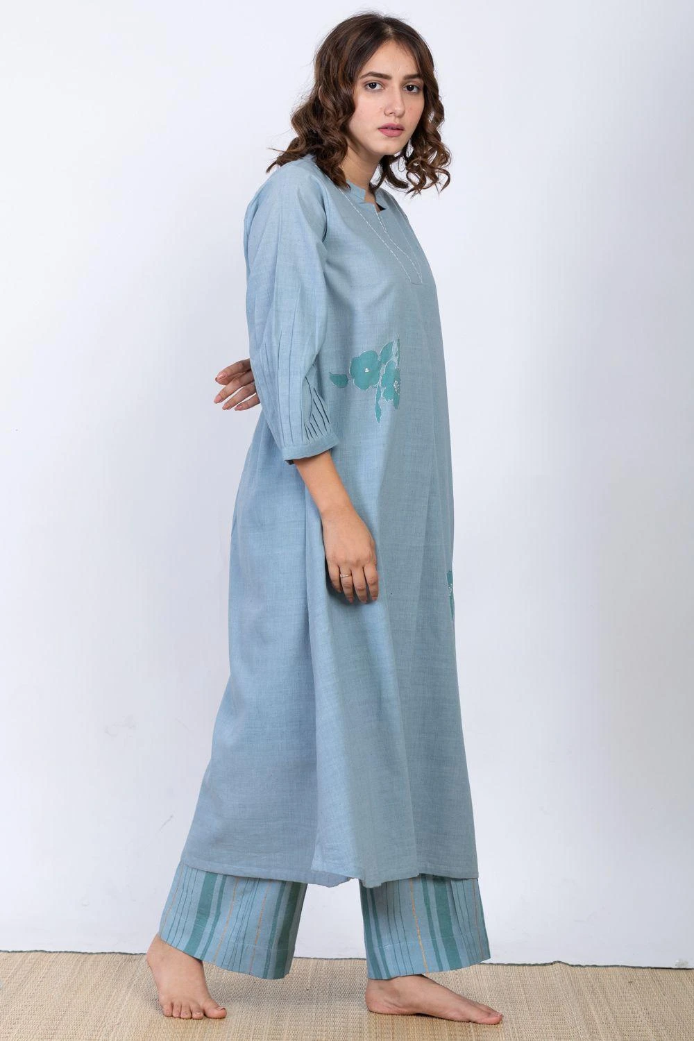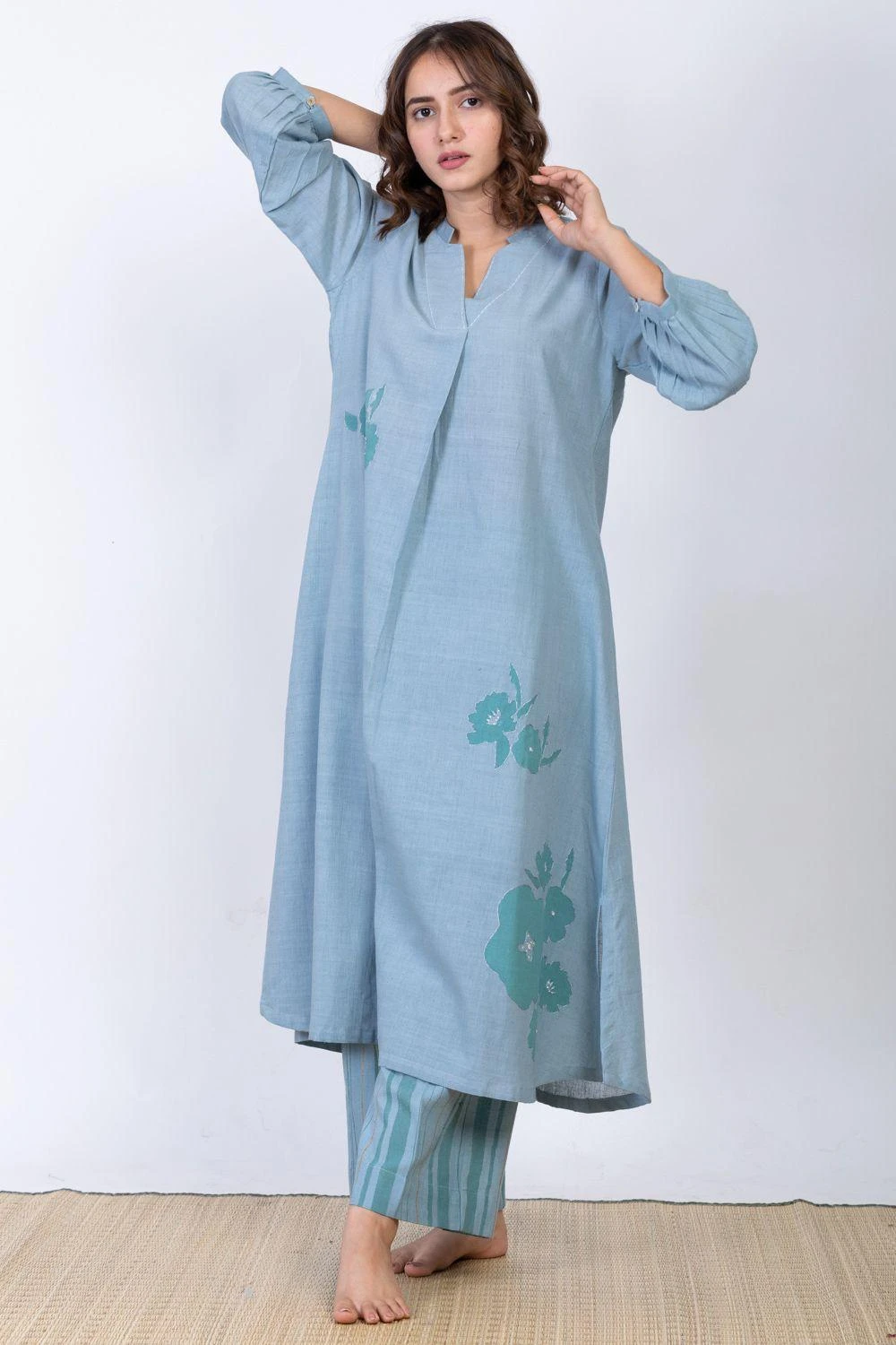 Crafted in handspun cotton, this slate blue tunic features elegant details of impressionist floral placement handprint with embroidered highlights. It comes along with a pair of classic straight cut pants.