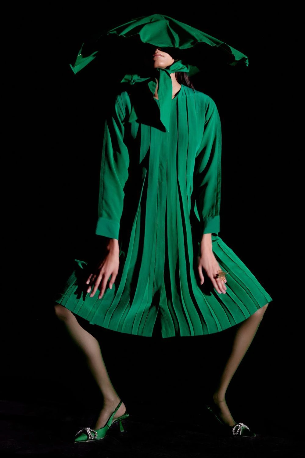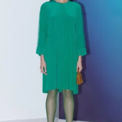 Step into elegance with this understated Emerald Green Box Pleated Dress. This attire features an attached waist belt, accentuating your silhouette with effortless grace.
