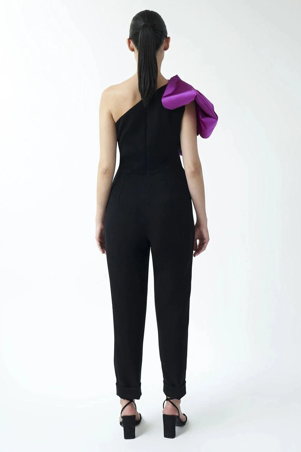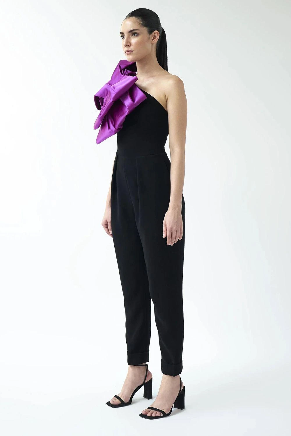 Dazzle in this one-shoulder jumpsuit, adorned with a dramatic side bow in luxurious duchess satin. This outfit is the epitome of elegance and contemporary flair, perfect for making a statement at any special occasion.
