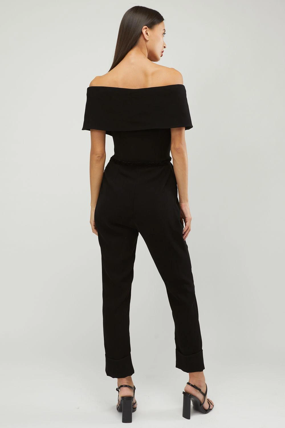 This black power jumpsuit is sharp, elegant, feminine and striking all at once. It features a collared off shoulder detail. Style this exquisite piece with a pair of statement earrings & heels to complete the look.