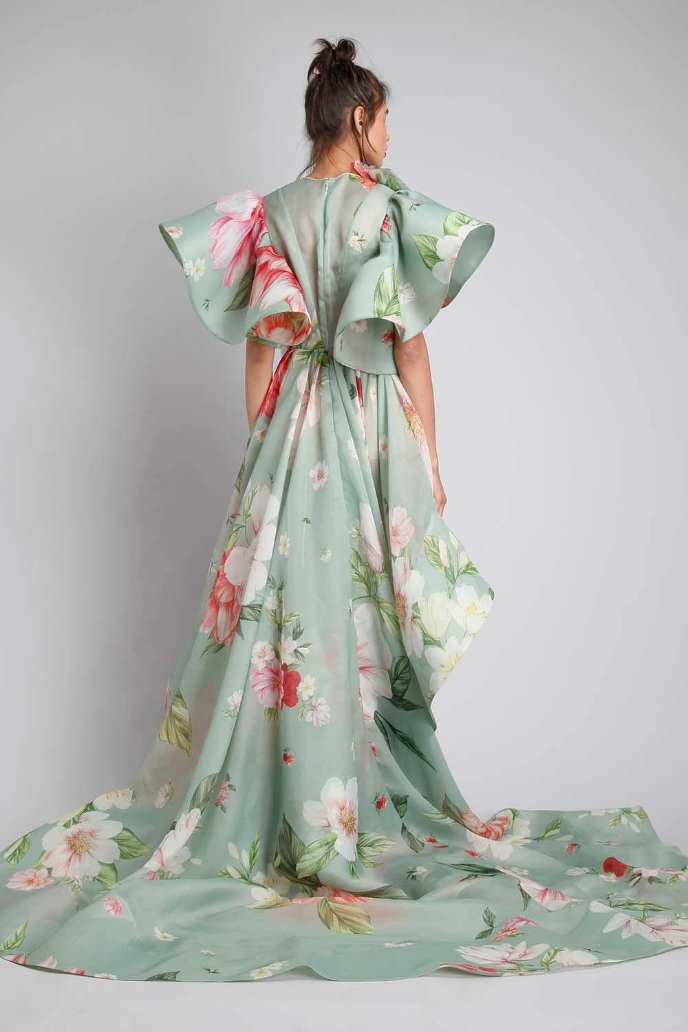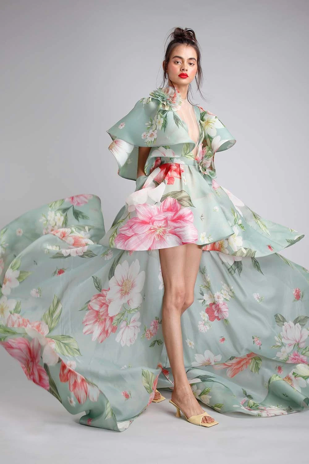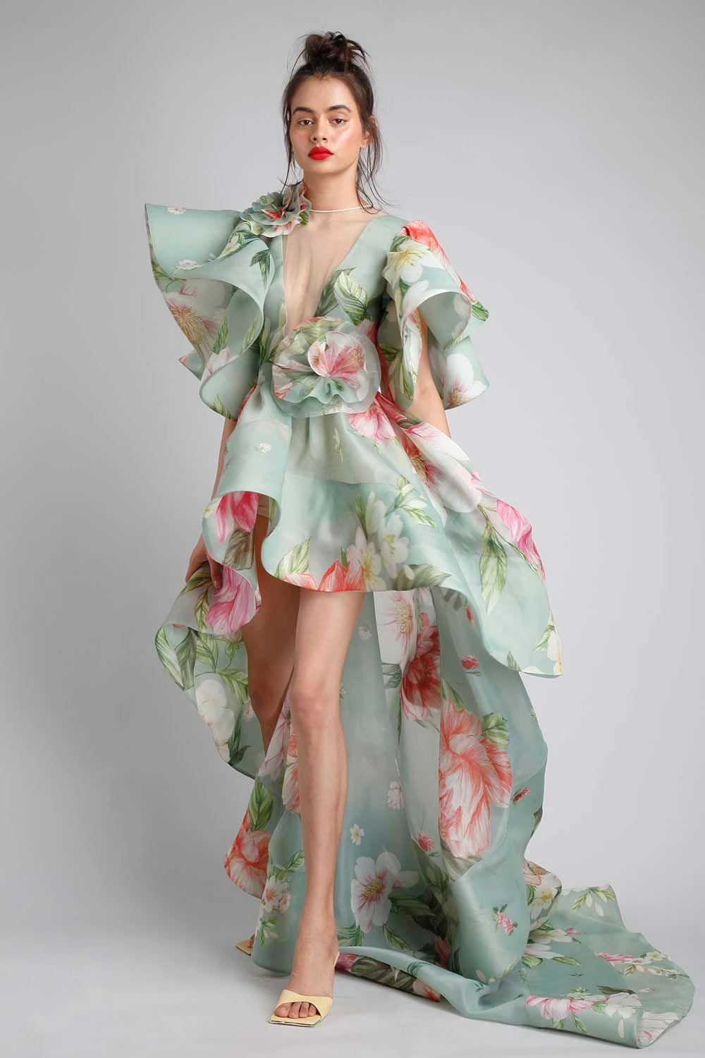 If only we could ruffle our way through life. This ethereal beauty is made in sheer organza embracing luscious floral prints. It features a deep v neck covered with sheer net. The fluttered sleeves, high low hem and frill flowers accentuate the look.