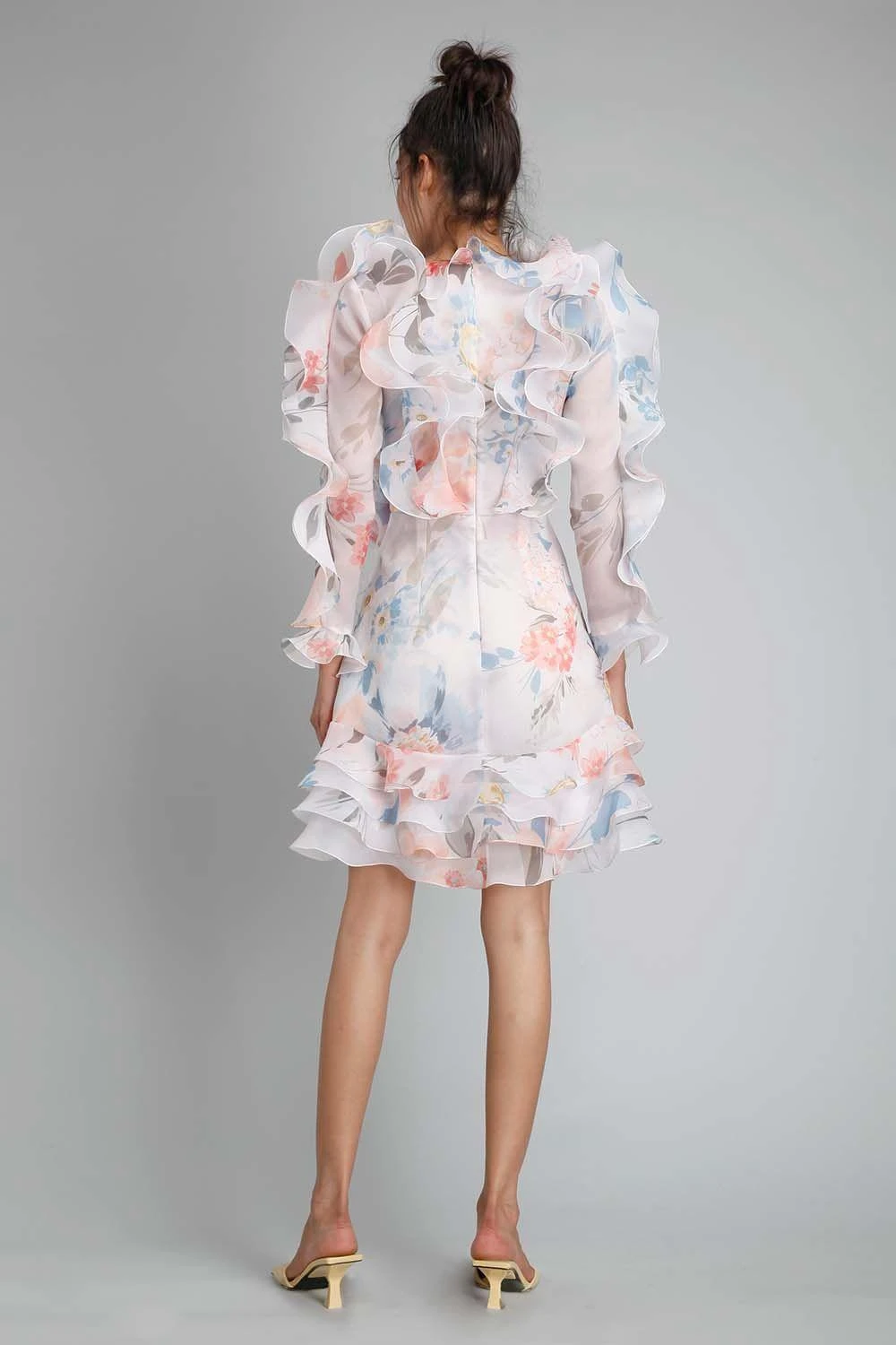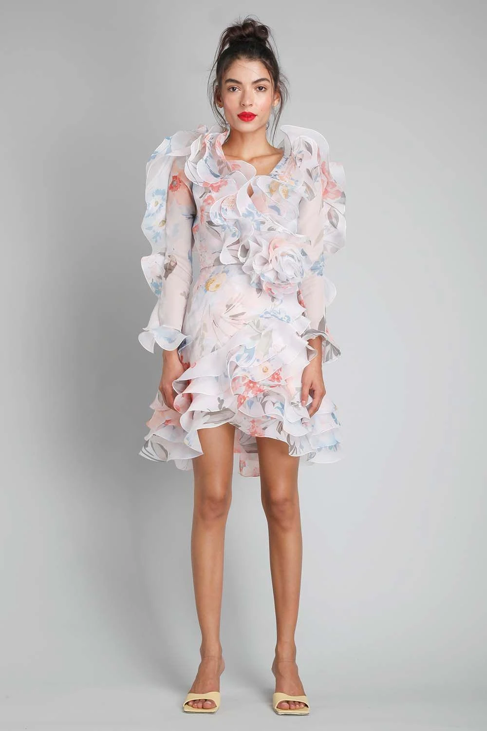 Radiate absolute elegance in this V neck short dress. Crafted in wispy organza with delicate textures and romantic ruffles, the dress is surely going to turn heads. It soft palette and graceful prints adds extra charm to the dress.