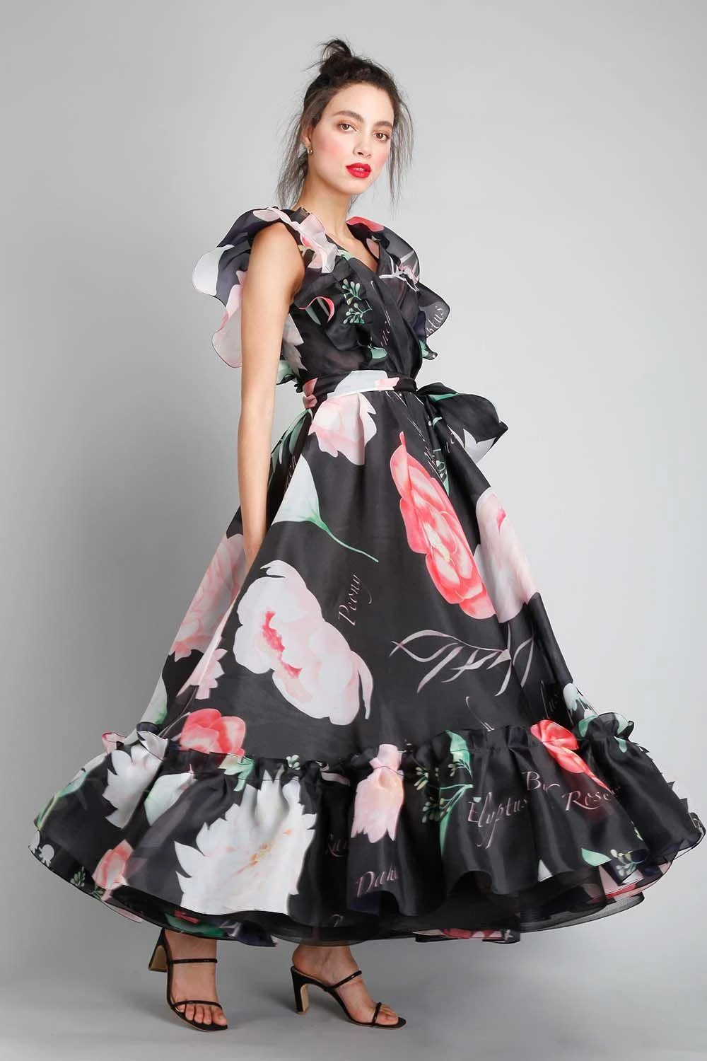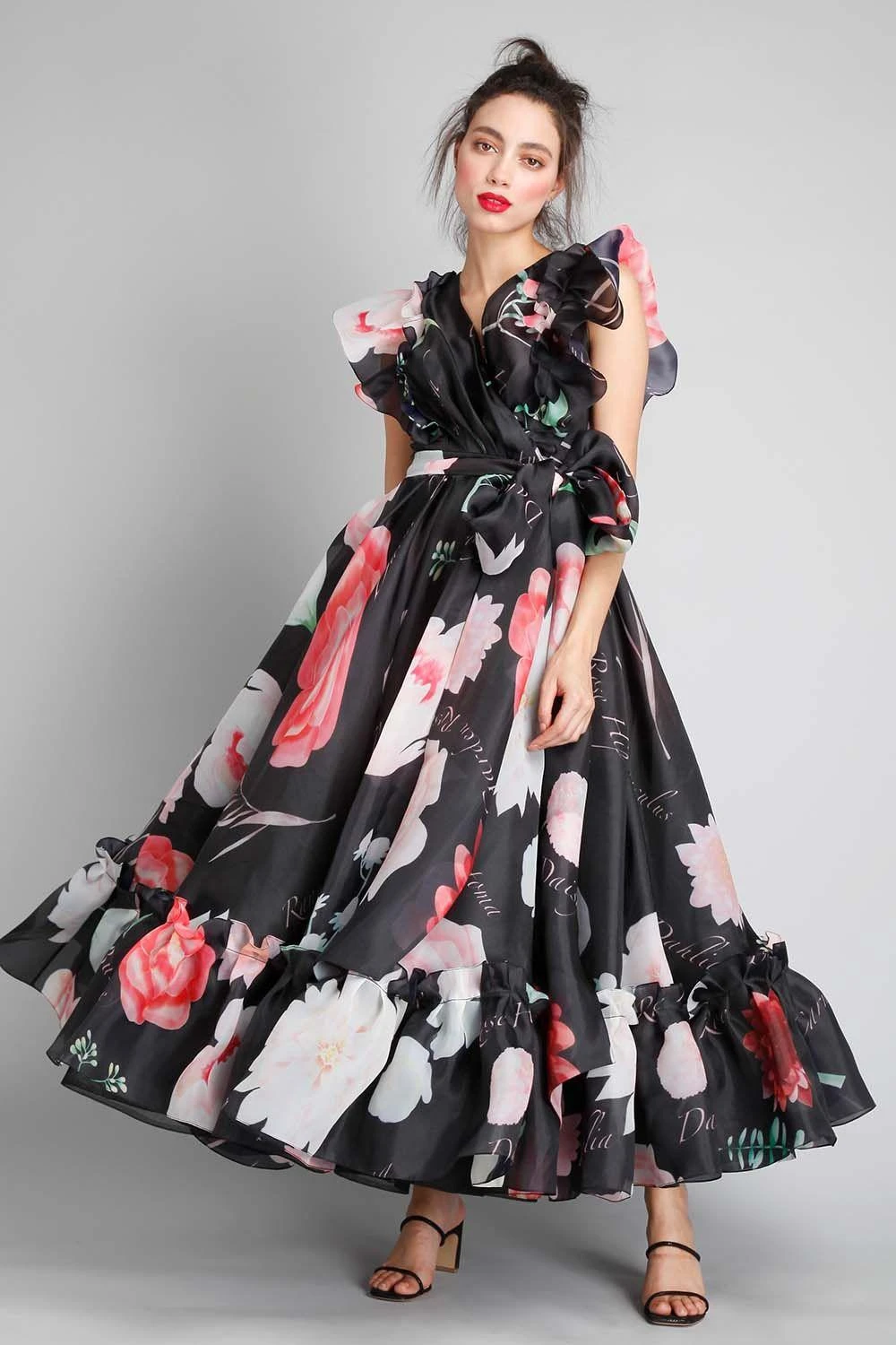 A wrap dress in a flared silhouette sounds fun right ? Ace your couture look in this gown. Exquisitely made in sheer organza, it features eclectic botanical prints. The dress is accented with ruffled sleeves and hem and a bow belt cinching the waist.