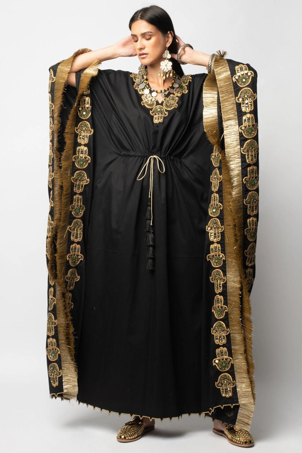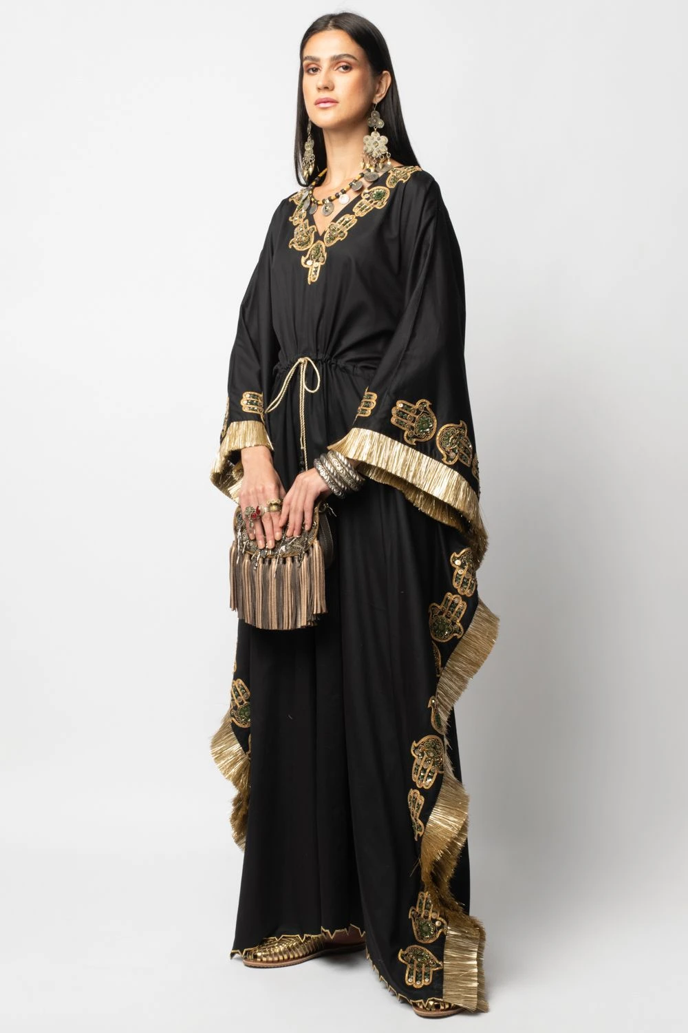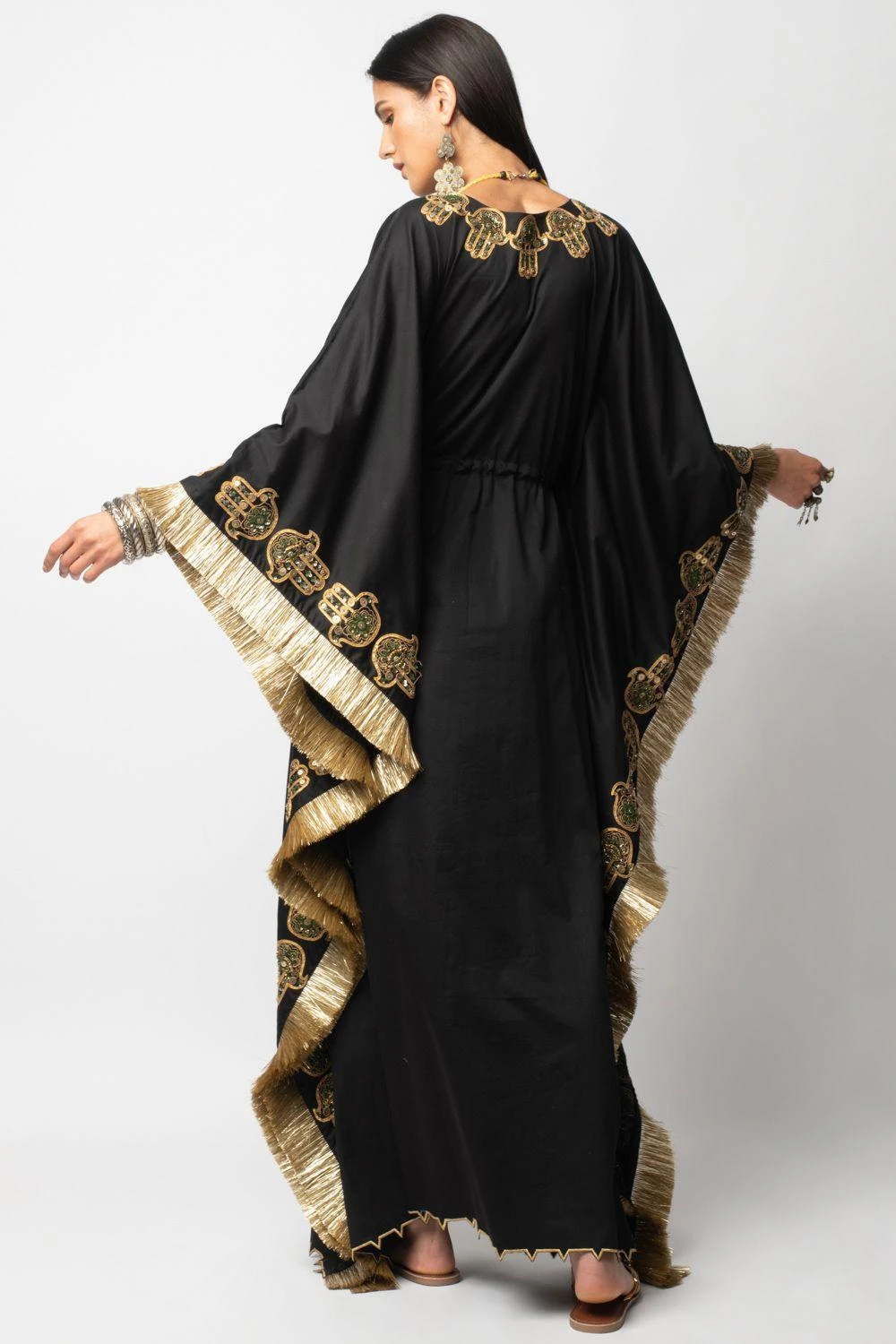 This striking black kaftan is set in a cotton satin. Adorned with gold fringed lace & hand embroidered with golden hamsa motifs in aari & dabka work. Style this statement piece for evening events with oversized studs & a clutch.