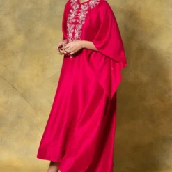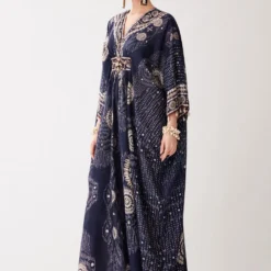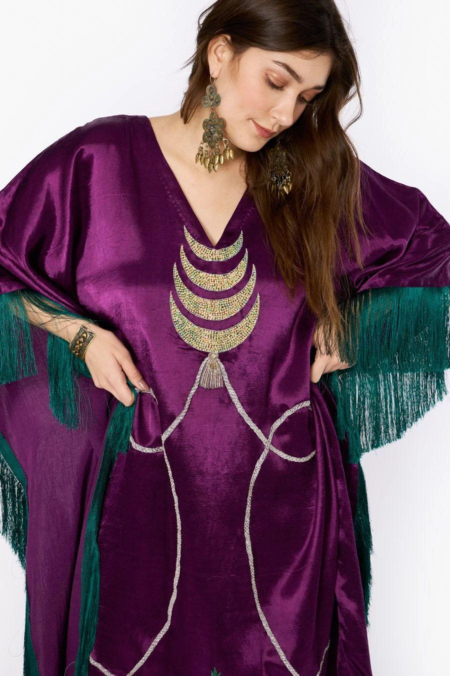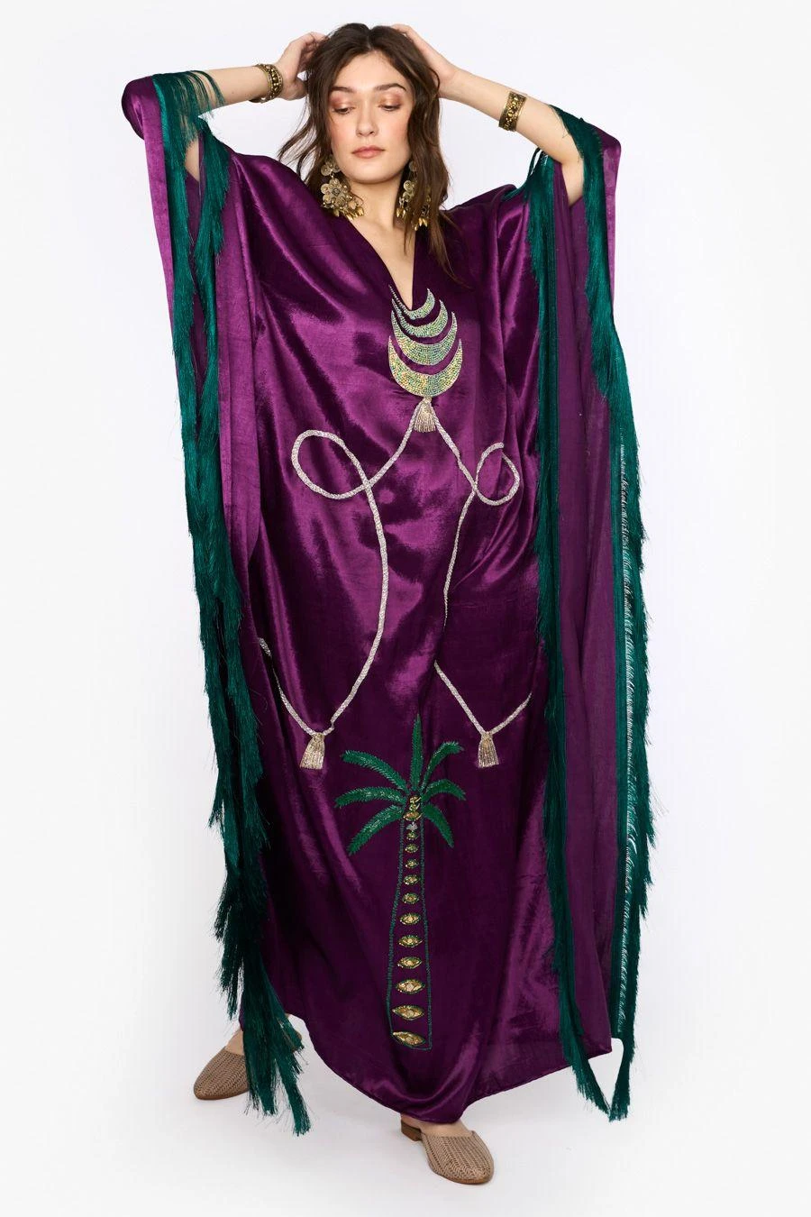 Add a layer of statement and glamour to your resort getaways with this violet kaftan. Crafted in mashru silk, this kaftan features hand done crescent moon and palm motifs with green fringed lace detail.
