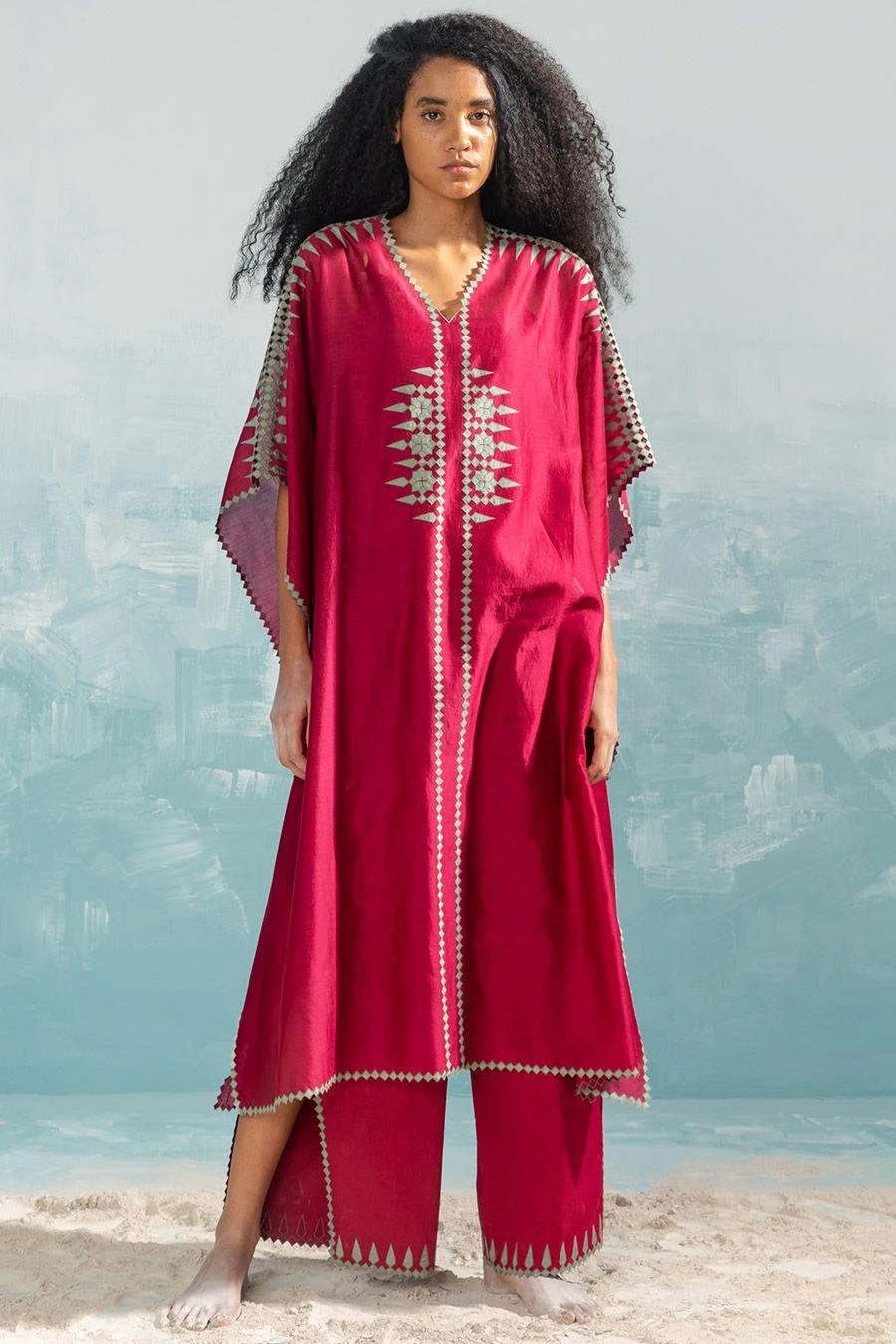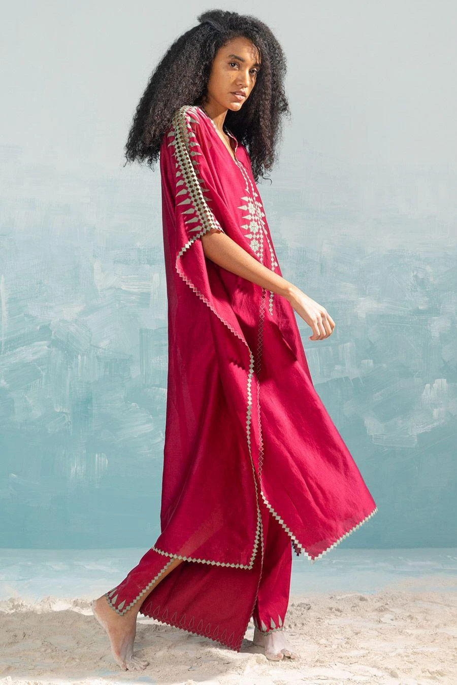 This pink cutwork kaftan falls in the realm of luxe minimalism. Crafted in cotton silk chanderi, this kurta features handcut applique & cutwork details. Style them with the Persian pink high slit cutwork pants from the collection to complete the set.