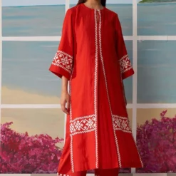 This striking red kurta is spun in thin chanderi & is appliqued with tribal artwork. This elegant ensemble is perfect for daytime spring events.