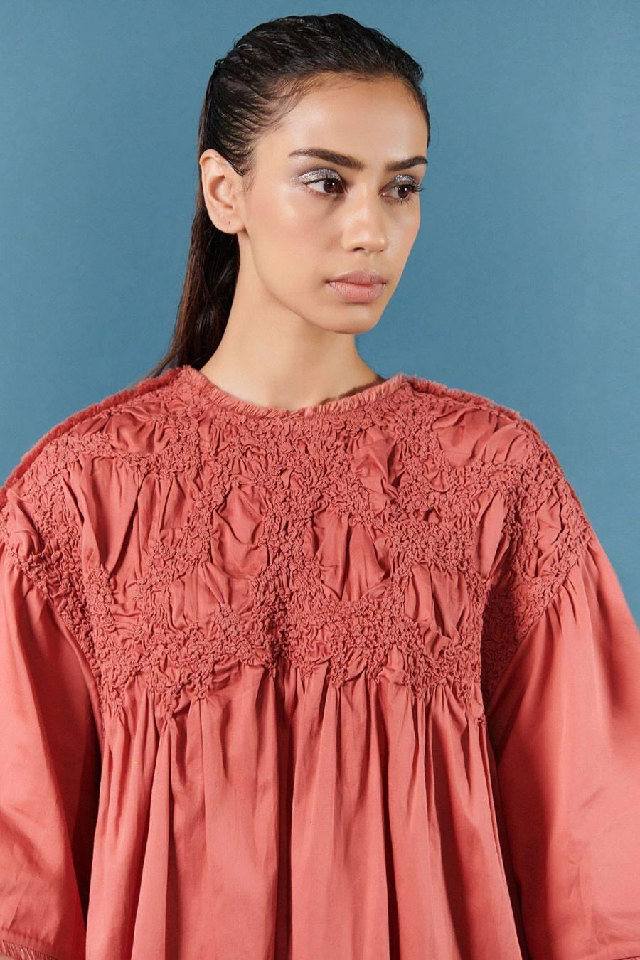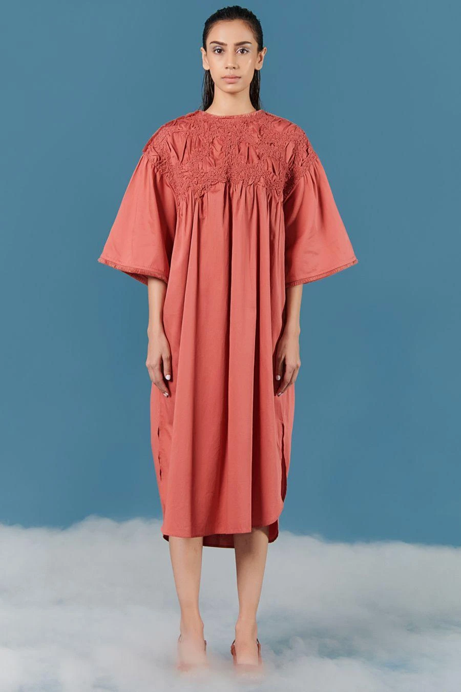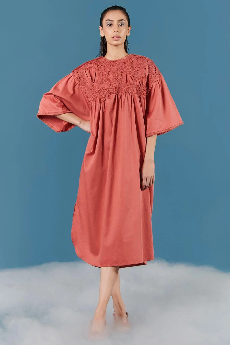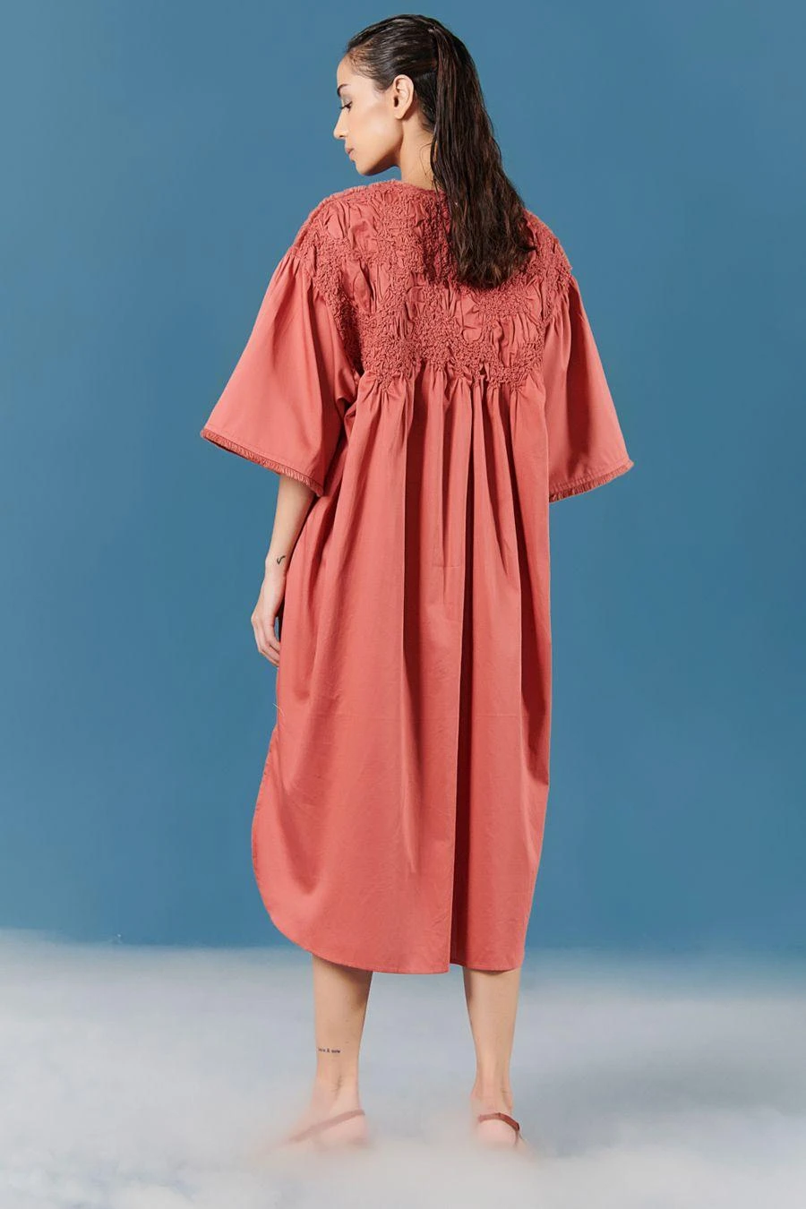 This brick dust dress set wonderfully fuses a minimal and feminine aesthetic. Crafted in cotton satin, this oversized dress features smocking details with puffy sleeves. Style it with a pair of dangler earrings to complete the look.