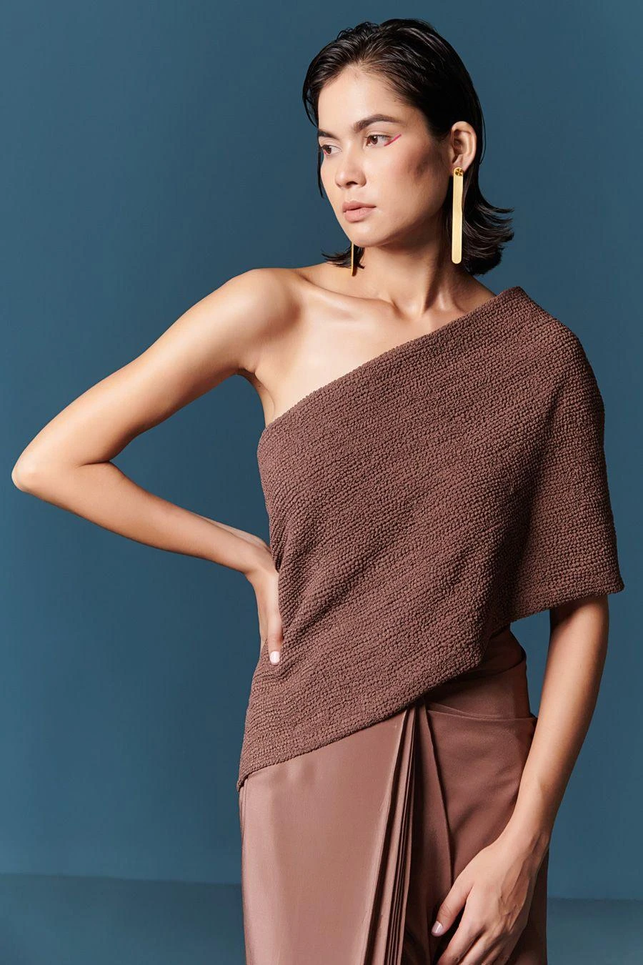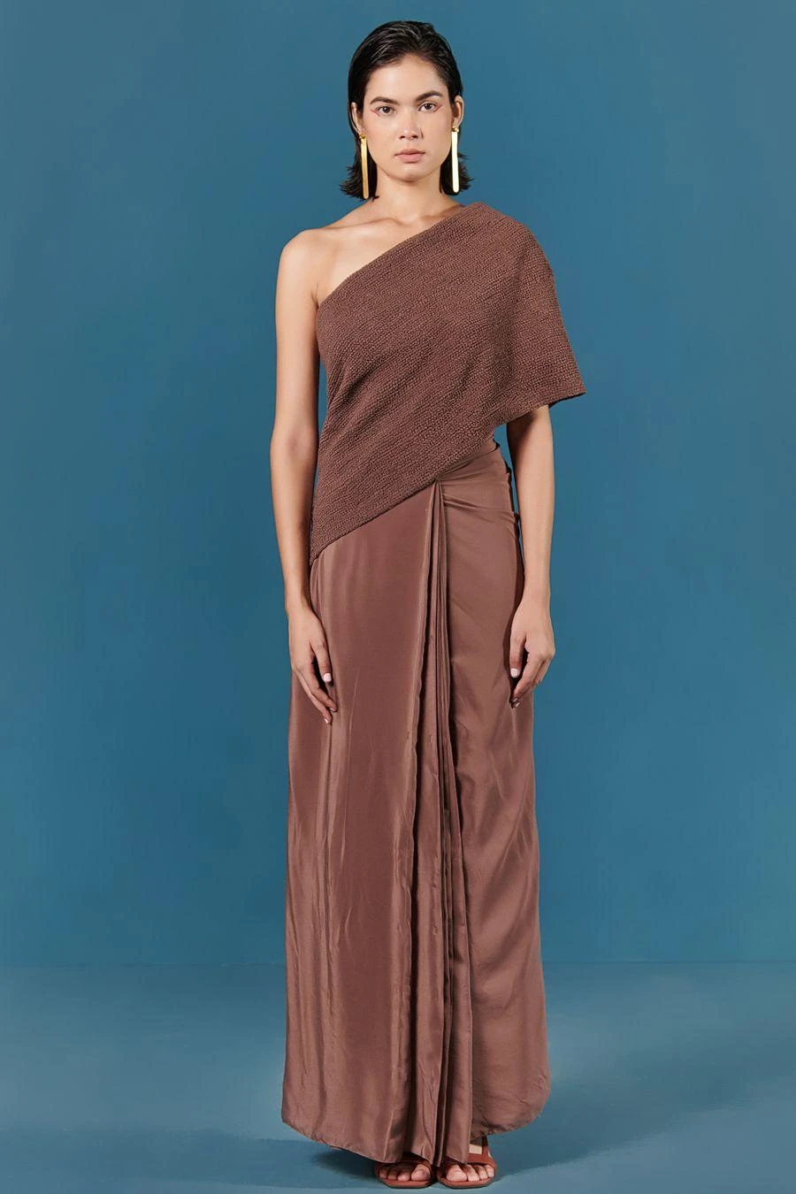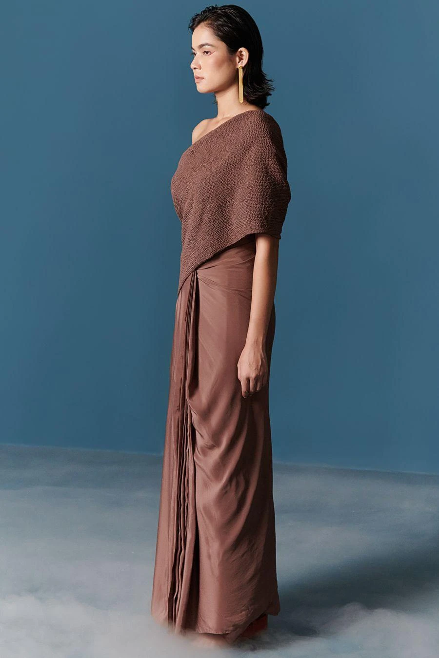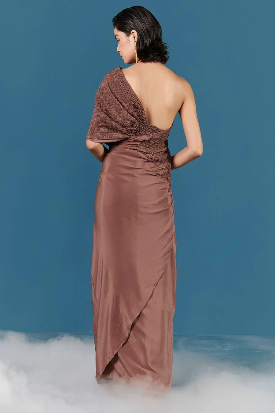 With a playful juxtaposition of texture & colour, ILK effortlessly blends tradition with modernity with this sari dress. Crafted in crepe, this draped dress features pleated details on the front. Add a pair of statement earrings to complete the look.