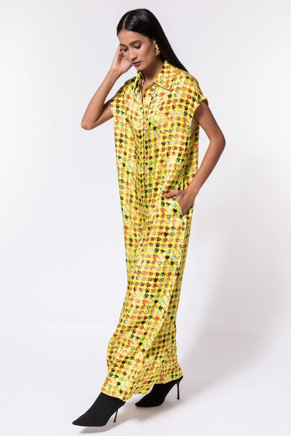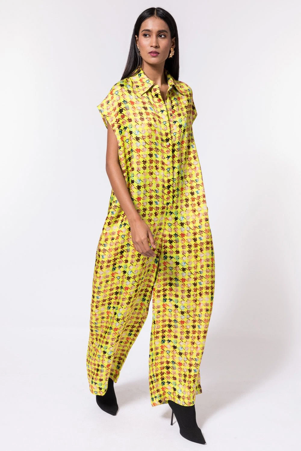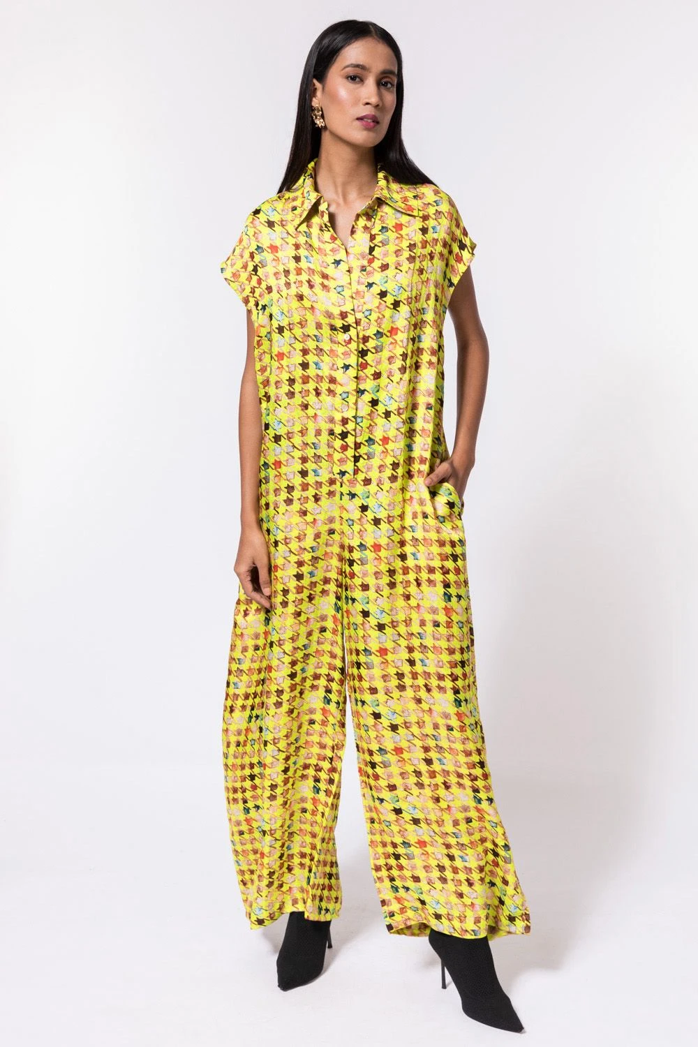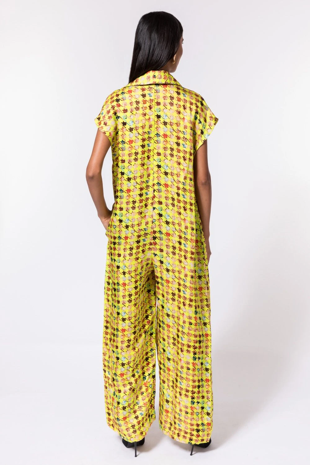 Add finesse to your everyday closet with this eclectic houndstooth print jumpsuit. It is cut in a premium linen satin with a front placket & side pockets. Style this look with a pair of chic hoops.