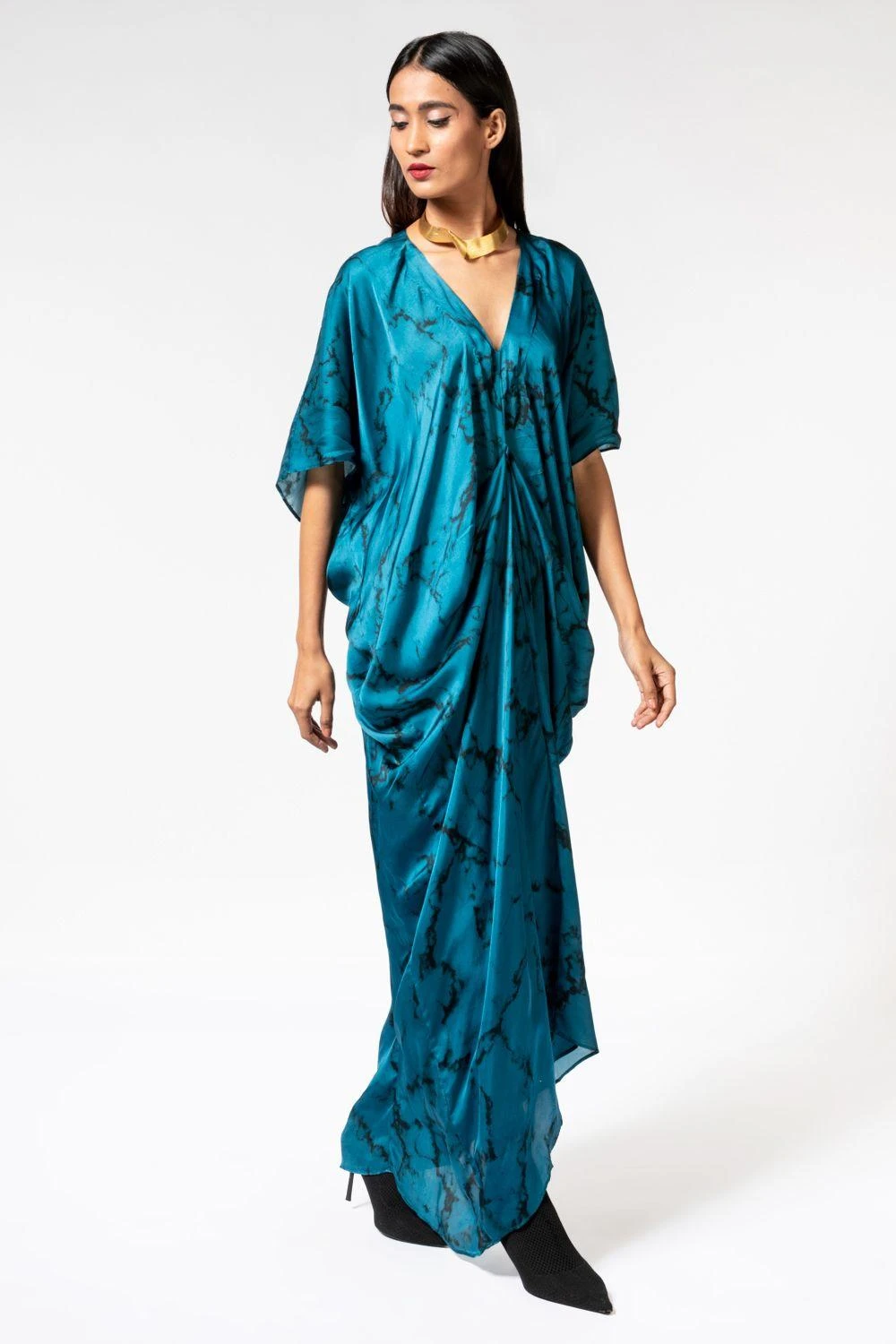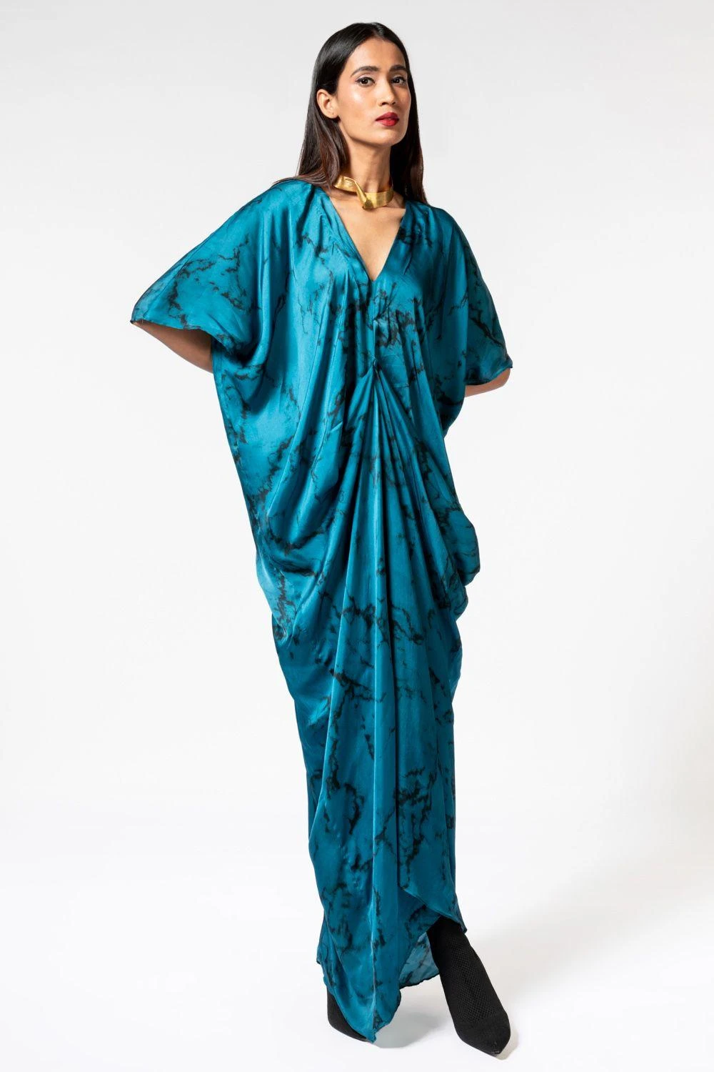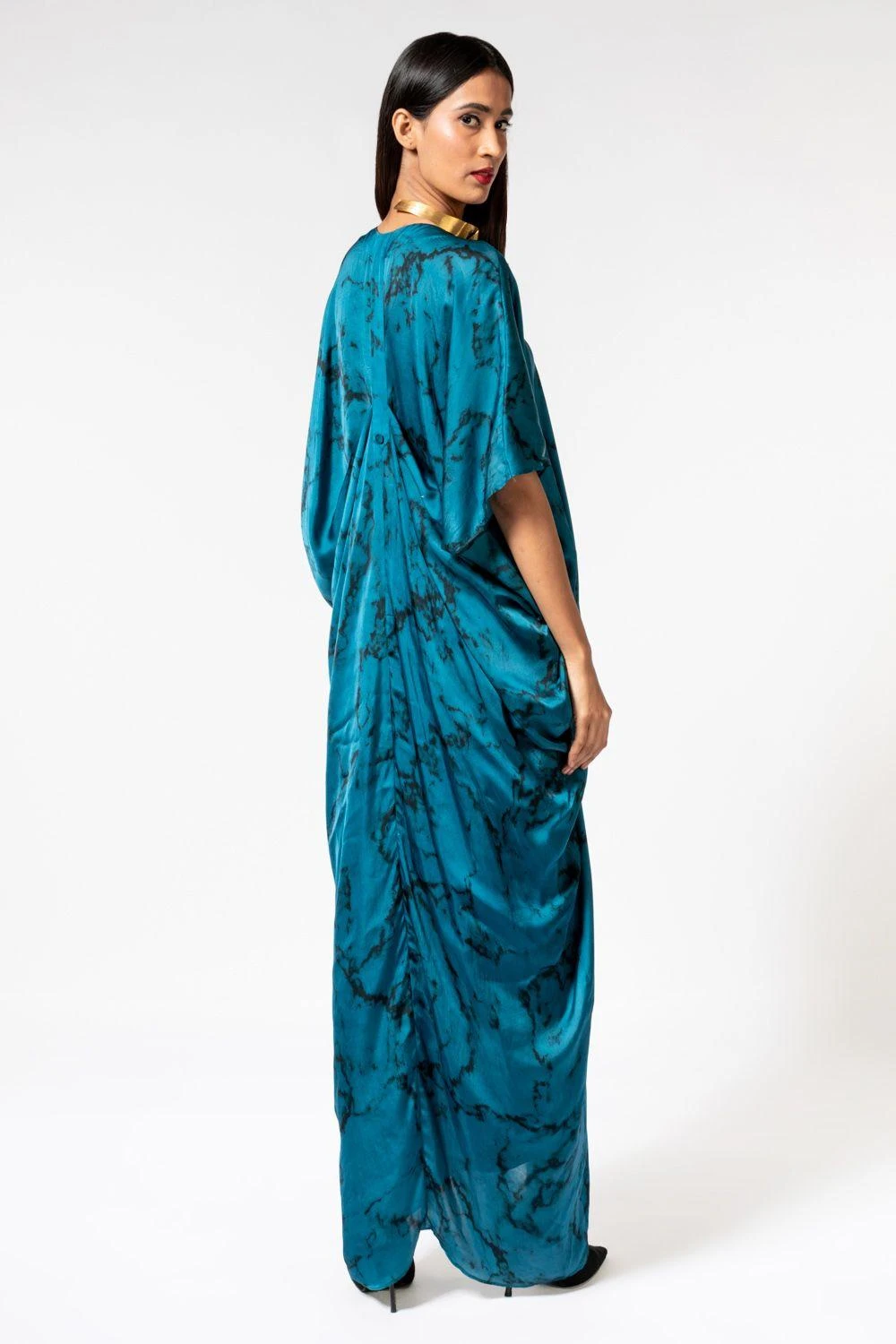 This blue marble print kaftan will keep you stylish yet comfortable from day to evening at your holidays. It is cut in premium bemberg with fine drape details in the front. You can style it with a chic choker to elevate your look.