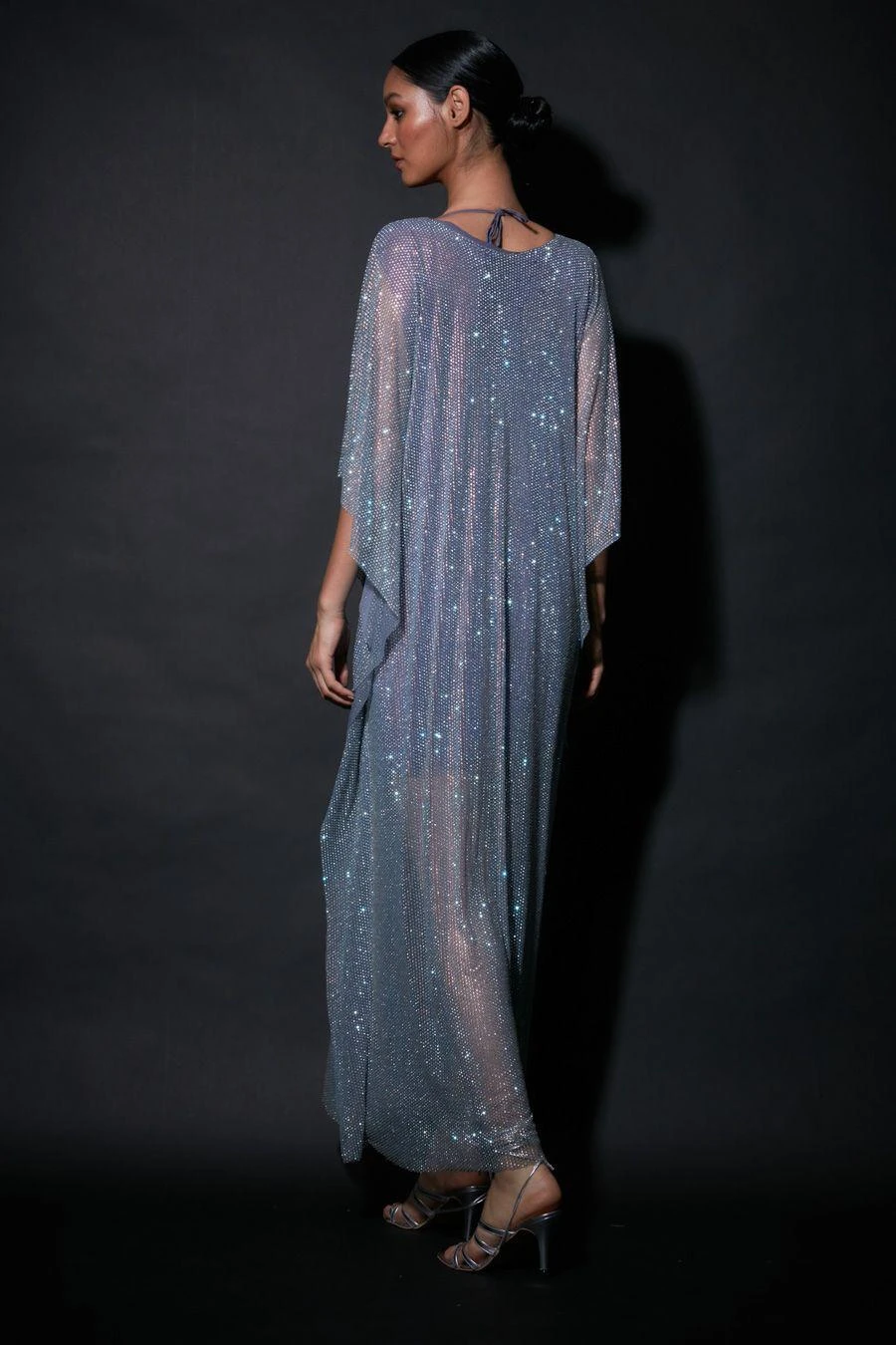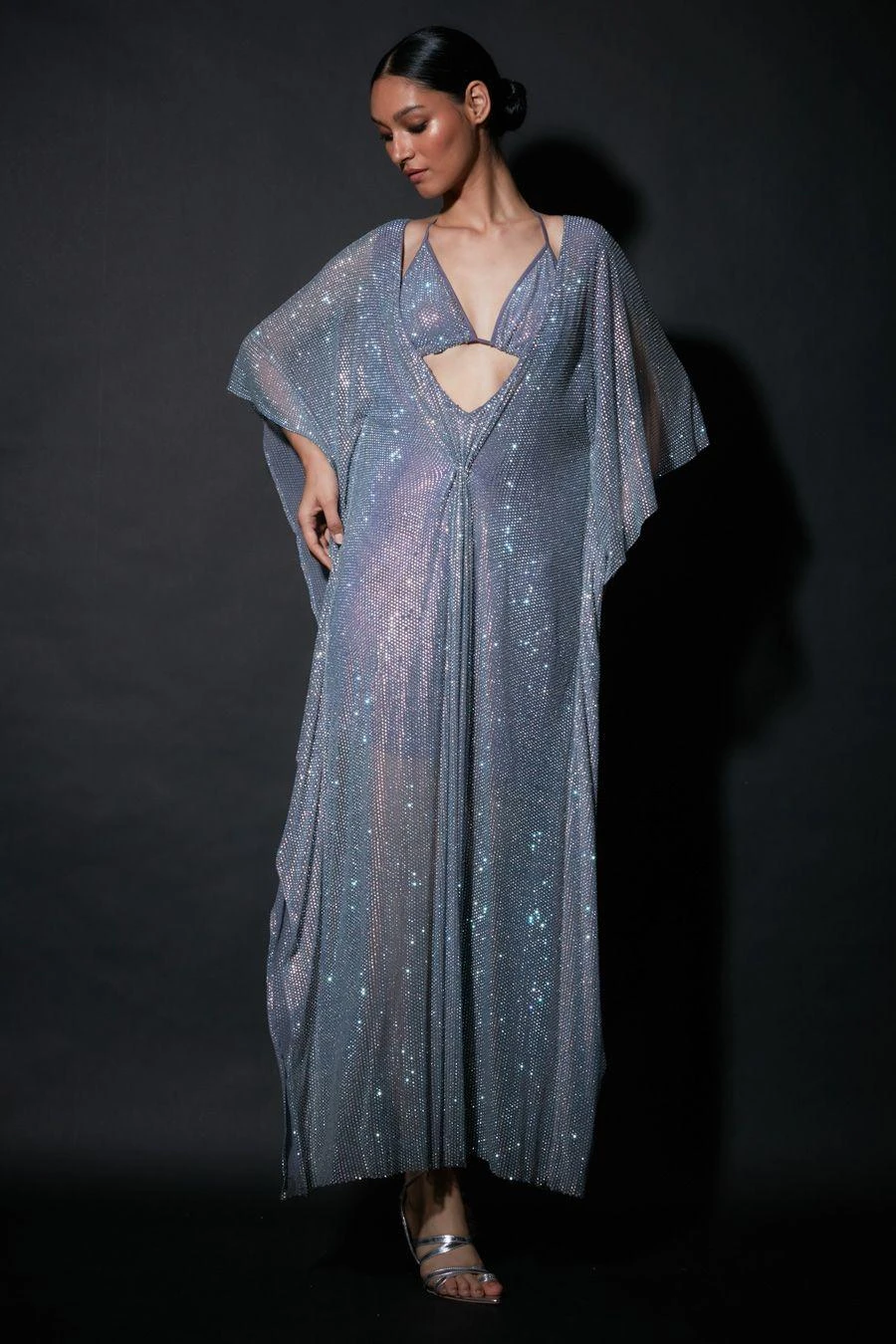 If you’re looking for a head-turning statement-making kaftan that isn’t too heavy, this is the dress for you. Crafted in net, this sheer V-neck kaftan features crystal embellished details & is paired with a bralette.
