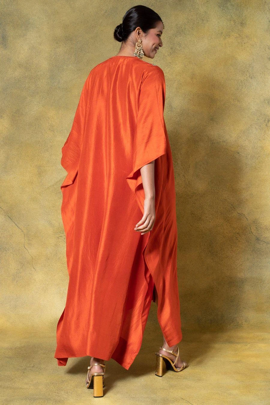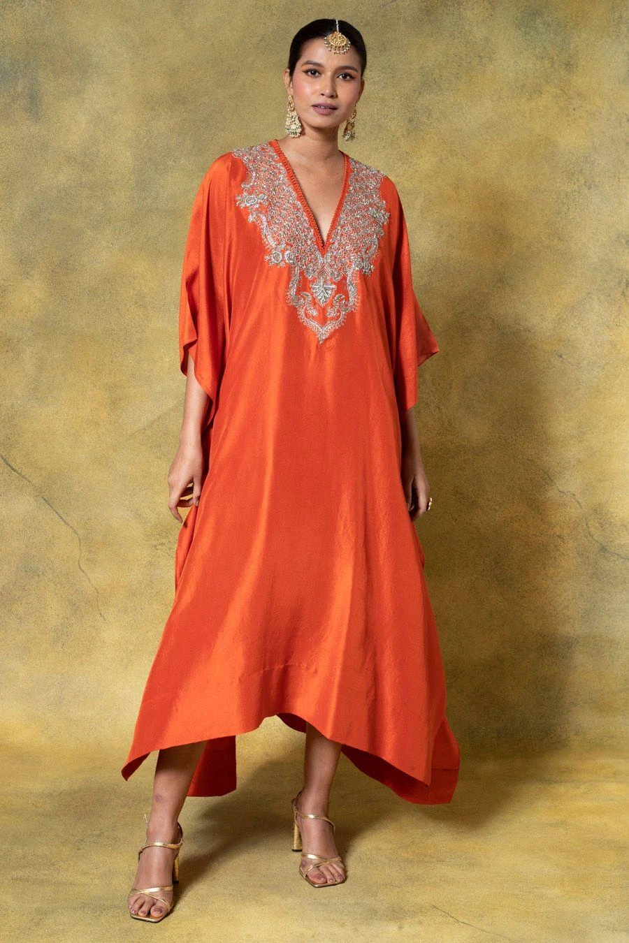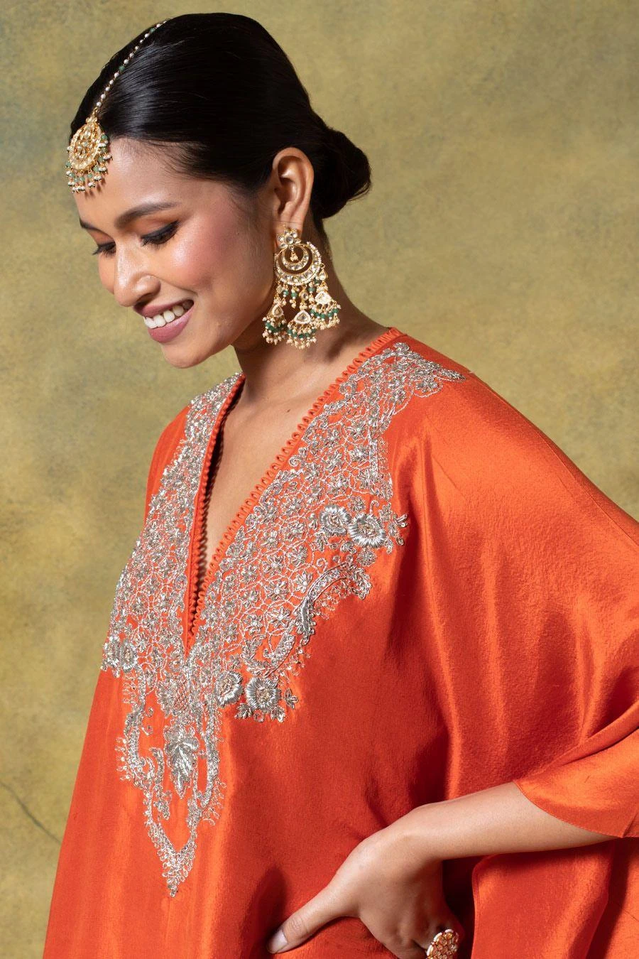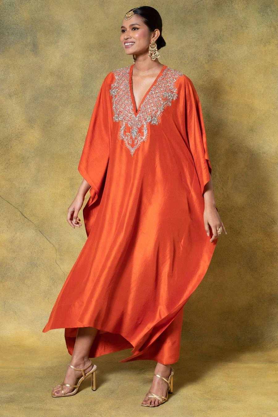 A true masterpiece of artisanal craftsmanship, this kaftan is a celebration of the ancient art of zardosi embroidery, where gleaming gold threads are meticulously woven into sumptuous fabrics.