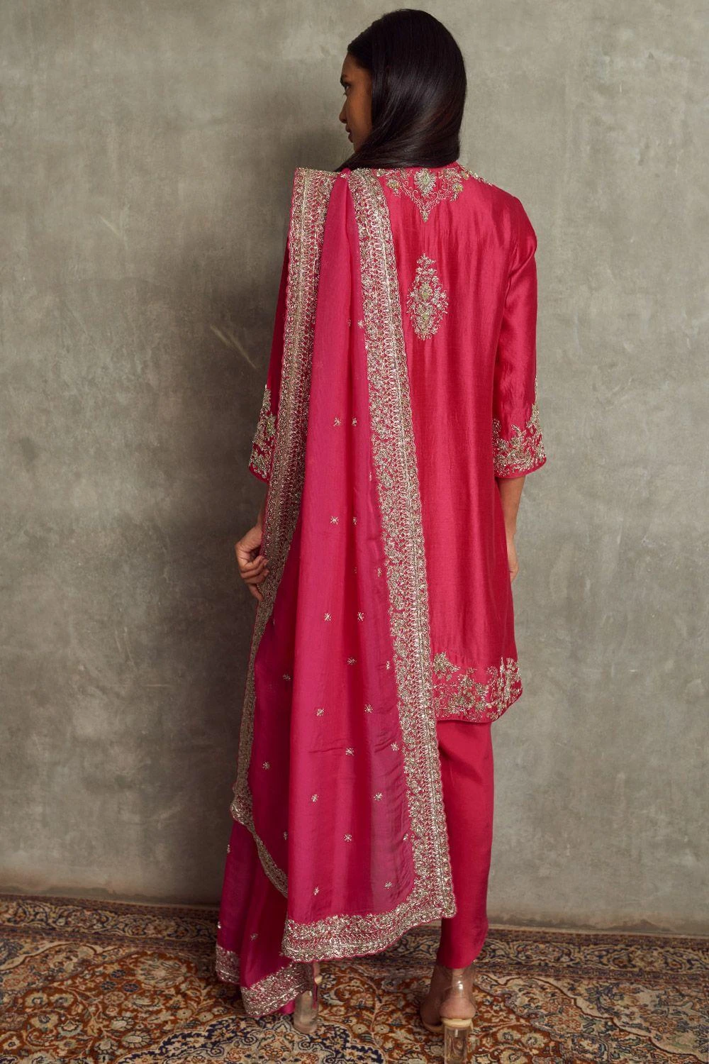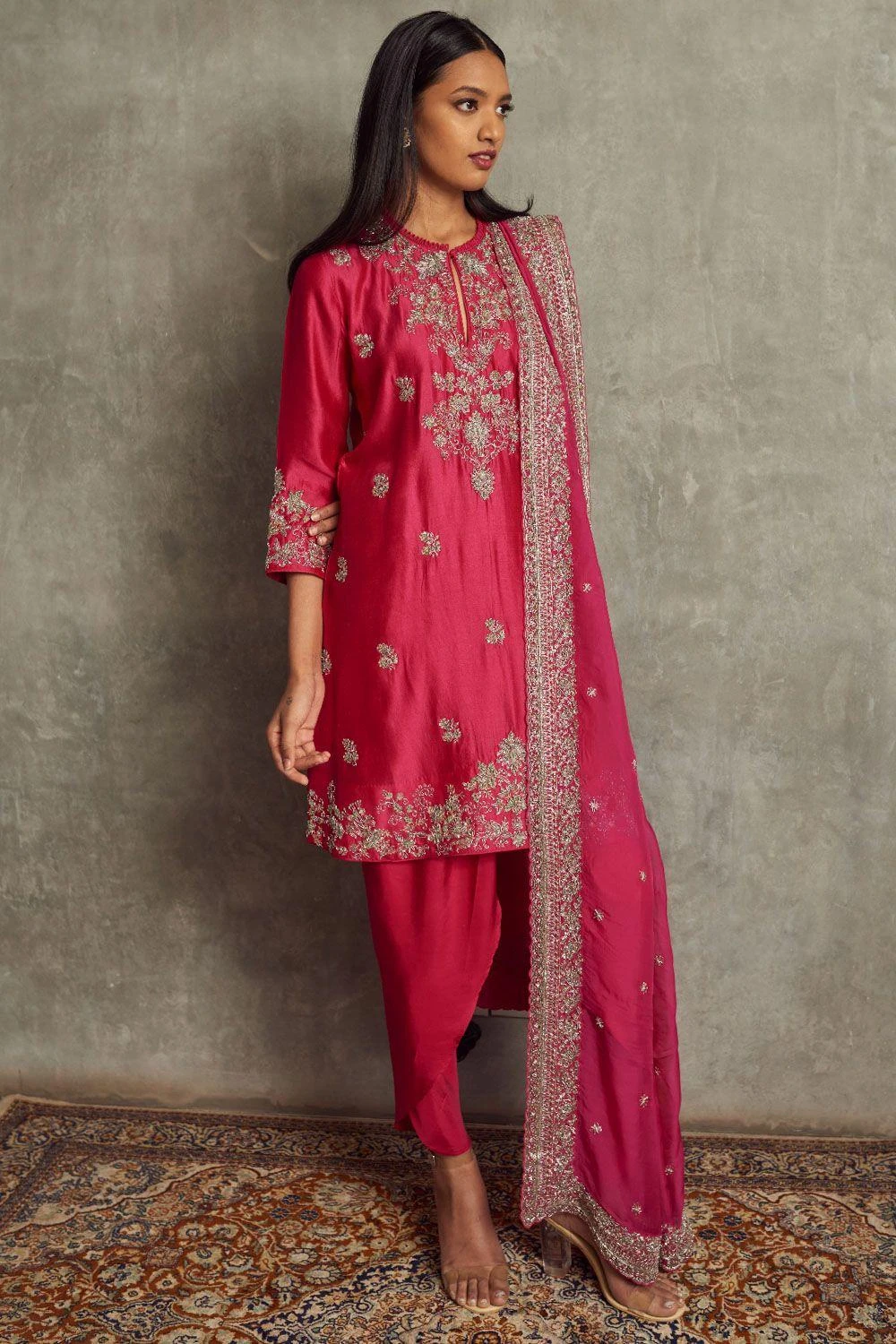 This kurta set will see you through all kinds of festivities. Crafted in cheniya silk, this set features a zardosi embroidered kurta paired with dhoti pants & dupatta. Style it with a pair of polki earrings & a potli bag to complete the look.