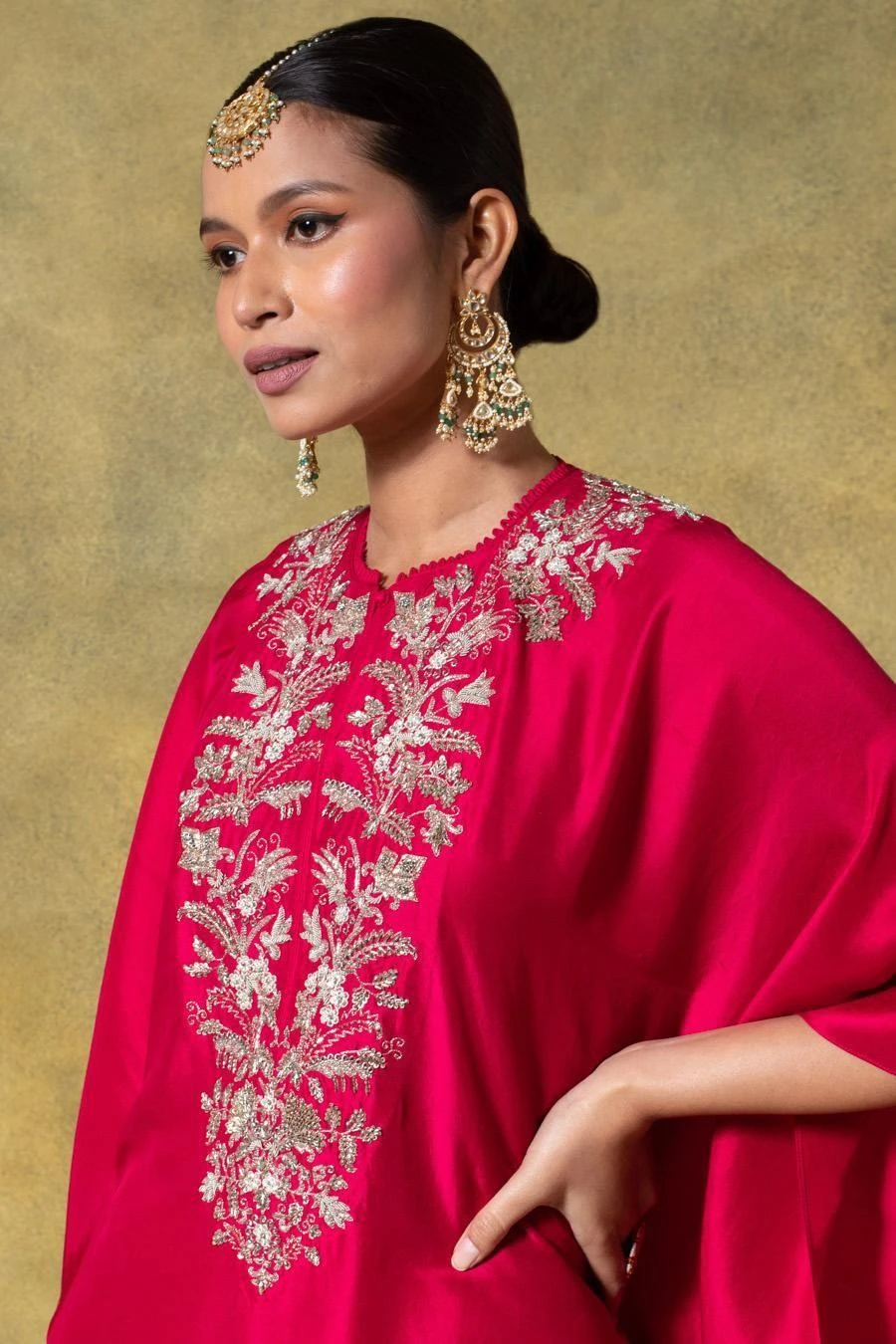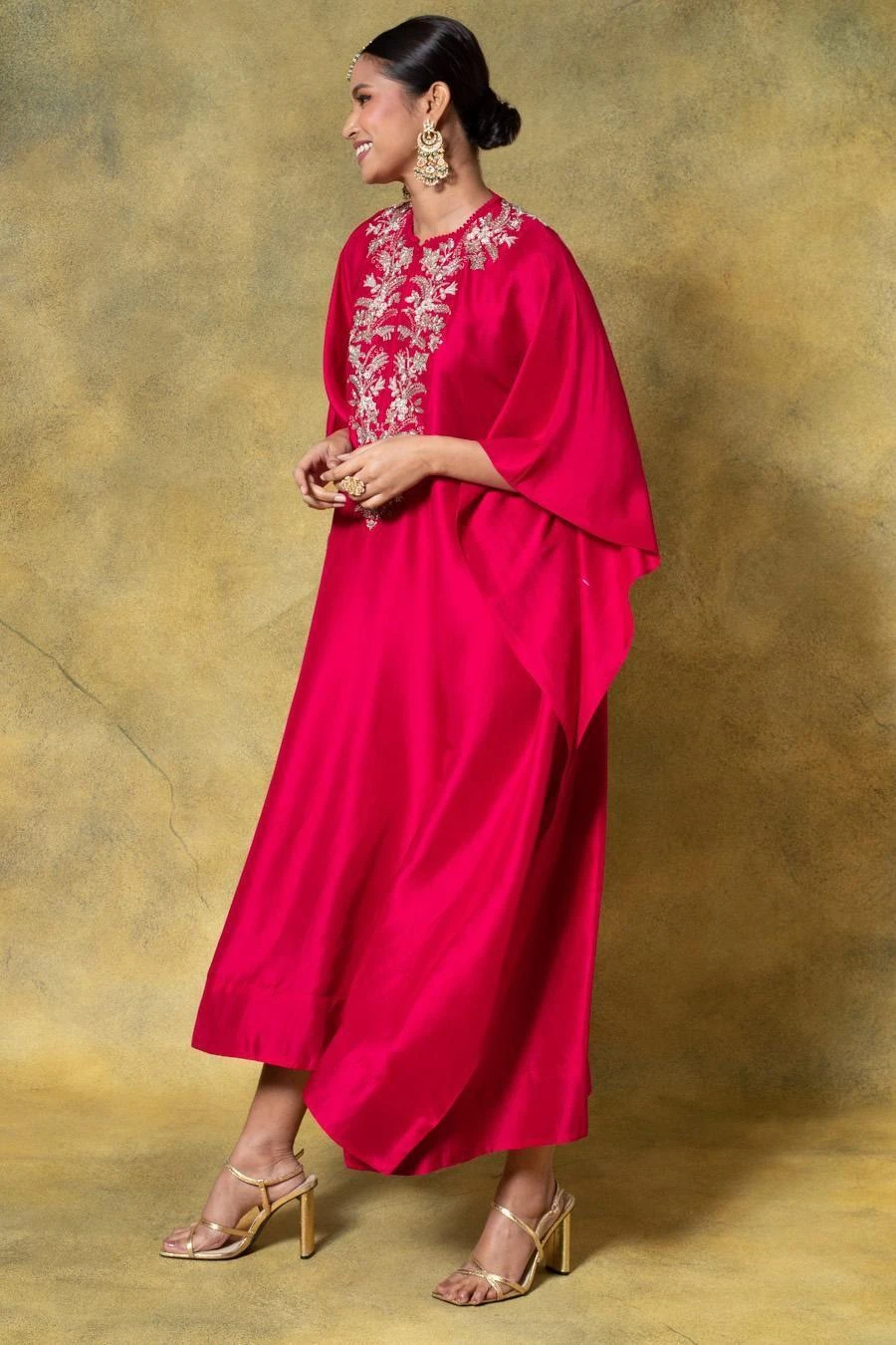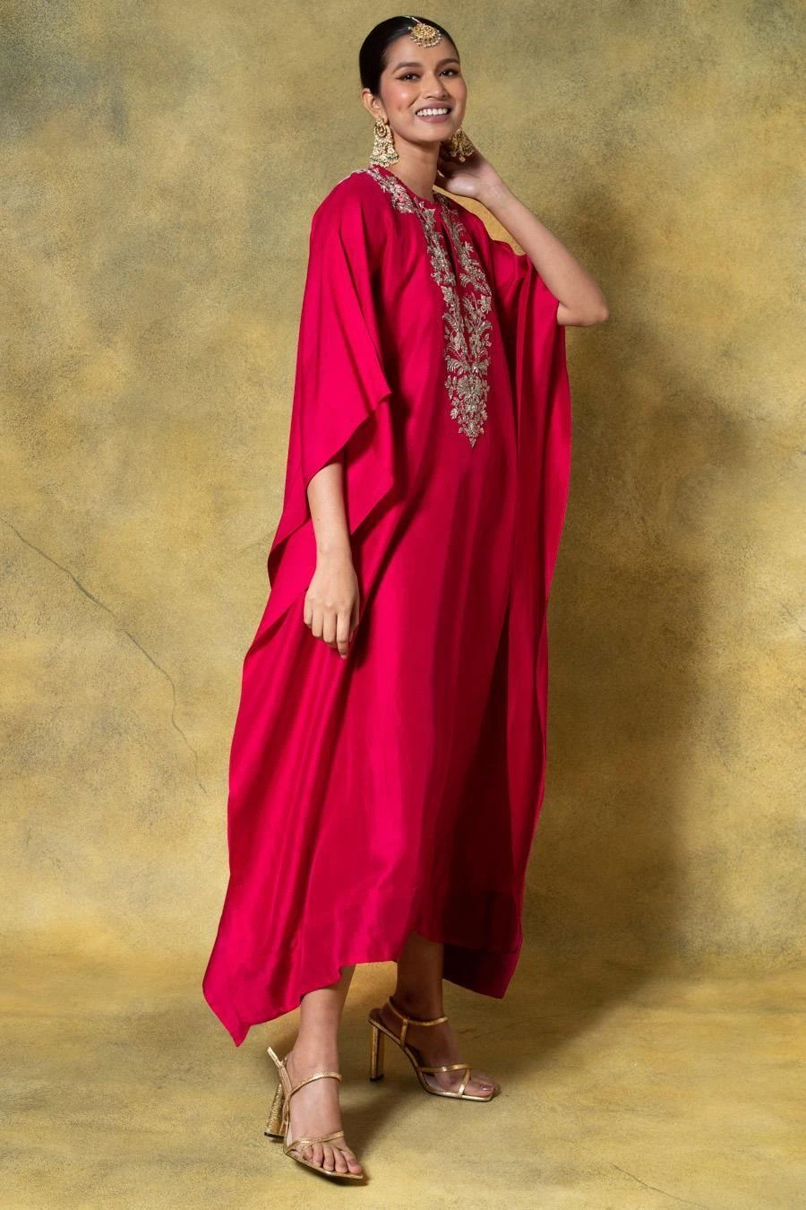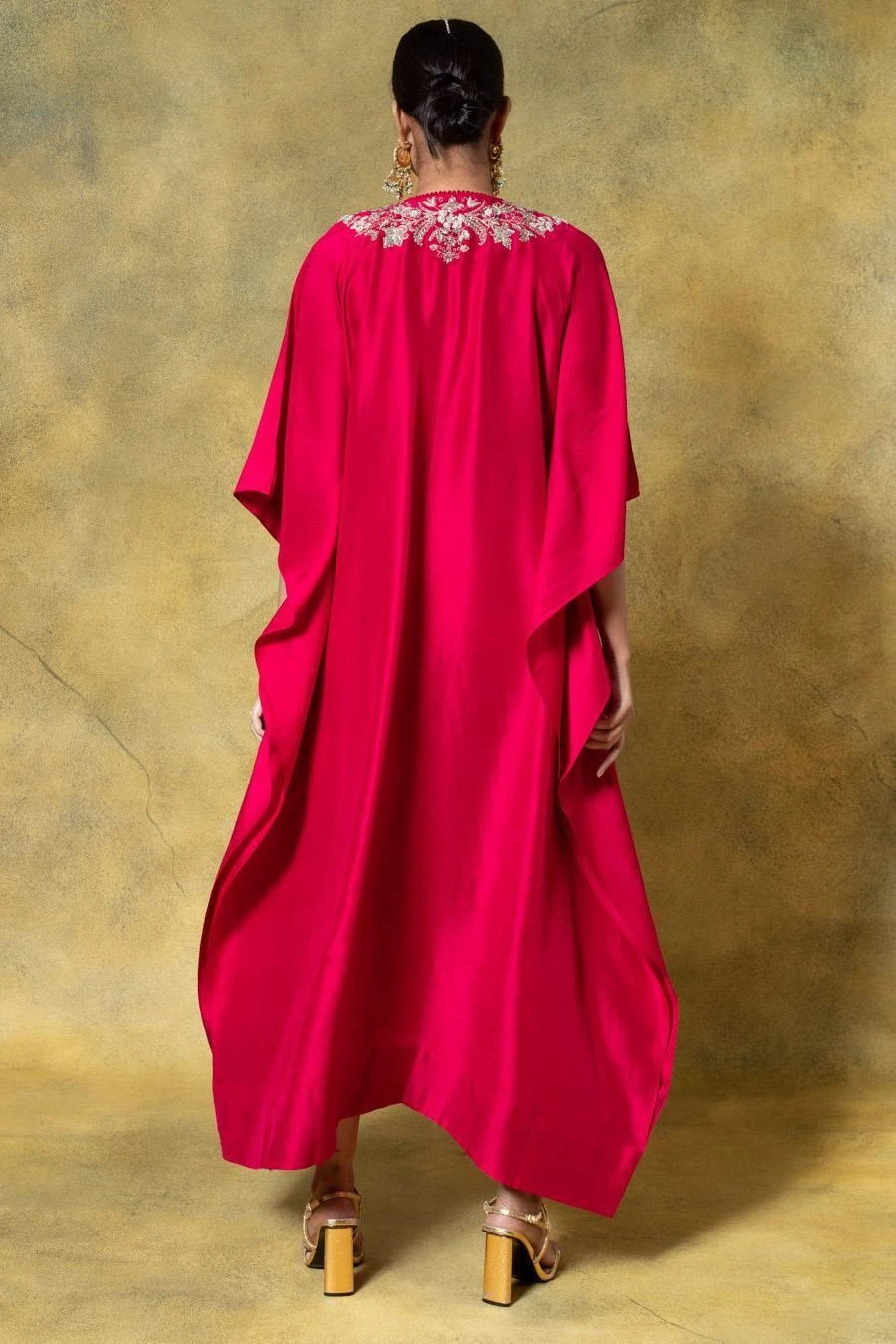 A true masterpiece of artisanal craftsmanship, this kaftan is a celebration of the ancient art of zardosi embroidery, where gleaming gold threads are meticulously woven into sumptuous fabrics.