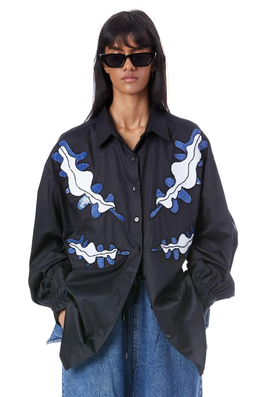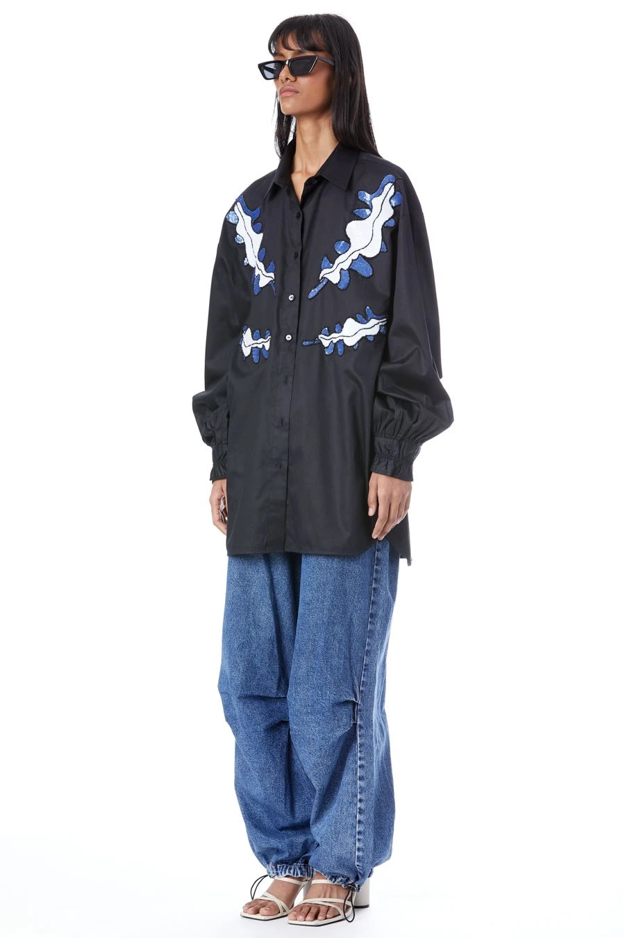 Look sartorially savvy with this black shirt. Crafted in cotton, this collared buttoned down shirt features hand embellished details. Pair this shirt with blue denims to complete the set.