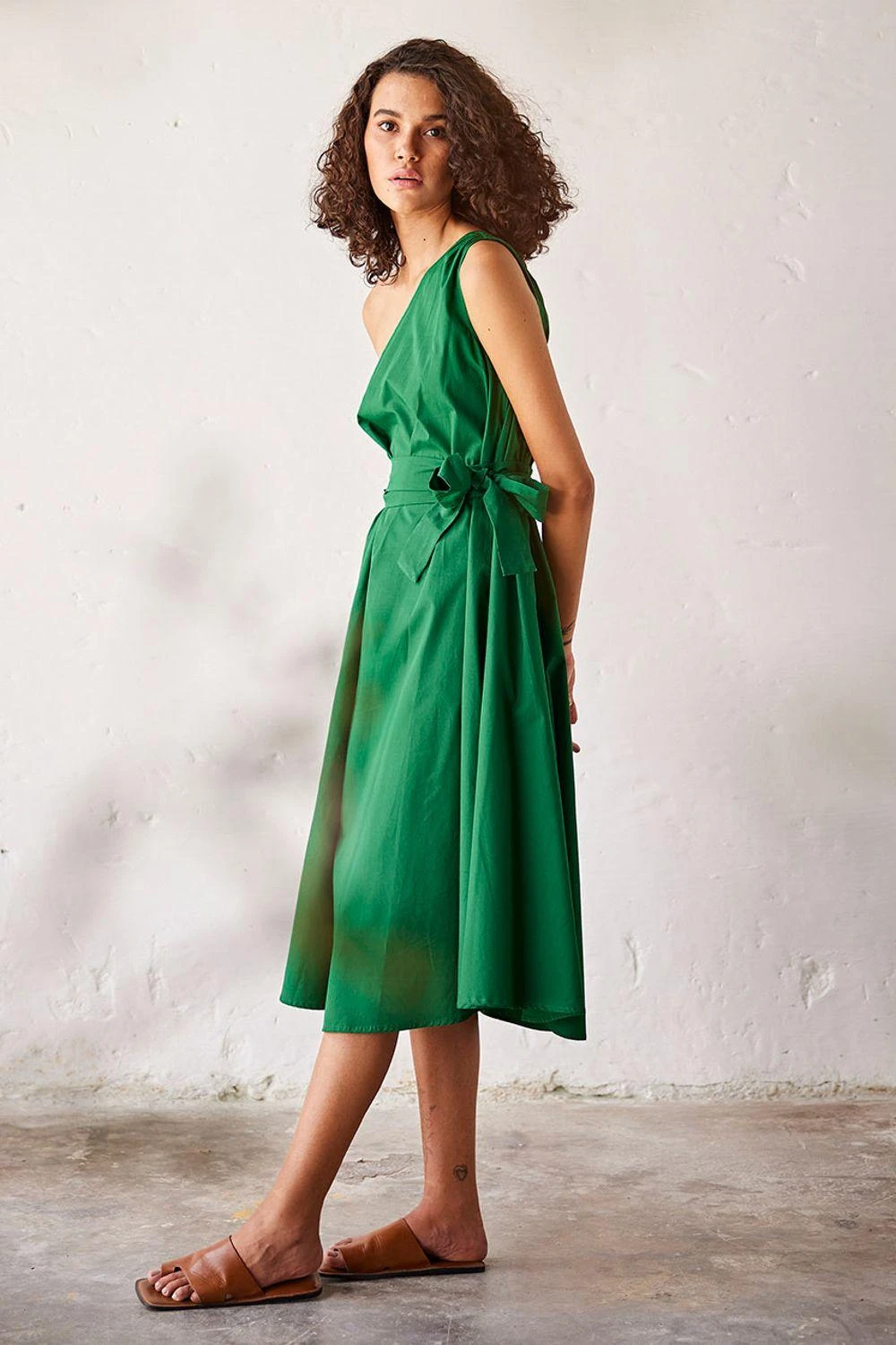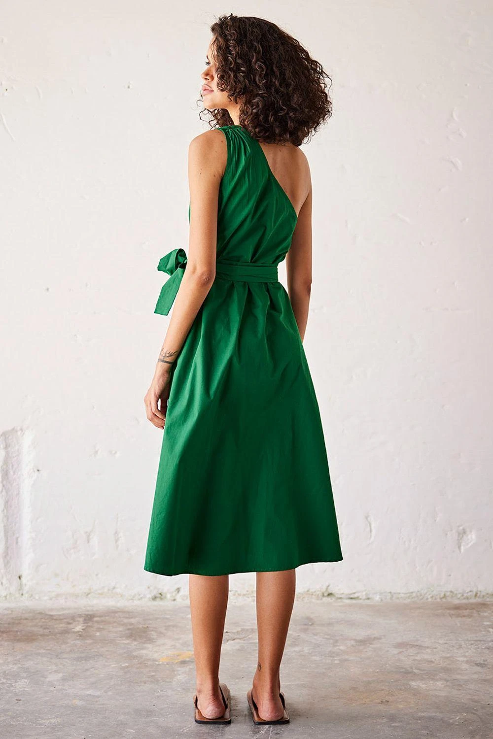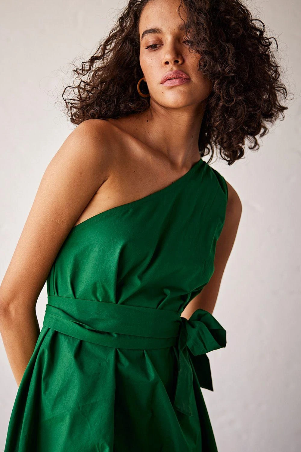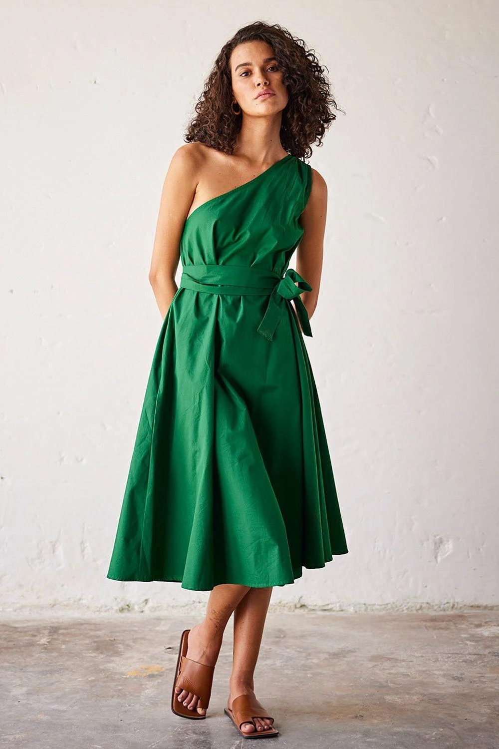 Elevate your style with this dark green poplin one-shoulder dress, accompanied by a fabric belt for a touch of sophistication and effortless elegance.
