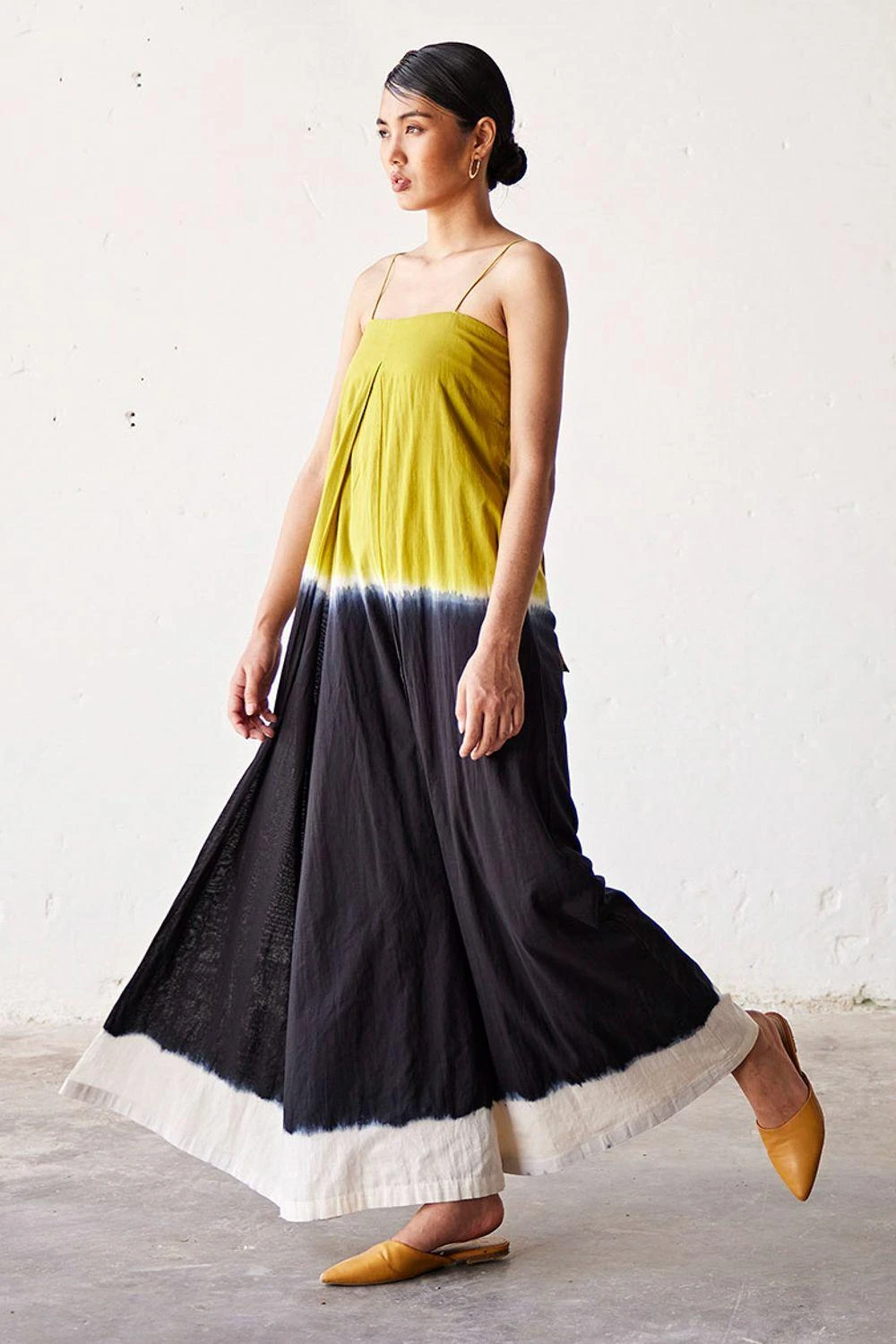 Elevate your style with this stunning lime-green, black, and white ombre jumpsuit. Featuring exquisite front pleat detailing, a chic zipper back opening, and a charming tie-up at the back for a touch of sophistication.