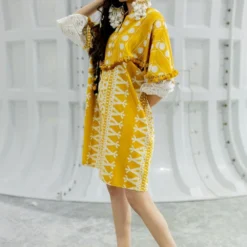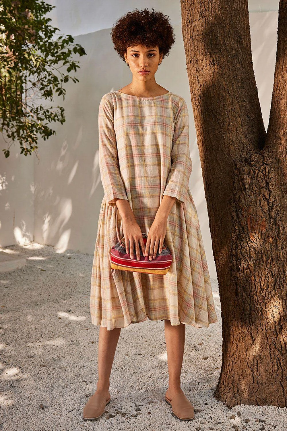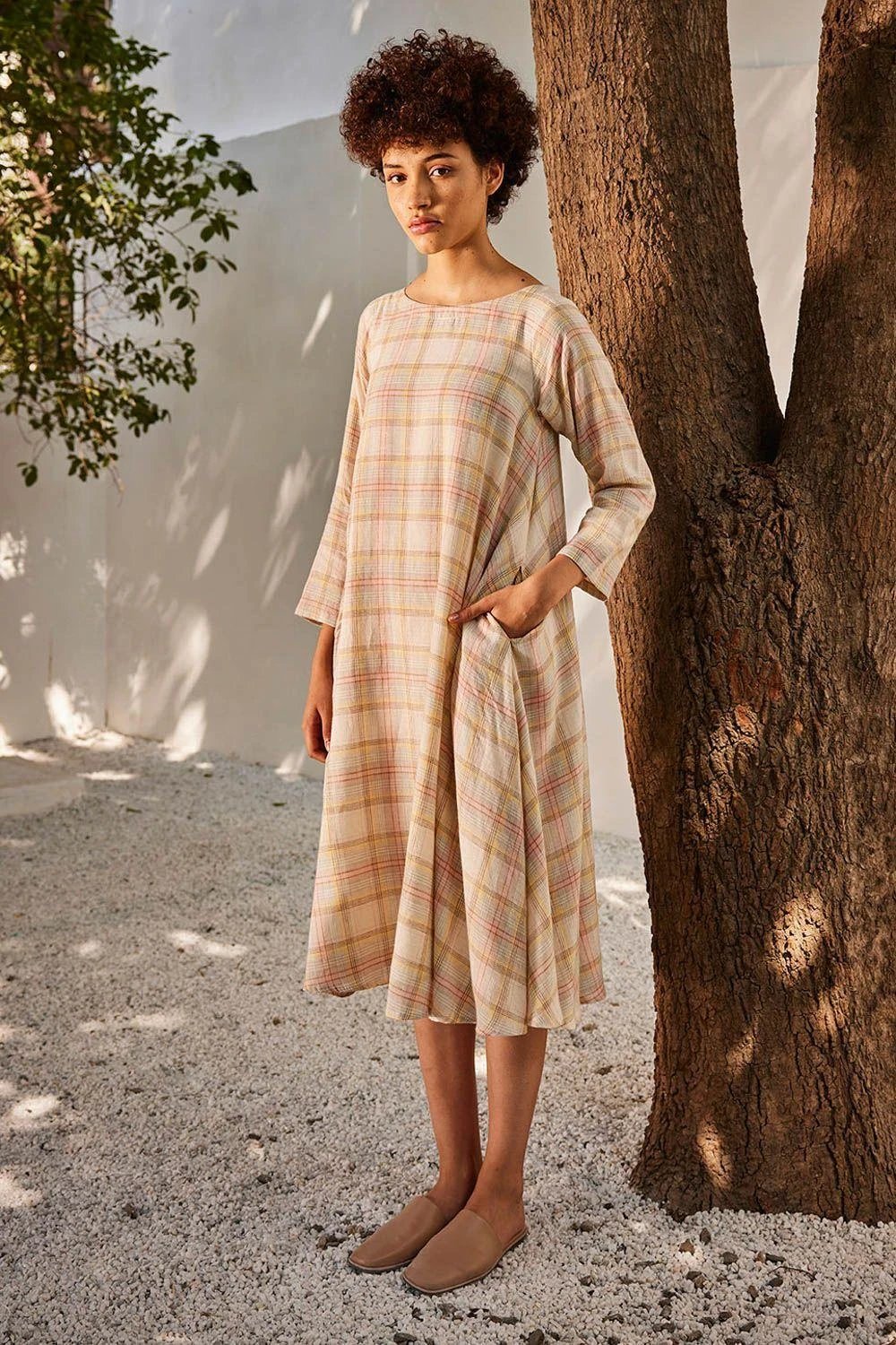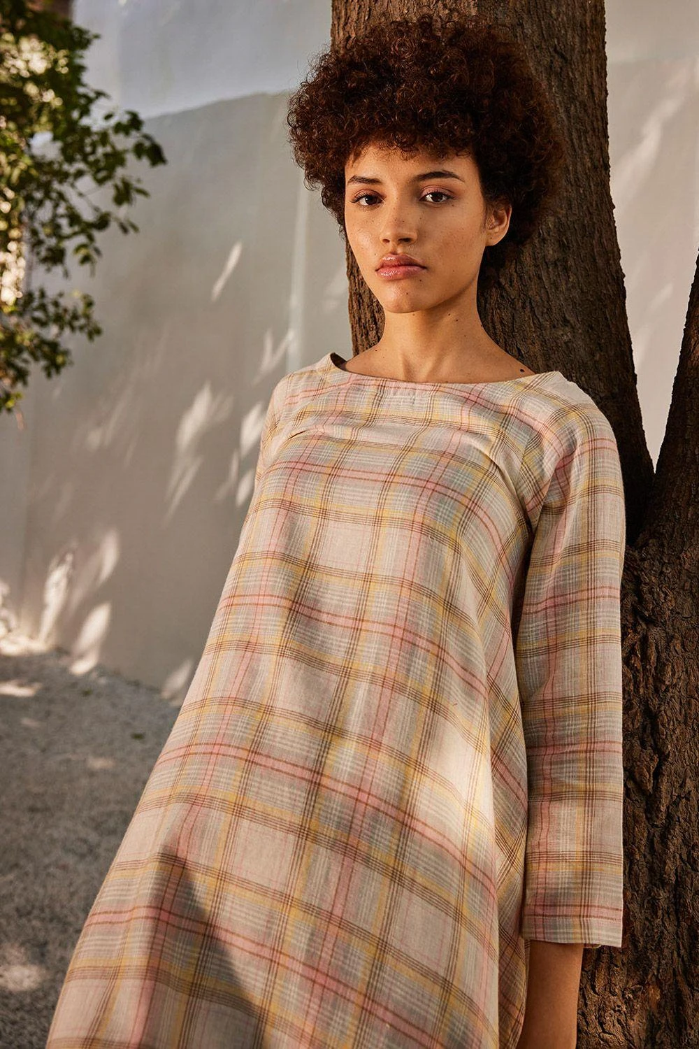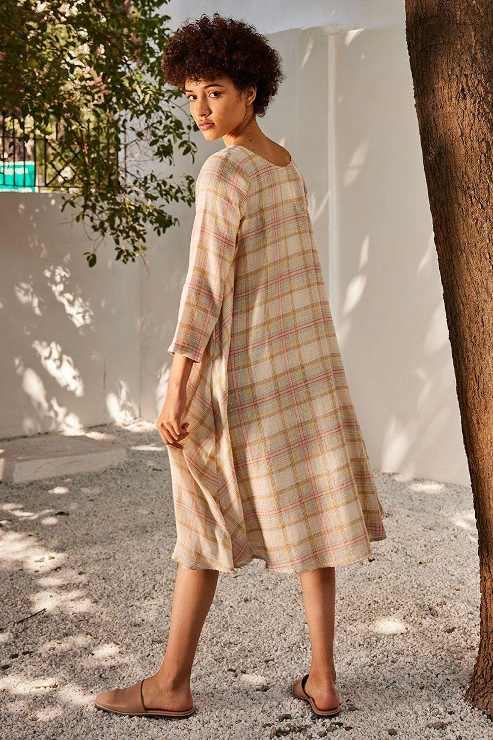 Radiate elegance in this multi-coloured linen check dress. The side tie-up gather detail and 3/4 sleeves add a touch of sophistication to your style.